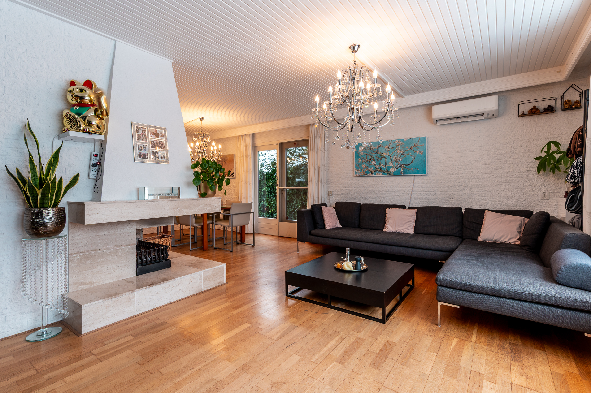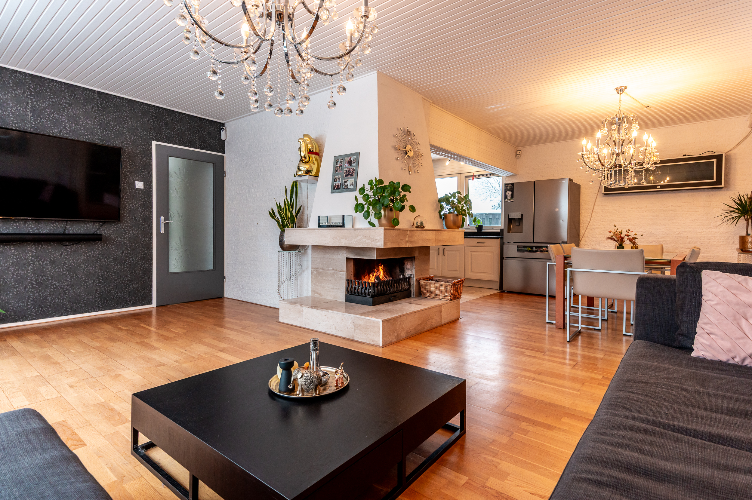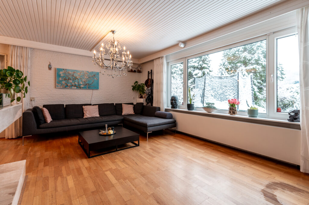 De woonkamer is heerlijk licht dankzij de vele raampartijen en beschikt over een sfeervolle open haard met natuurstenen afwerking en een warme houten vloer. Het grote raam aan de voorzijde is uitgevoerd in onderhoudsvriendelijk kunststof.