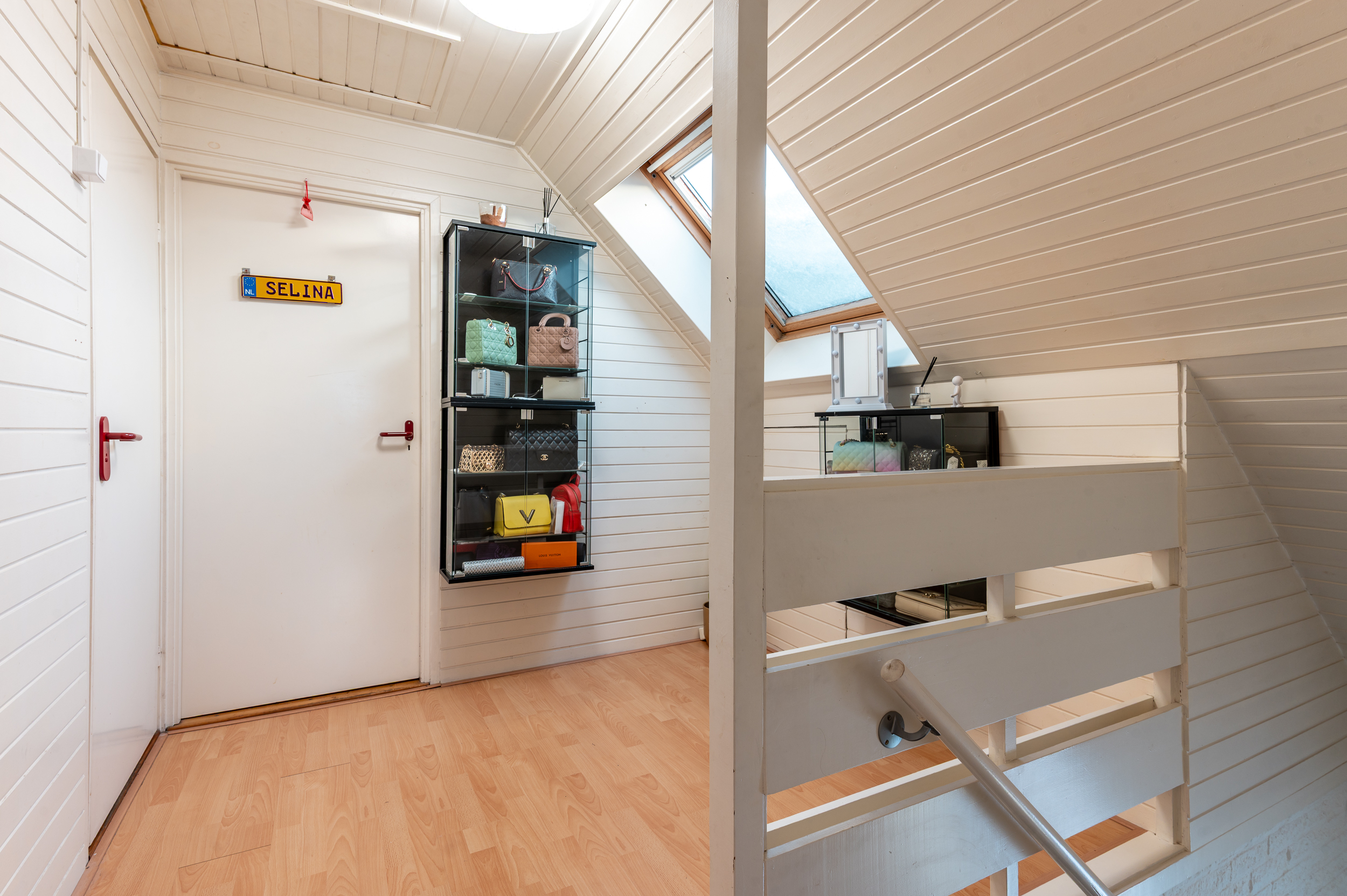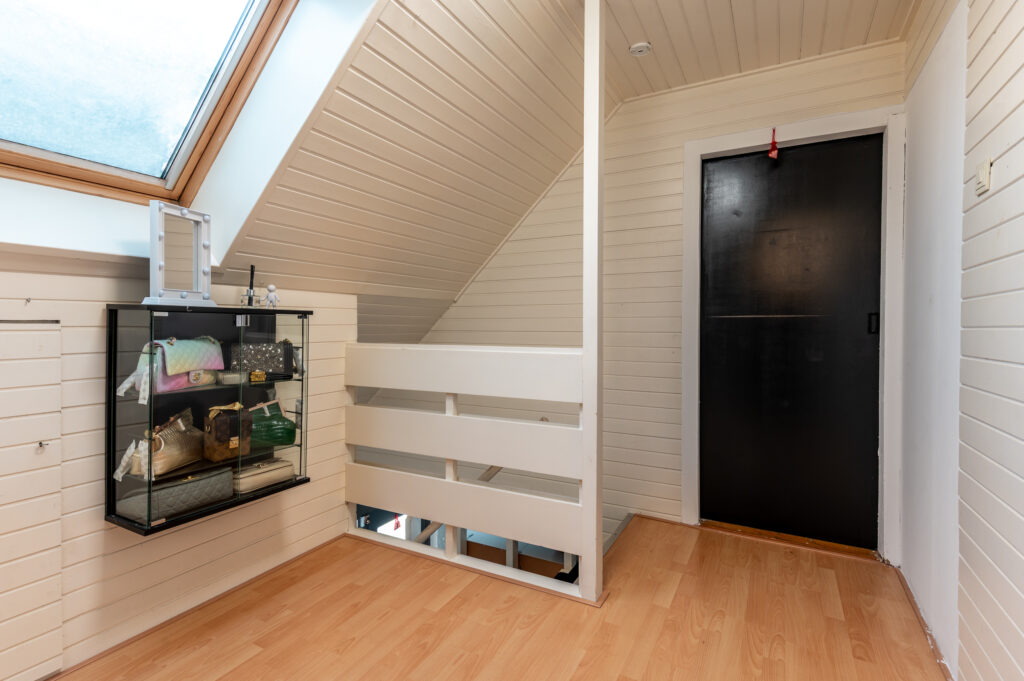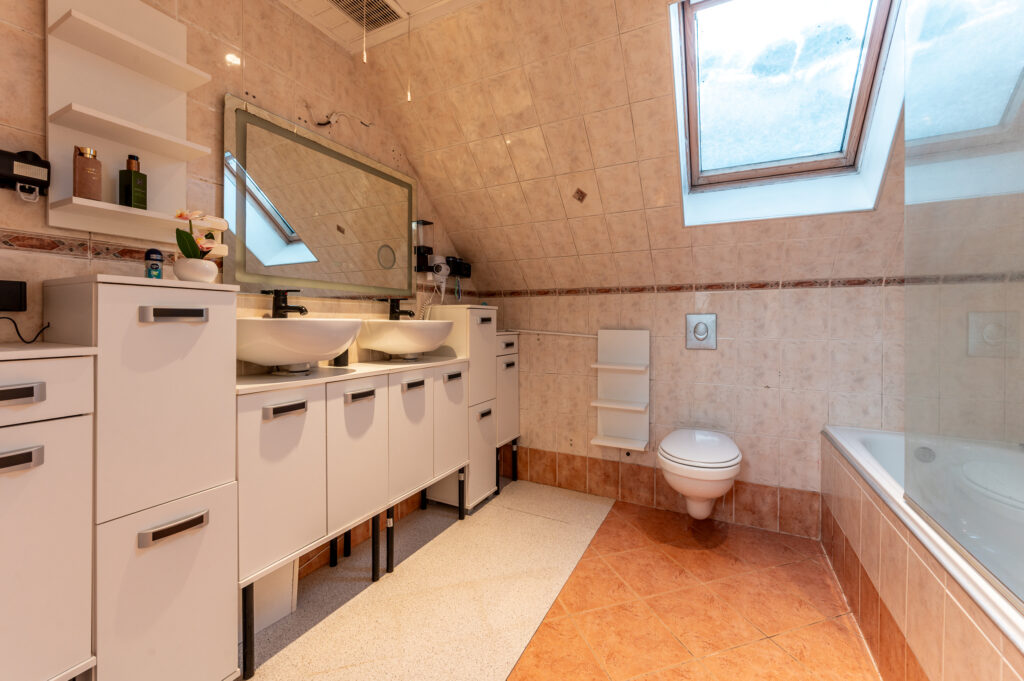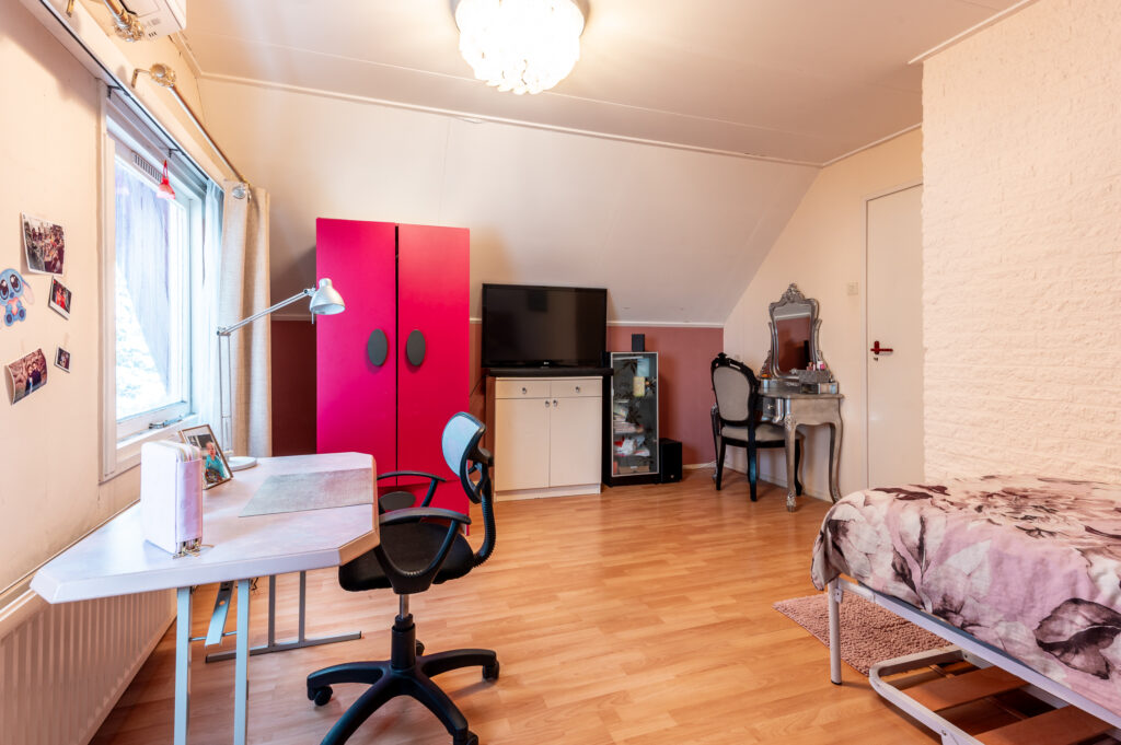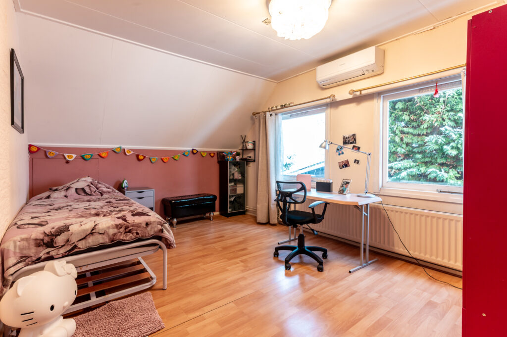 Overloop met toegang tot twee royale slaapkamers (ca. 21 en 15 m²), welke eenvoudig zijn terug te brengen naar de oorspronkelijke indeling met drie slaapkamers. De grote slaapkamer is bovendien na-geïsoleerd (dakisolatie), wat bijdraagt aan extra comfort en energiezuinigheid. De overloop geeft daarnaast toegang tot de badkamer, vliering en extra bergruimte achter het knieschot. De slaapkamers zijn voorzien van airconditioning voor zowel verwarmen als koelen. De badkamer is uitgerust met een ligbad, tweede toilet, dubbele wastafels en een dakraam voor zowel daglicht als ventilatie.