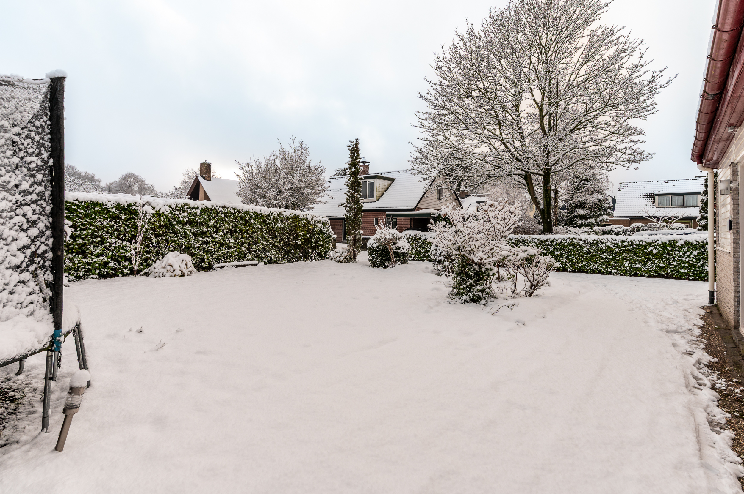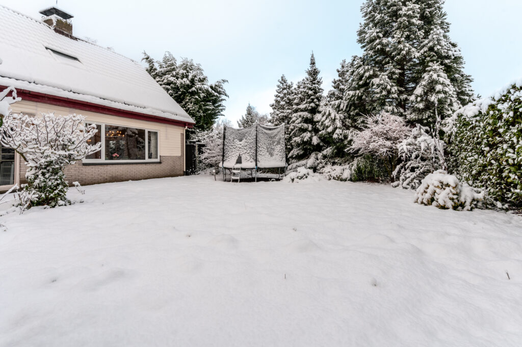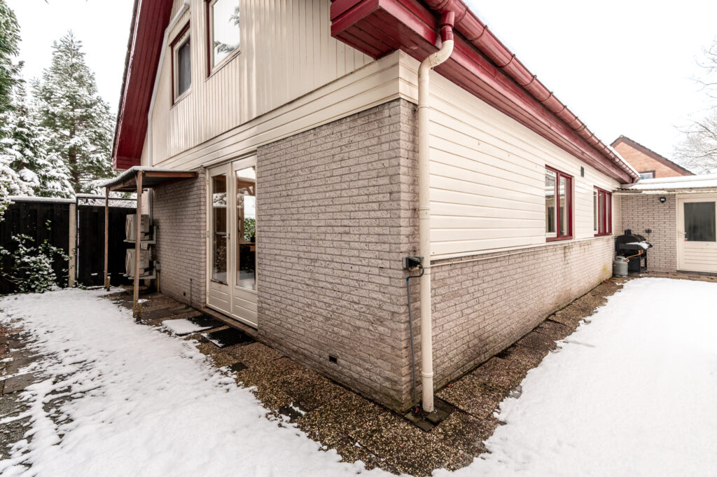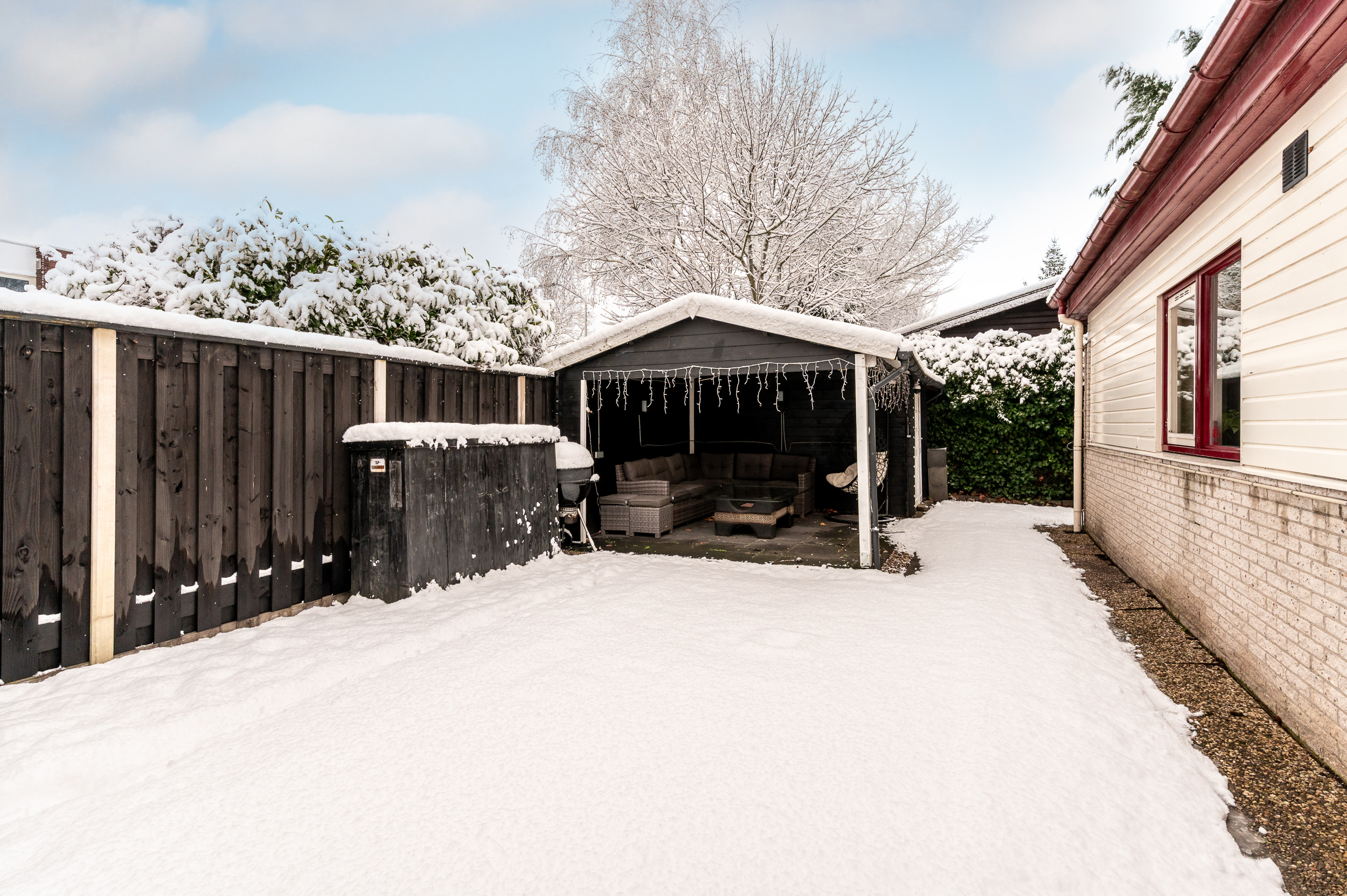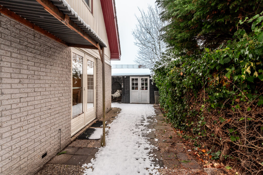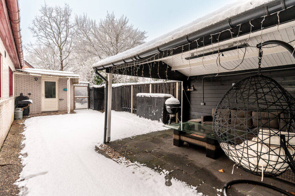 In de achtertuin bevindt zich een gezellige overkapping met houten berging (ca. 3,30 x 2,35 meter); een heerlijke plek om te barbecueën en tot in de late uurtjes te genieten met vrienden en familie. Ook vanuit de achtertuin is de garage bereikbaar.