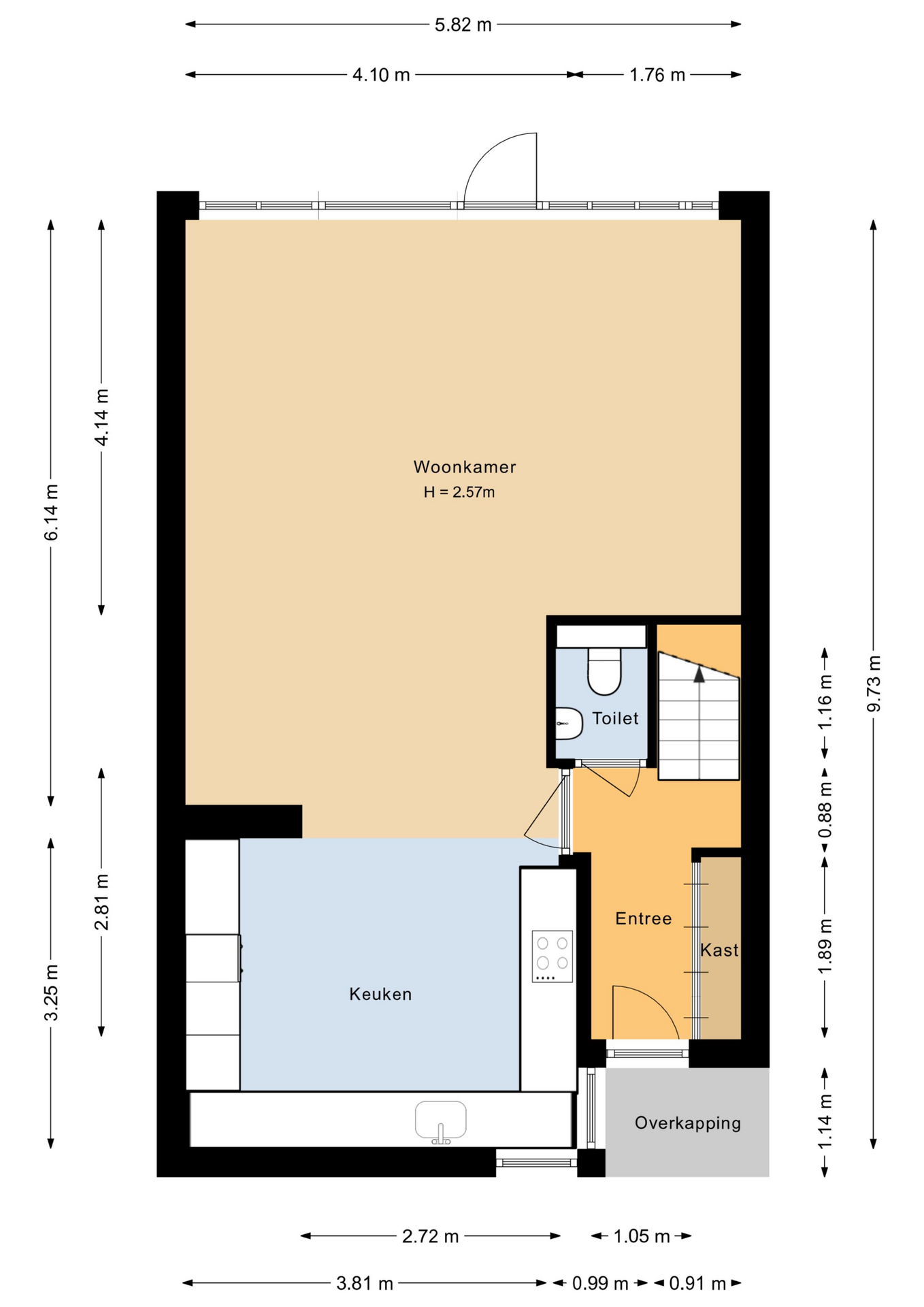 Overdekte entree, hal met vast kast, modern toilet met fonteintje, zeer ruime en licht woonkamer (ca. 30 m²) met deur naar de achtertuin, zeer ruime en moderne U-vormige keuken voorzien van inbouwapparatuur.