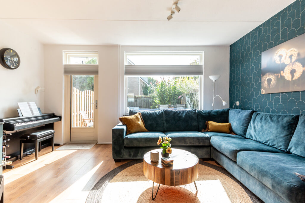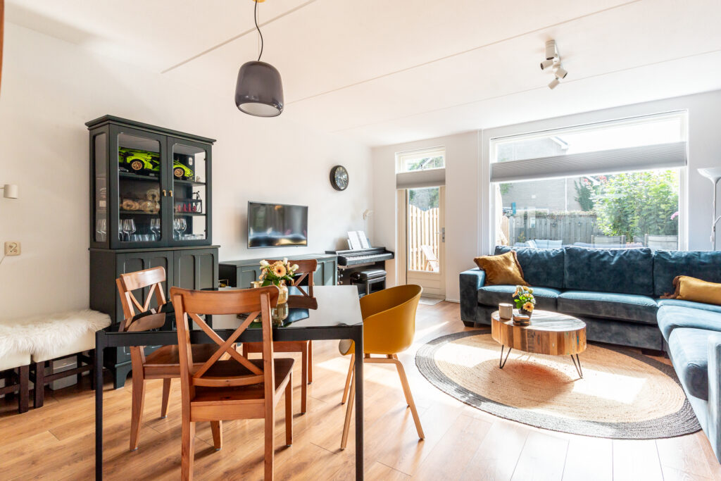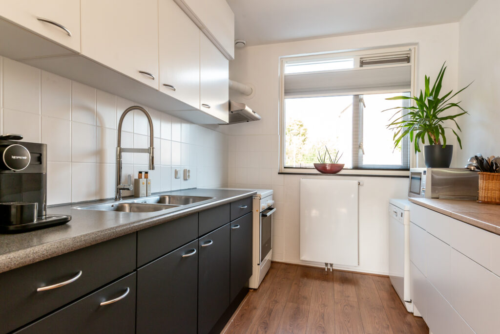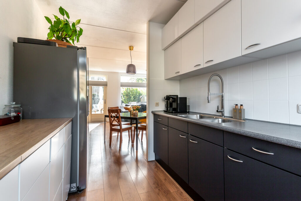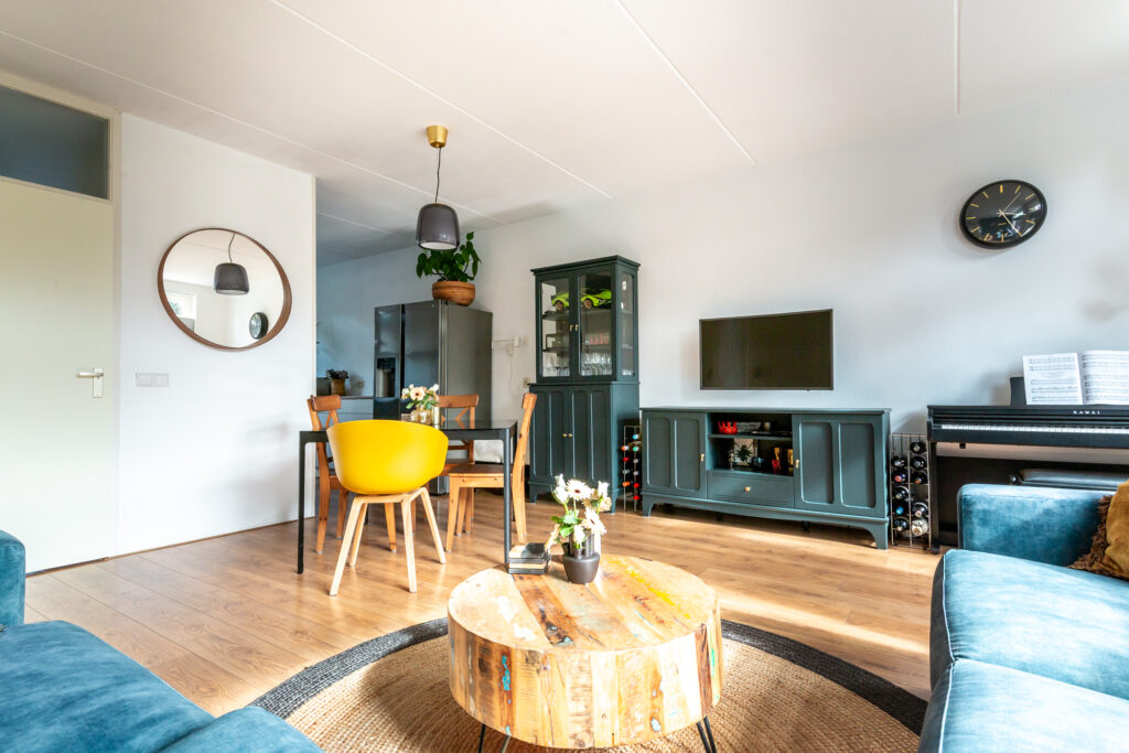 Bij binnenkomst valt direct de ruime en lichte woonkamer op. Dankzij de grote raampartijen is er veel natuurlijk daglicht en ontstaat er een prettige sfeer. De half open keuken sluit mooi aan op de woonkamer en biedt volop mogelijkheden om gezellig te koken en samen te tafelen.