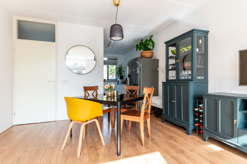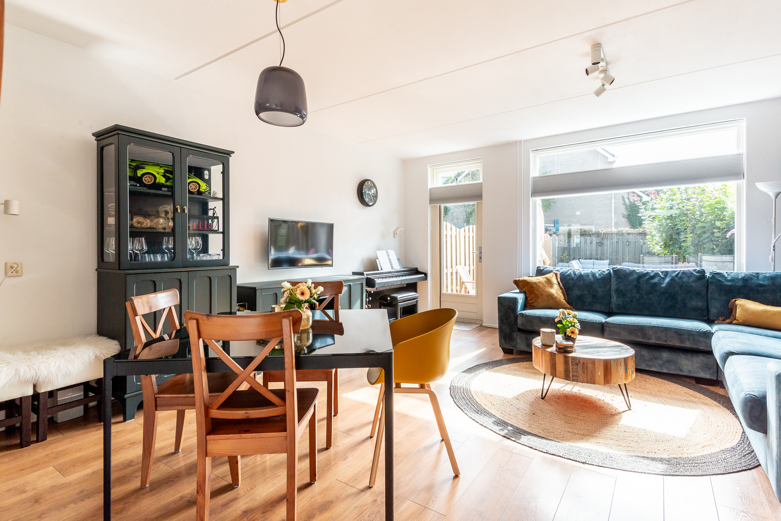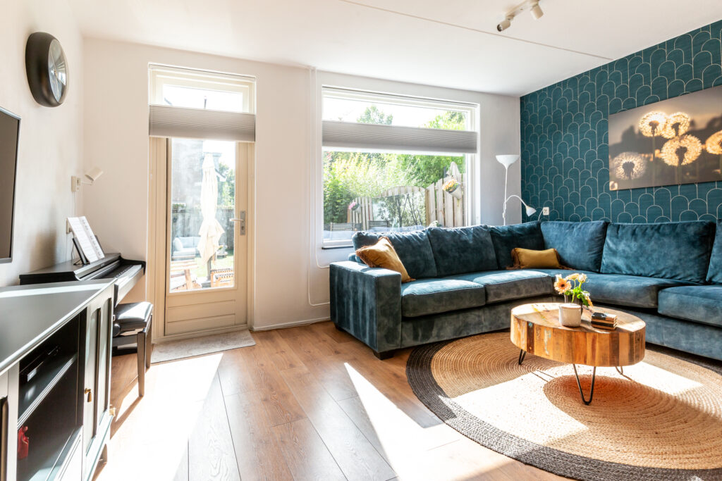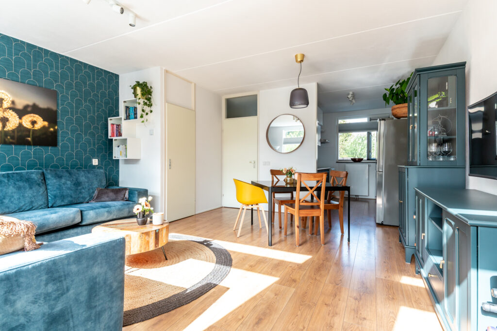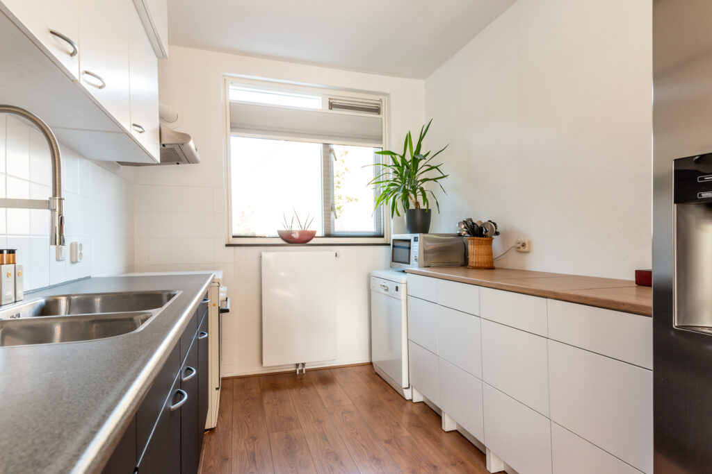 Bij binnenkomst valt direct de ruime en lichte woonkamer op. Dankzij de grote raampartijen is er veel natuurlijk daglicht en ontstaat er een prettige sfeer. De half open keuken sluit mooi aan op de woonkamer en biedt volop mogelijkheden om gezellig te koken en samen te tafelen.