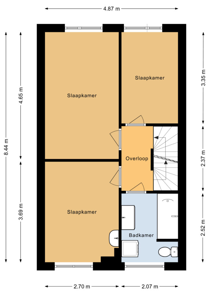 Op de eerste verdieping bevinden zich drie goed bemeten slaapkamers die ieder op hun eigen manier ingericht kunnen worden, bijvoorbeeld als kinderkamer, werkkamer of logeerkamer. De moderne badkamer is van alle gemakken voorzien en uitgerust met een wastafel met meubel, ligbad, regendouche en toilet. Daarnaast beschikt de badkamer over natuurlijke ventilatie. Op de tweede verdieping is nog een vierde slaapkamer aanwezig, waardoor er voldoende ruimte is voor een groter gezin of het realiseren van een hobby- of werkruimte.