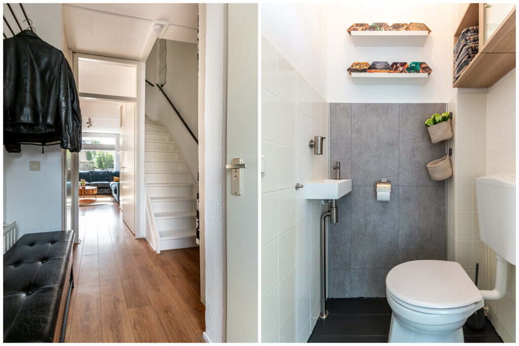 Entree, hal, modern toilet met fonteintje, ruime en lichte woonkamer (ca. 25 m²) met deur naar de tuin, trapkast, half open keuken (straatgericht).