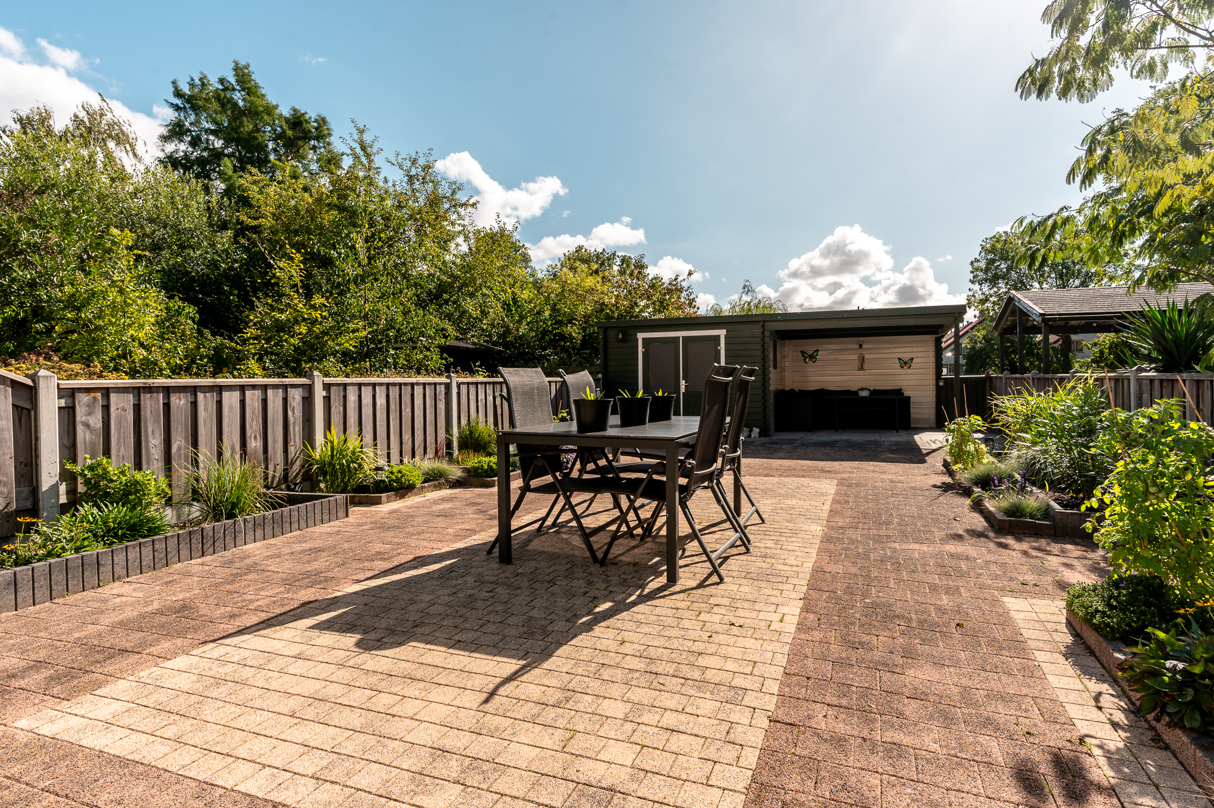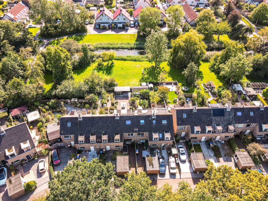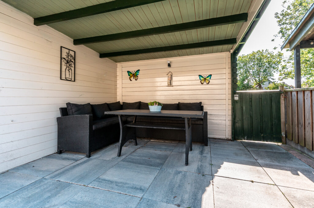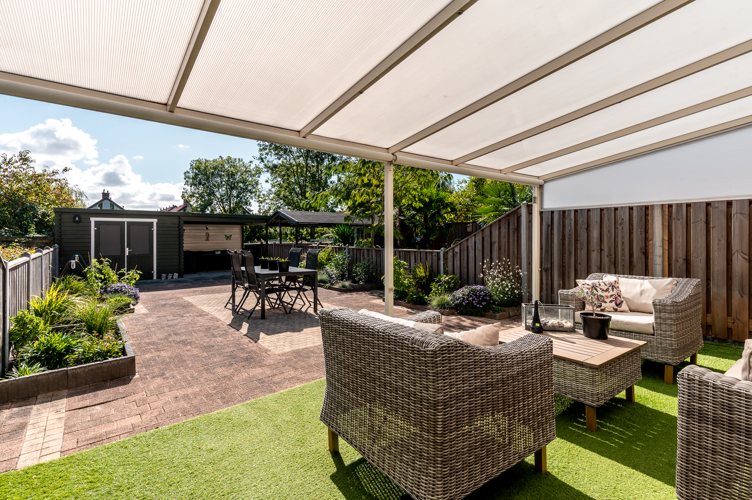 De royale achtertuin (15x7 meter) is gelegen op het zonnige zuiden. U kunt hier heerlijk genieten in de zon of in de schaduw onder één van de overkappingen. De achterzijde is vrij gelegen aan een grasveldje met daarachter een waterpartij. U heeft hier geen directe achterburen, volop privacy!