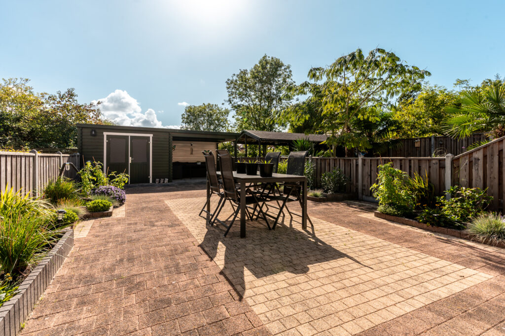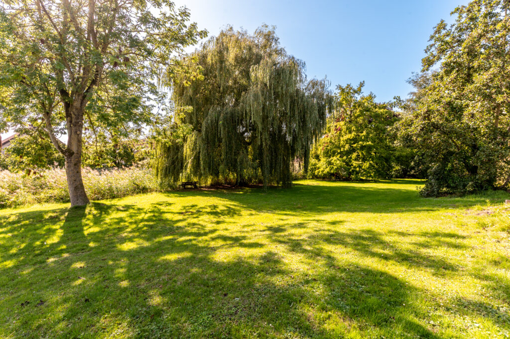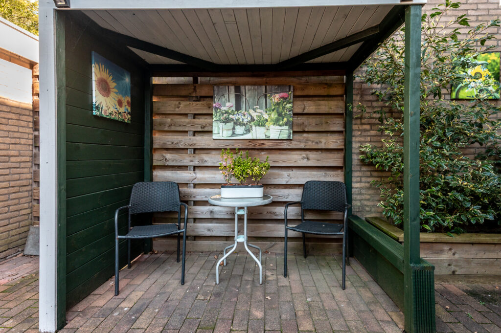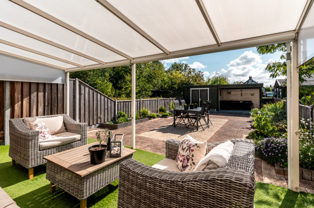 De royale achtertuin (15x7 meter) is gelegen op het zonnige zuiden. U kunt hier heerlijk genieten in de zon of in de schaduw onder één van de overkappingen. De achterzijde is vrij gelegen aan een grasveldje met daarachter een waterpartij. U heeft hier geen directe achterburen, volop privacy!