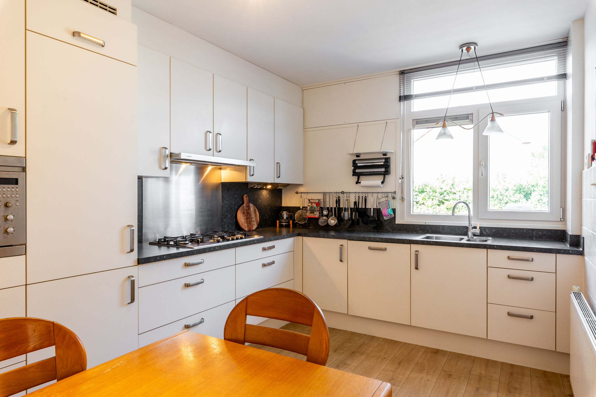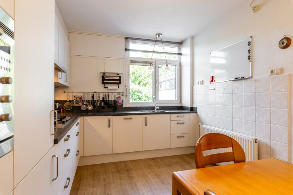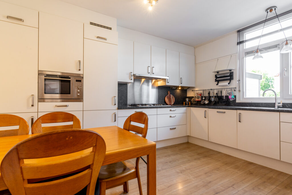 Aan de voorzijde bevindt zich de royale keukenruimte met een nette inbouwkeuken (2014), voorzien van diverse inbouwapparatuur, waaronder een gasfornuis, afzuigkap, combi-oven, koel-vriescombinatie (2023), vaatwasser en een close-in boiler.