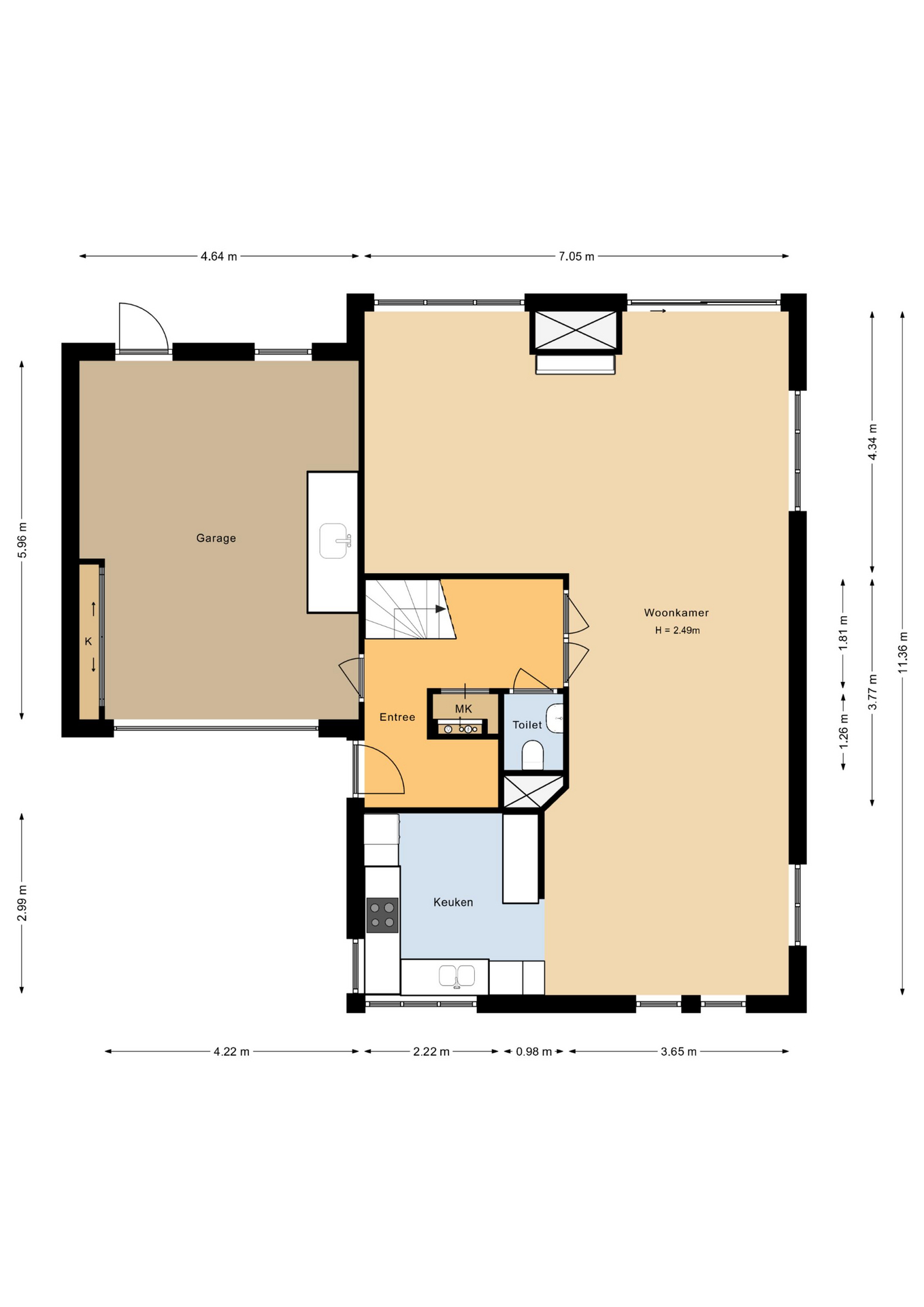 Entree/hal met de garderobe, meterkast, toiletruimte, trapopgang naar de verdieping en middels dubbele openslaande deuren toegang naar de woonkamer. Ruime tuingerichte woonkamer (7.05 m. breed) met een fraaie houten vloer, een sfeervolle open haard, grote raampartijen (met veel lichtinval) en middels een schuifpui toegang de fraai aangelegde tuin met een ligging op het oosten. Doorloop vanuit de woonkamer naar de keuken (2007), welke voorzien is van de volgende apparatuur; koelkast, vriezer, vaatwasser, combi-oven, 4-pits inductiekookplaat en een afzuigkap. Ruime opstelmogelijkheden voor een grote eettafel waar u heerlijk met uw familie kunt dineren. Vanuit de hal is tevens de garage te bereiken (ca. 28 m2), welke momenteel in gebruik is als bijkeuken en voorzien van een ingebouwde kastenwand, een keukenblok met de wasmachine/drogeraansluiting en een toegangsdeur naar de tuin.