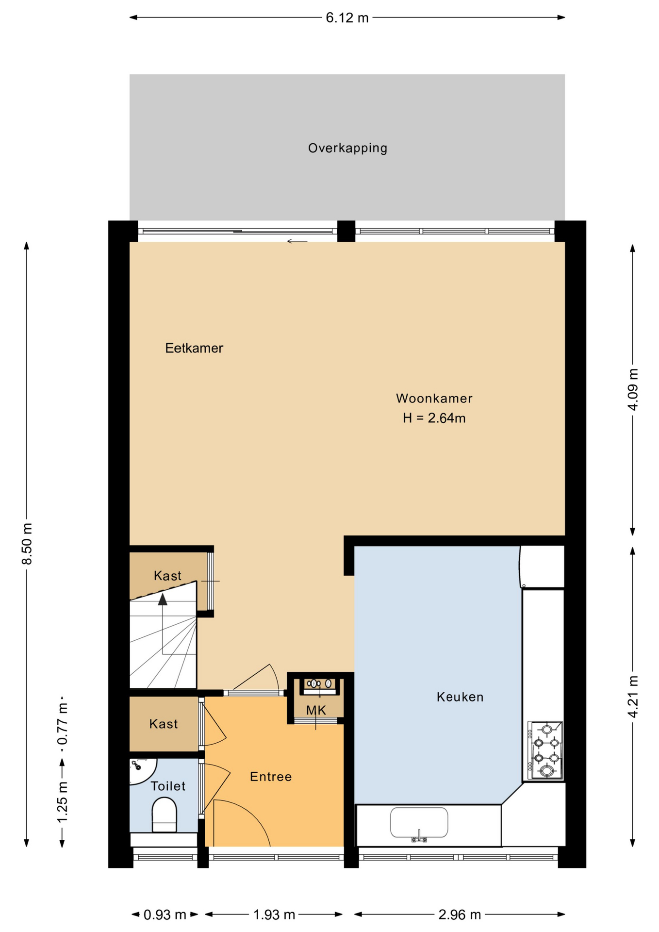 Entree, hal met vaste kast, toilet met fonteintje, ruime en lichte woonkamer (ca. 25 m²) voorzien van trapkast en schuifpui naar de achtertuin, half open keuken voorzien van diverse inbouwapparatuur.