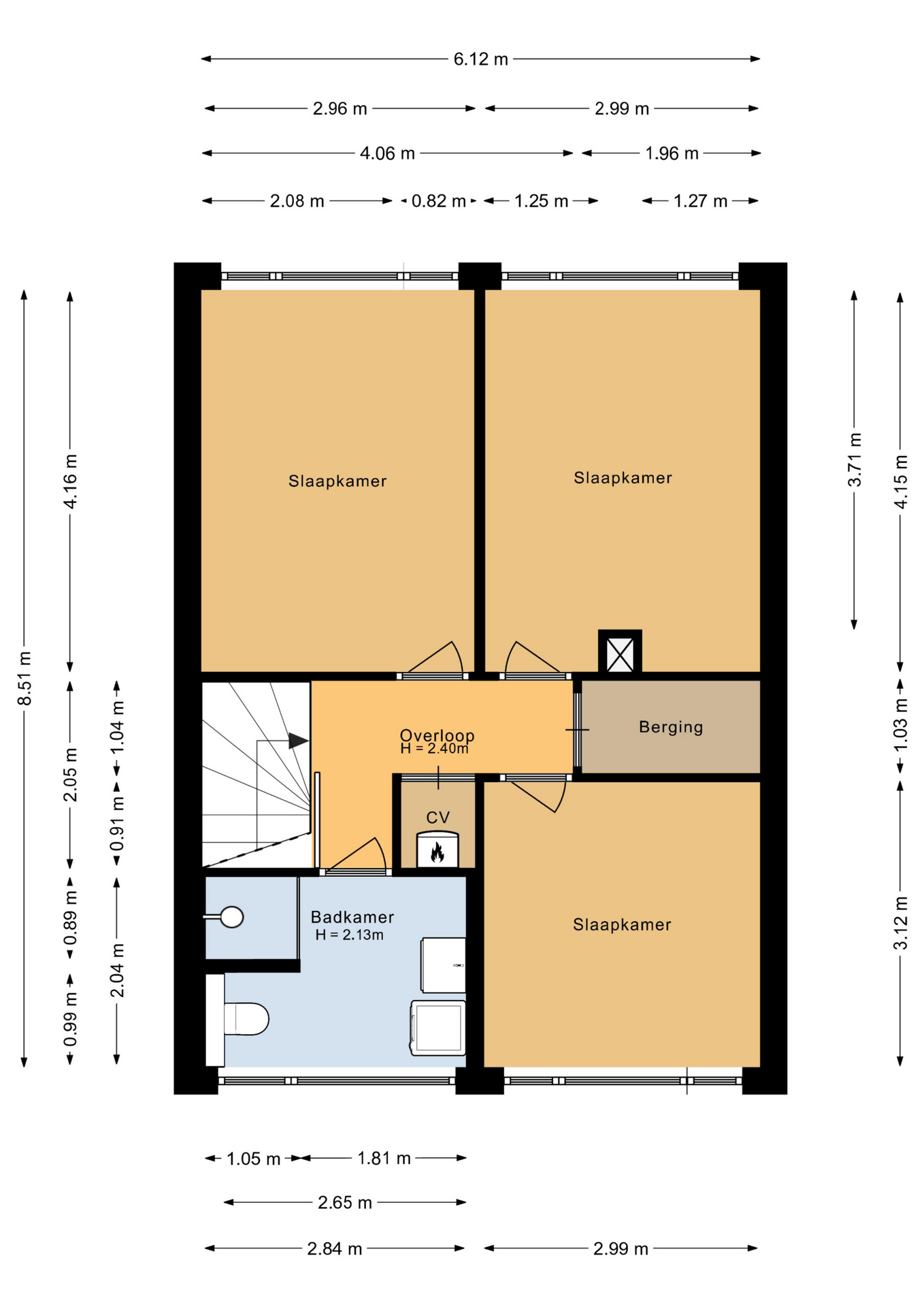 Overloop, slaapkamer 1 (ca. 12 m²), slaapkamer 2 (ca. 12 m²), slaapkamer 3 (ca. 9 m²), aparte berging, aparte ruimte met opstelling CV, moderne badkamer voorzien van toilet, douche, wastafel met meubel en opstelling droger.