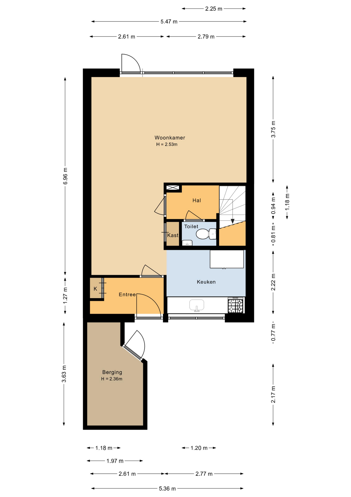 Entree, hal, ruime en lichte woonkamer (ca. 28 m²) met deur naar de tuin en vaste kast, half open keuken (straatgericht), tweede hal, toilet met fonteintje.
