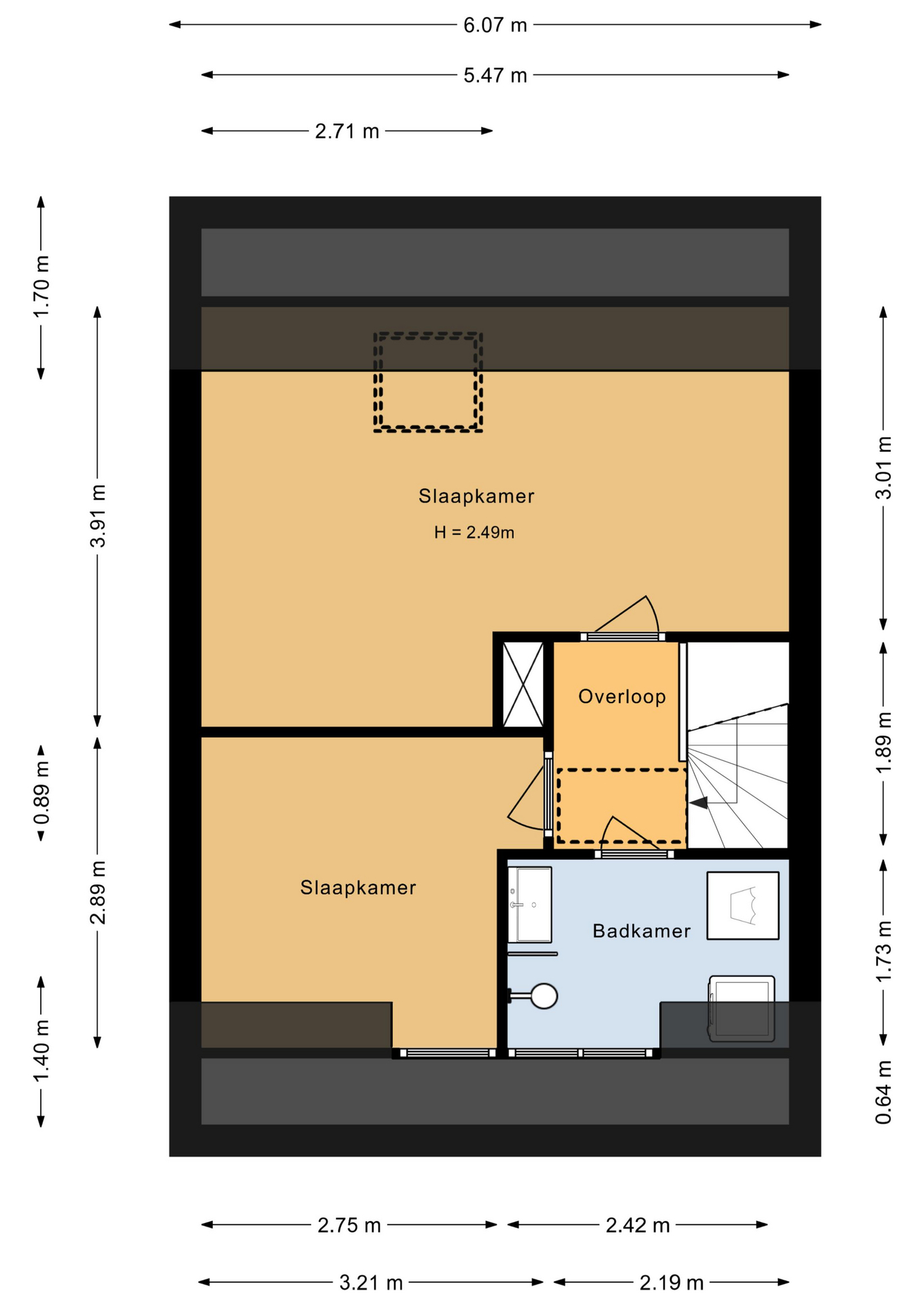 Overloop, slaapkamer 1 (ca. 18 m²) met dakraam, slaapkamer 2 (ca. 8 m²) voorzien van dakkapel, badkamer voorzien van wastafel met meubel, inloopdouche en opstelling wassen-/drogen.
