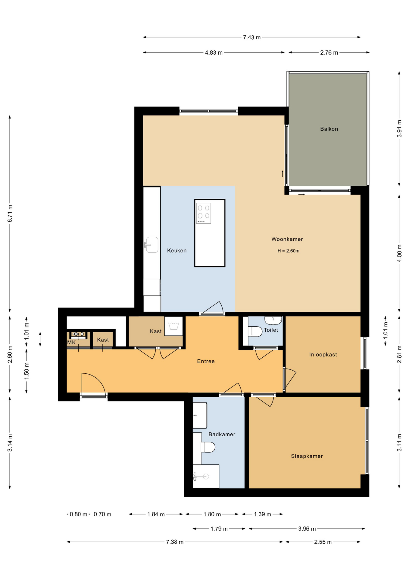 Entree, gang, separaat toilet, aparte kast met opstelling wassen-/drogen en mechanische ventilatie, zeer ruime en lichte woonkamer (ca. 28 m²) met schuifpui naar balkon (ca. 11 m²), luxe moderne open keuken voorzien van kookeiland, graniet werkblad en diverse inbouwapparatuur, slaapkamer 1 (ca. 12 m²), slaapkamer 2 (ca. 7 m²), moderne badkamer voorzien van brede wastafel met meubel, aparte kast, inloopdouche en toilet.