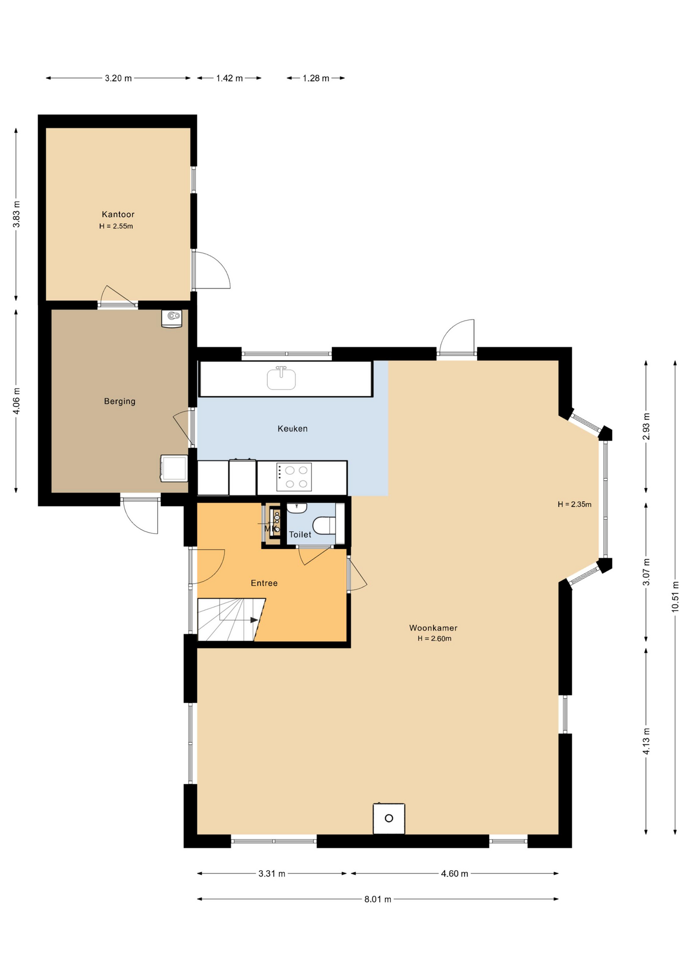 Entree/hal met de meterkast, toiletruimte, garderobe, trapopgang naar de verdieping en toegang naar de woonkamer. Een riante straatgerichte woonkamer van maar liefst 8.01 meter breed met grote raampartijen (veel lichtinval), een sfeervolle houtkachel en een karakteristieke erker aan de zijkant. Doorloop naar de fraaie inbouwkeuken (2021) in dubbele opstelling, welke voorzien is van de volgende apparatuur; koelkast, vriezer, vaatwasser, oven, combimagnetron, 4-pits inductiekookplaat en een afzuigkap. Ruime opstelmogelijkheden voor een grote eettafel, waar u heerlijk met vrienden en familie kunt dineren. Aangrenzend treft u de praktische bijkeuken met de opstelplaats van de cv-ketel (2020), de wasmachine/droger aansluiting en een deur naar de oprit/voortuin. Aangebouwde kantoorruimte (ca. 12 m2) met een deur naar de tuin, welke ook gebruikt kan worden als slaapkamer op de begane grond. De begane grond is voorzien van een mooie Coretec vloer (PVC) met vloerverwarming (m.u.v. de bijkeuken en werkkamer).