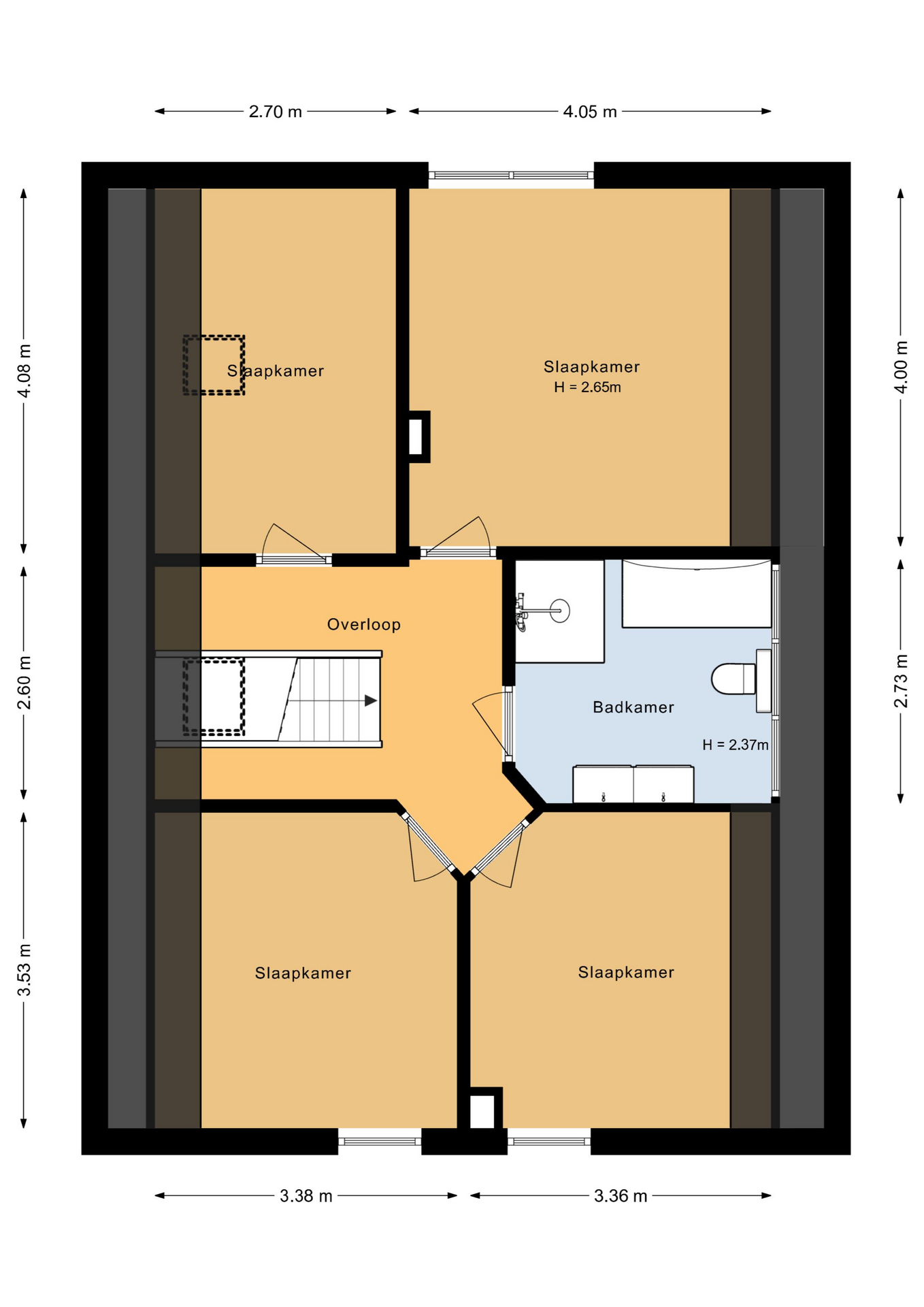 Overloop met toegang tot 4 ruime slaapkamers (ca. 16 / 11 / 11 / 11 m2), waarbij de ouderslaapkamer is voorzien van rolluiken. De moderne badkamer (2021) met dakkapel is voorzien van een ligbad, douche, wastafelmeubel met dubbele kraan, een designradiator en een raam voor de natuurlijke ventilatie. De verdieping is voorzien van een mooie laminaatvloer.