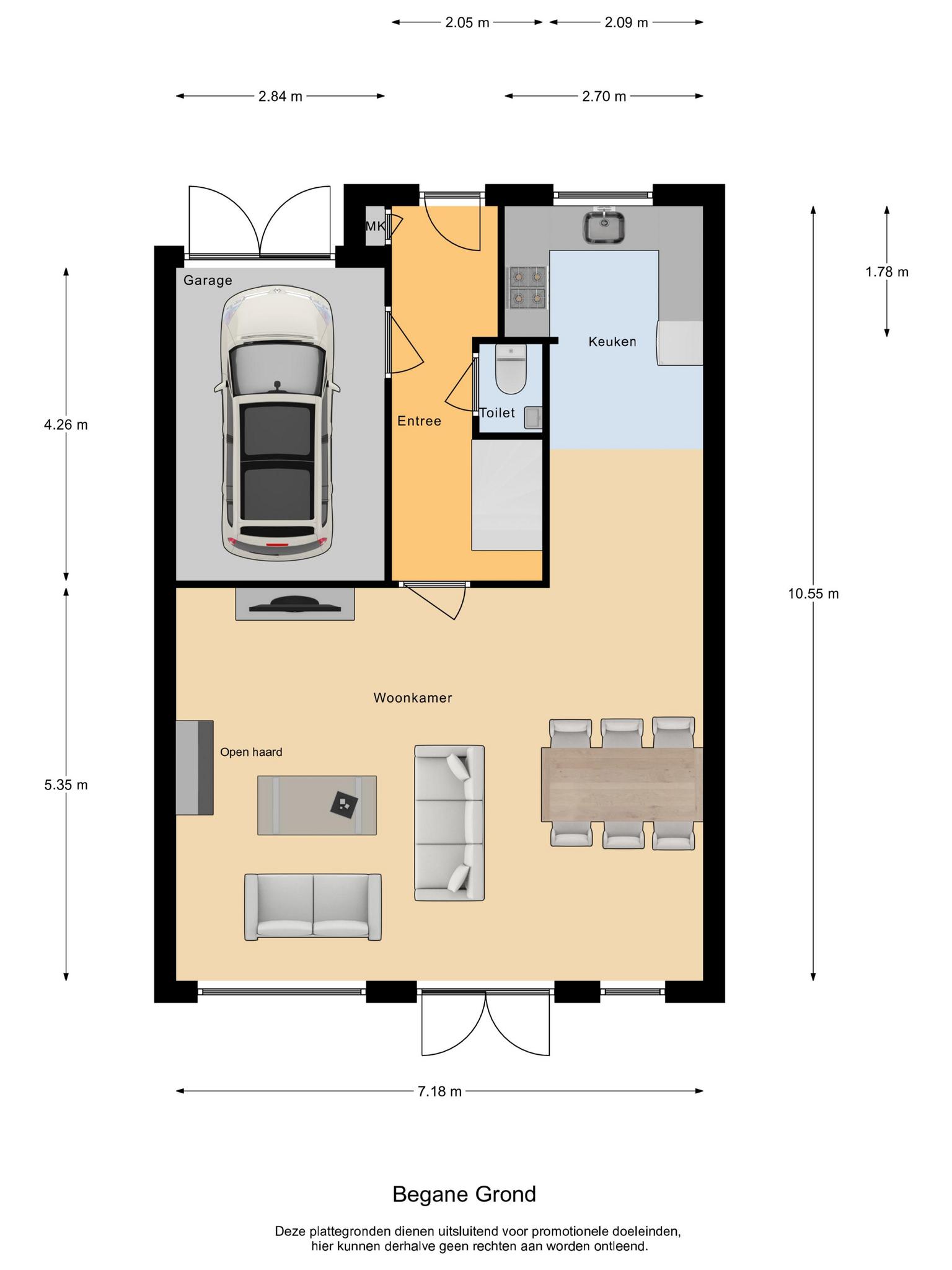 Entree, hal, vanuit de hal bereikt u de inpandige garage (ca. 12 m²) toilet met fonteintje, zeer ruime en lichte woonkamer (ca. 40 m²) met openslaande deuren naar de achtertuin, half open keuken voorzien van diverse inbouwapparatuur (U-opstelling, straatgericht).
