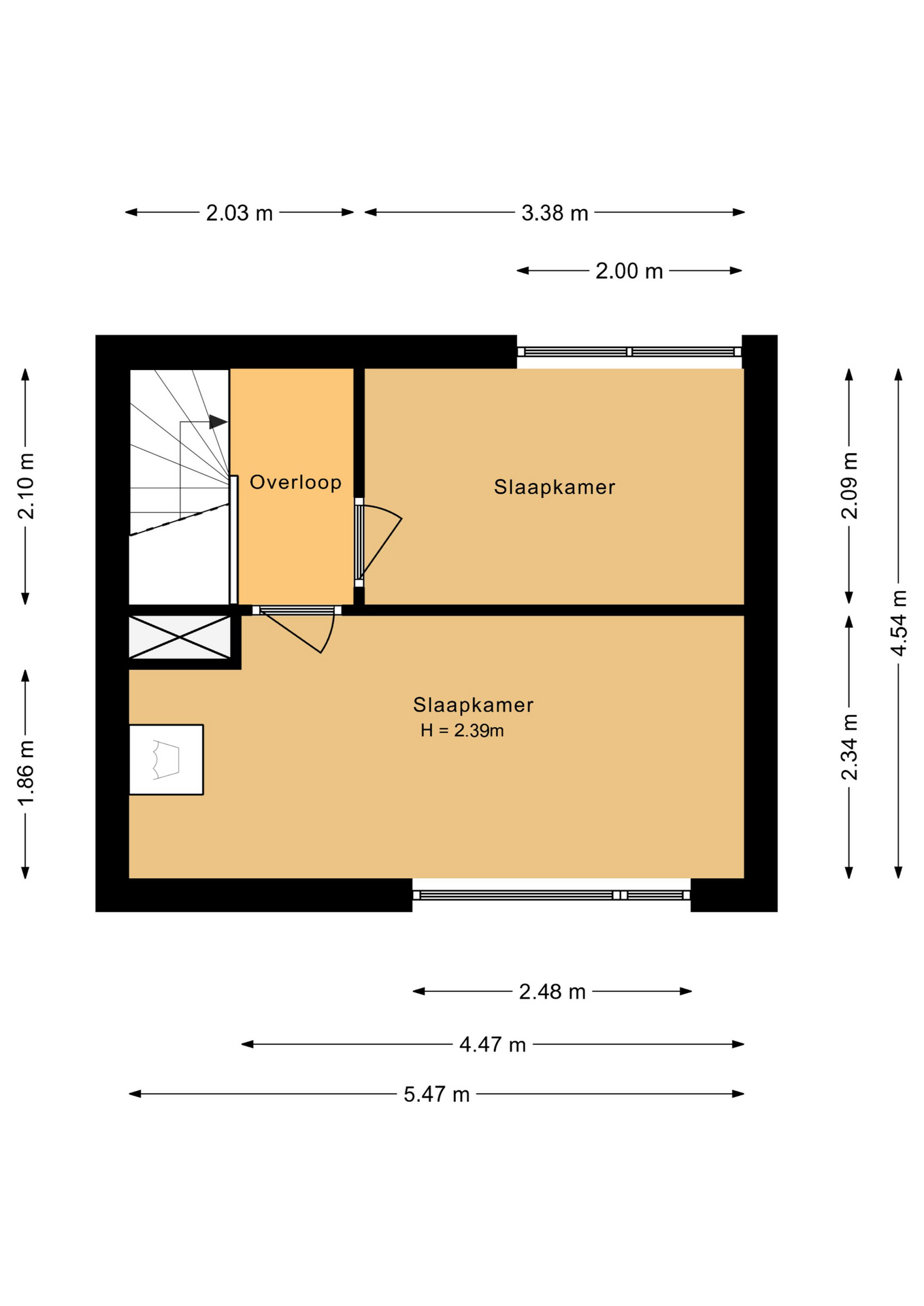 Overloop, slaapkamer 2 (ca. 10 m²) met opstelling wassen/drogen, slaapkamer 3 (ca. 7 m²).