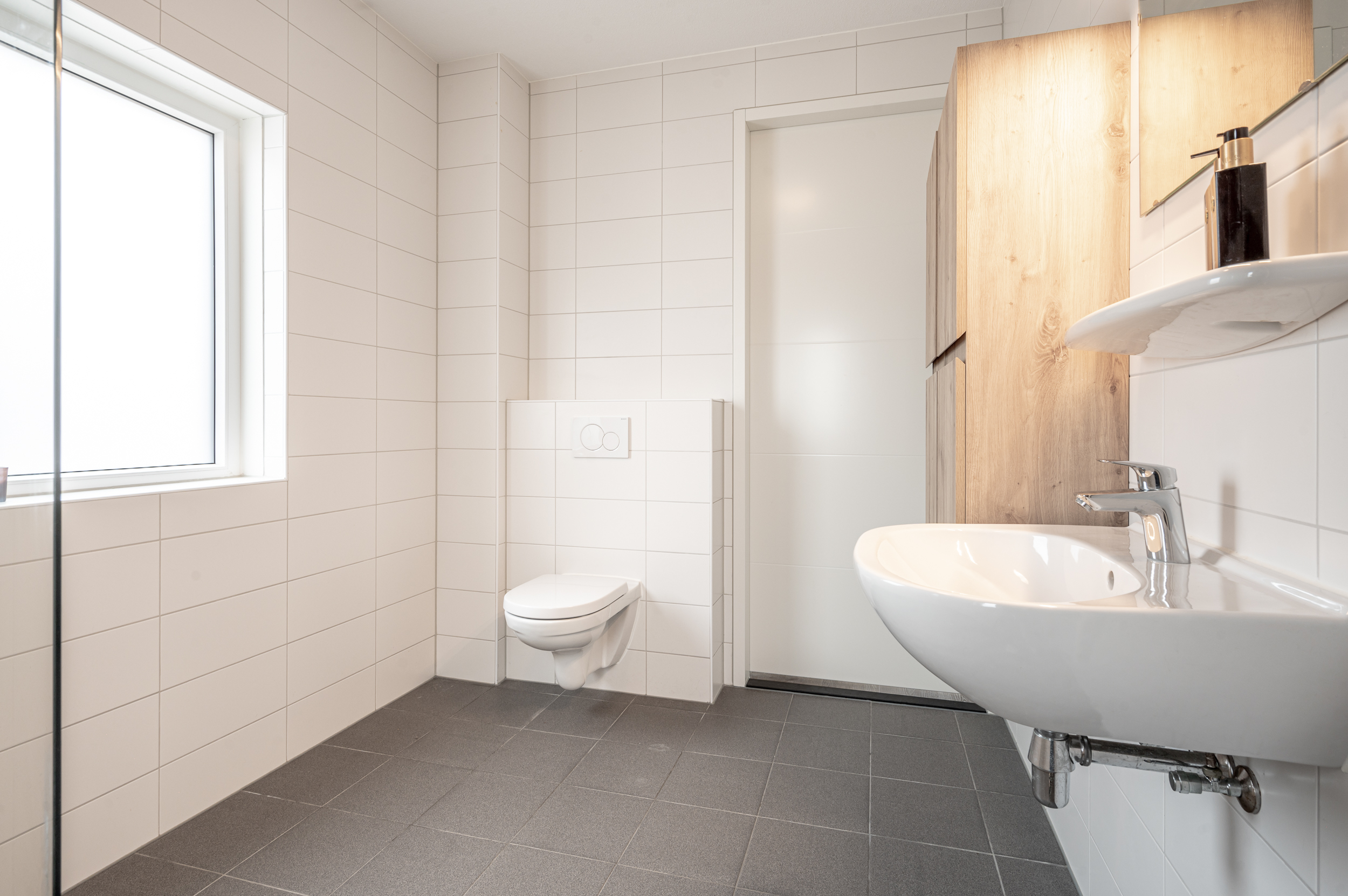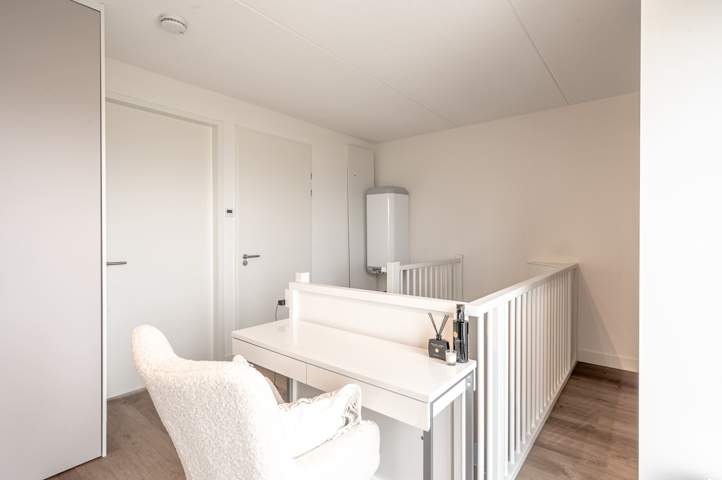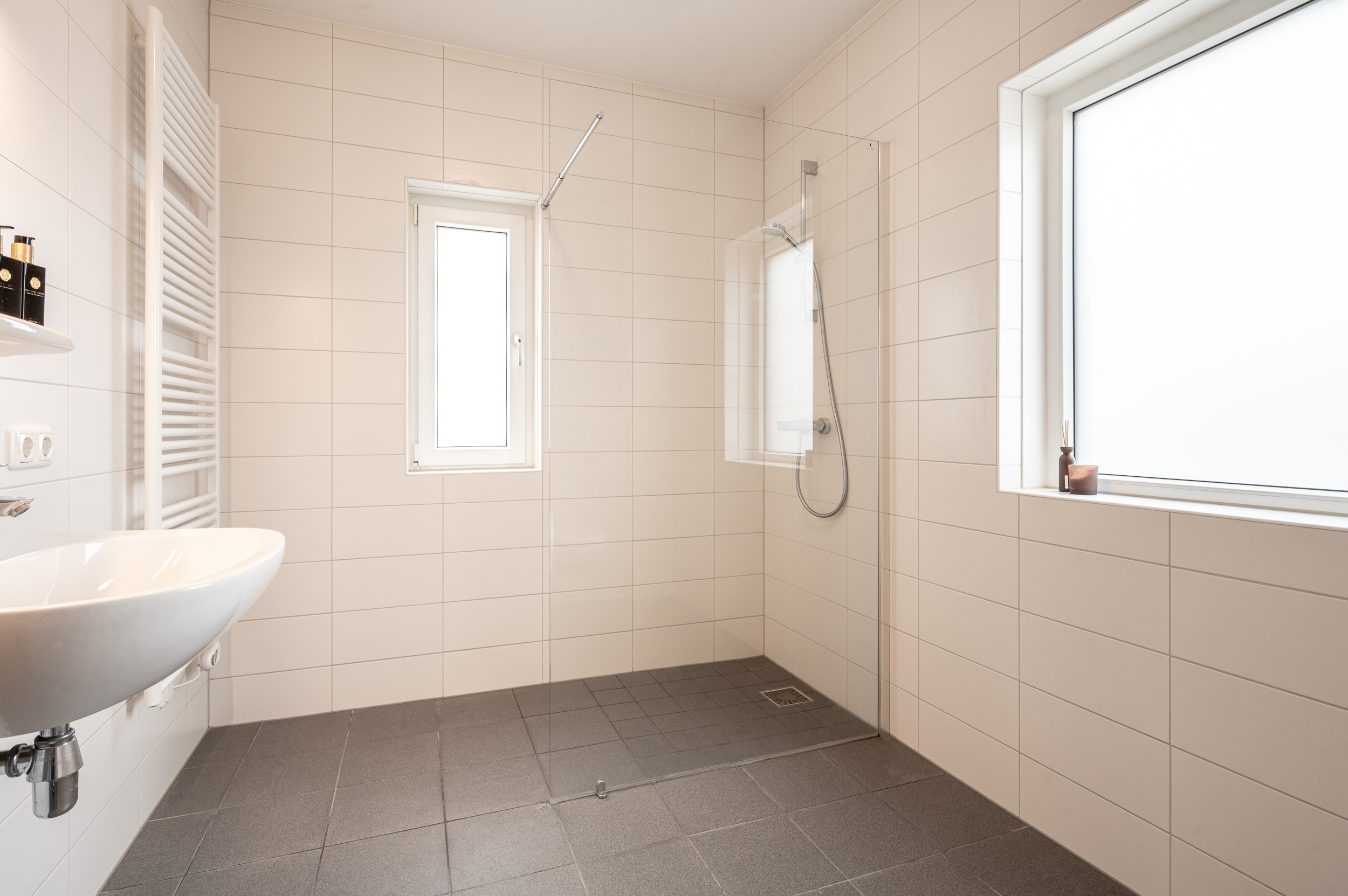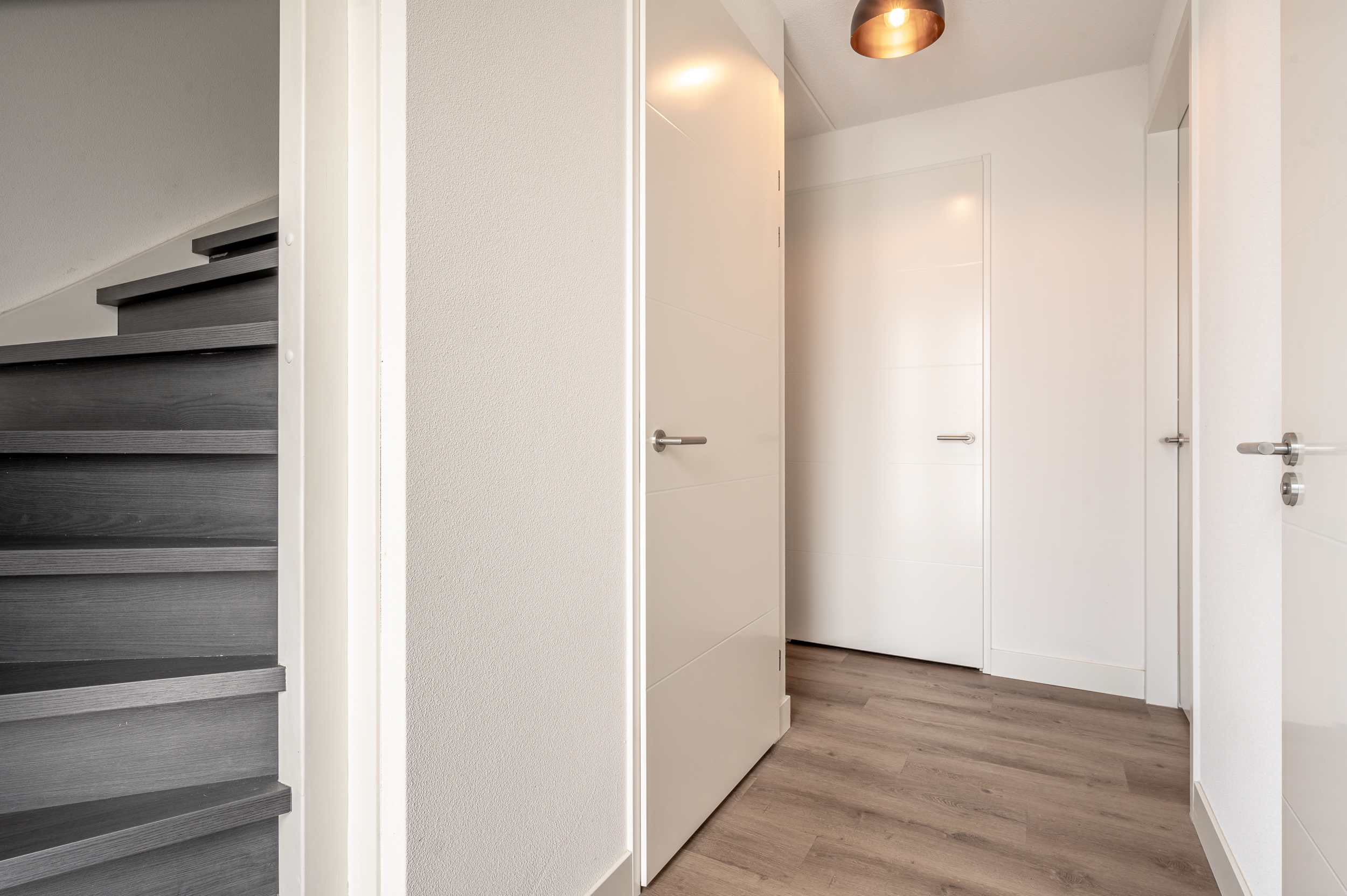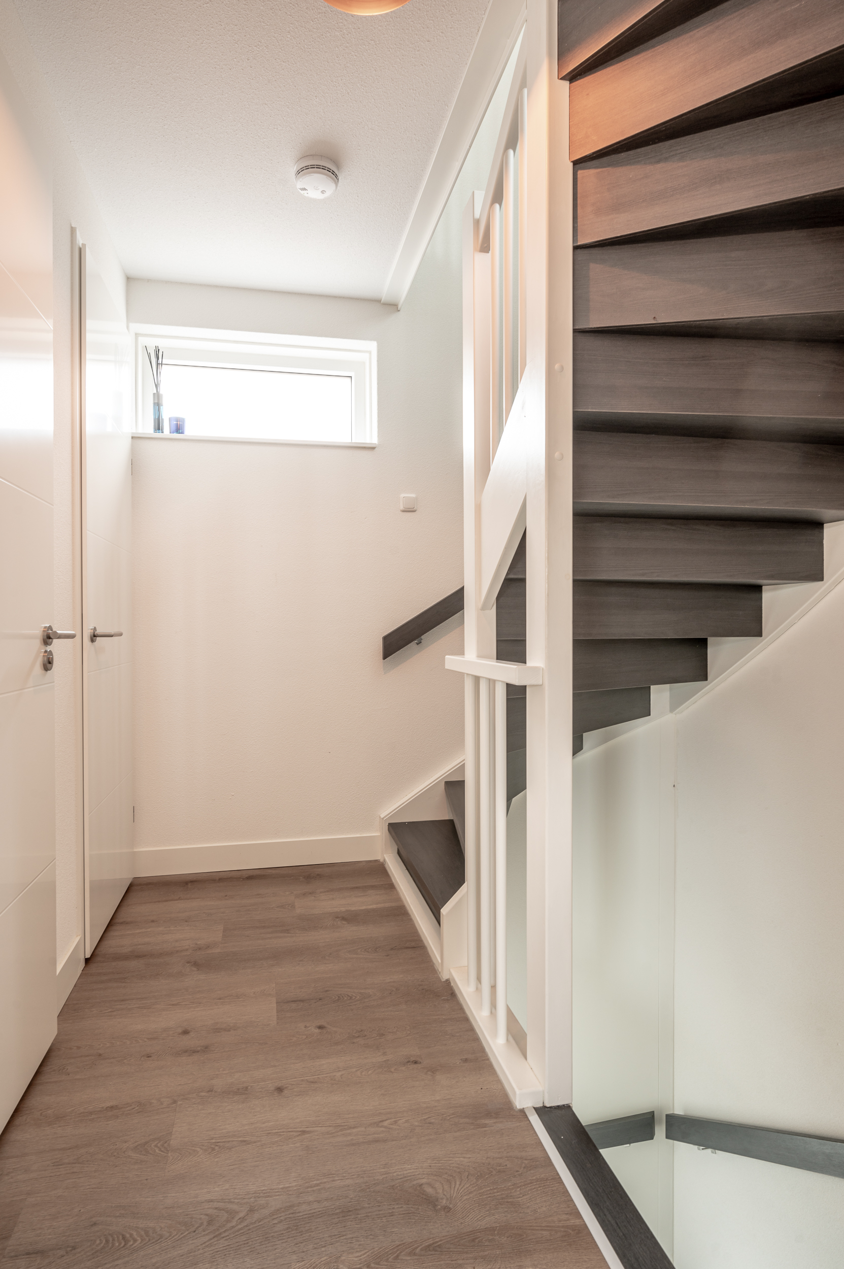 Entree/hal met de meterkast, trapopgang naar de verdieping, trapkast en toegang tot 3 ruime slaapkamers (ca. 11 / 9 / 9 m2), waarbij 1 slaapkamer momenteel is ingericht als kastenkamer en een directe toegang geeft tot de tuin. Moderne badkamer met een inloopdouche, toilet, wastafelmeubel met een dubbele kraan, vloerverwarming, designradiator en een raam voor de natuurlijke ventilatie. Technische ruimte met de warmtepomp en warmwaterboiler, de WTW-installatie, omvormer voor de 8 zonnepanelen en de wasmachine/droger aansluiting. De begane grond is voorzien van een fraaie PVC-vloer met vloerverwarming.