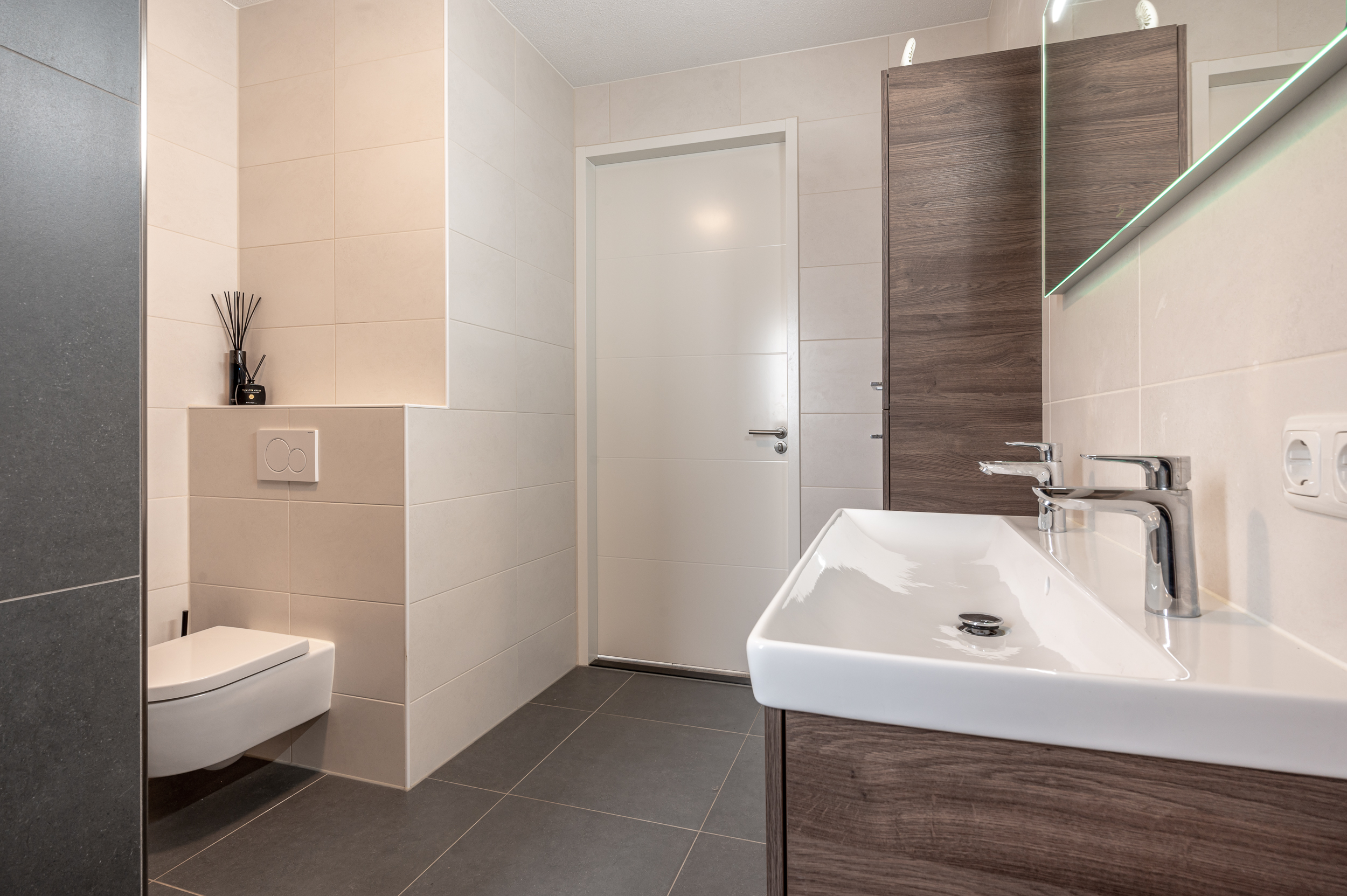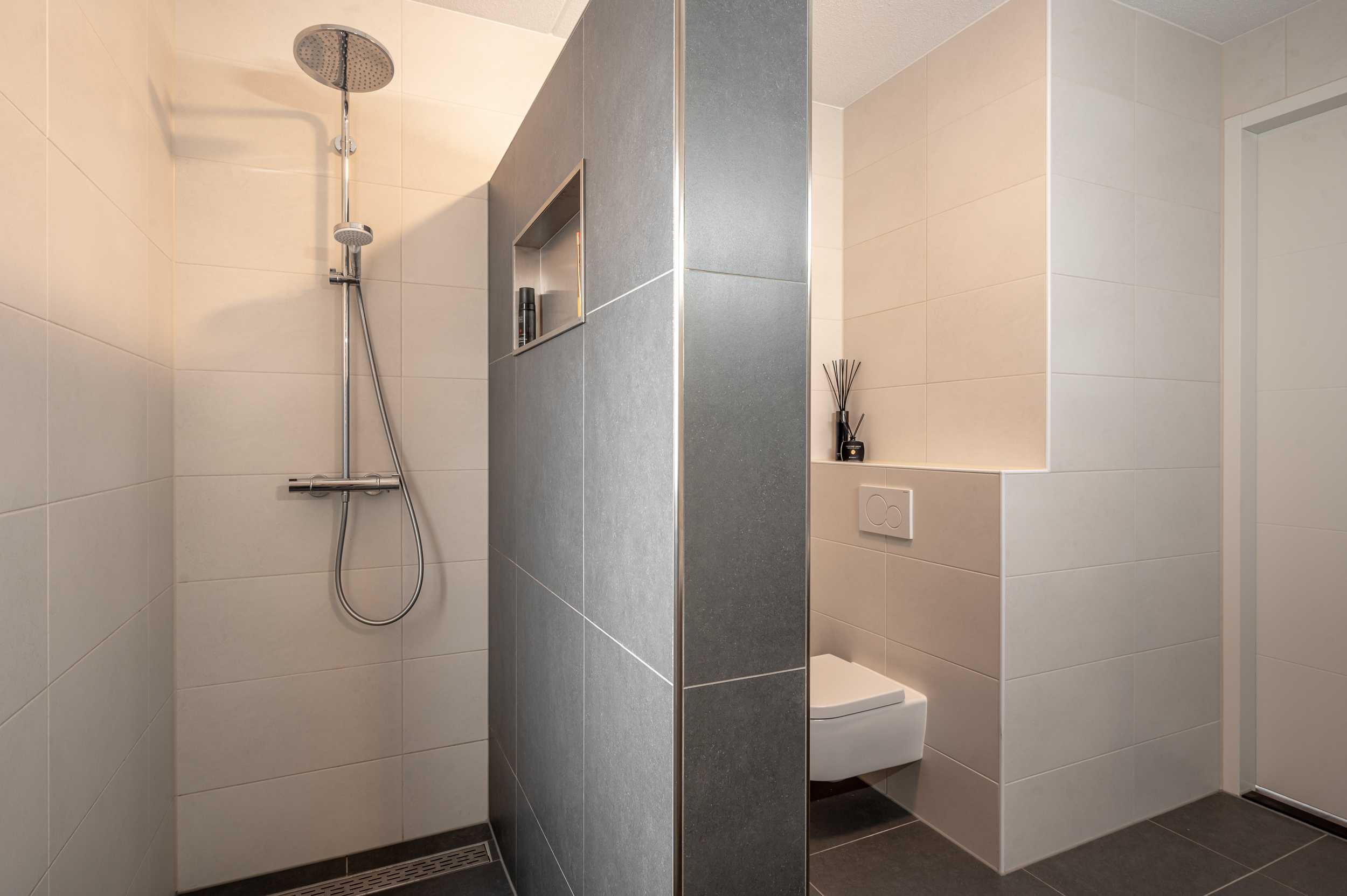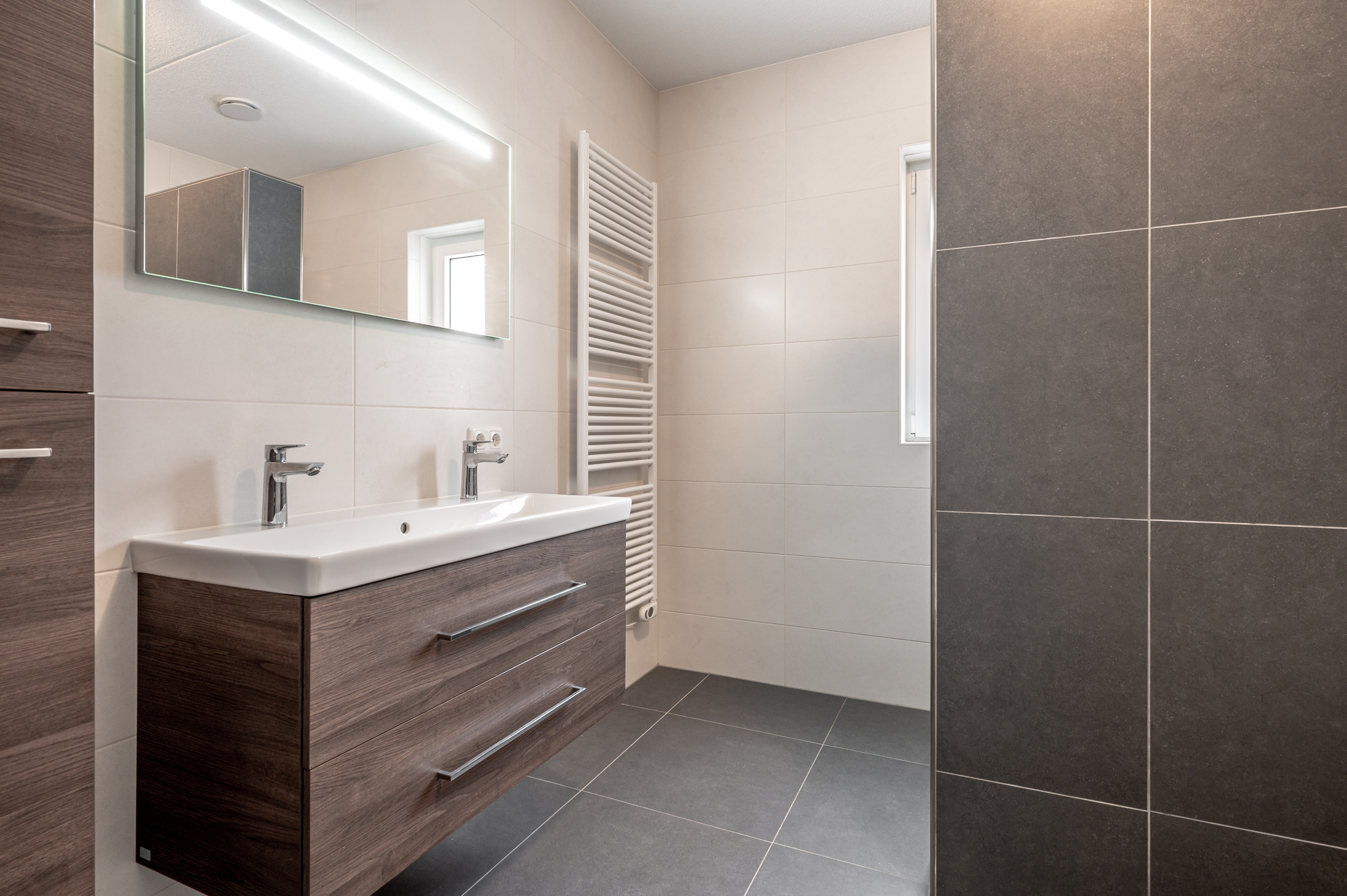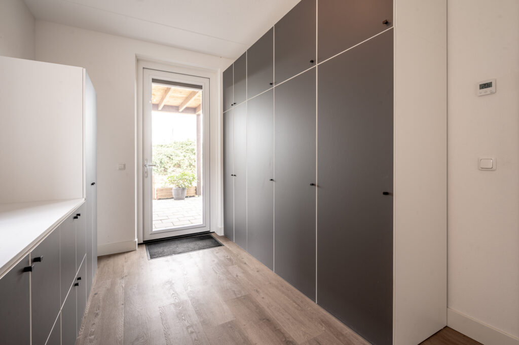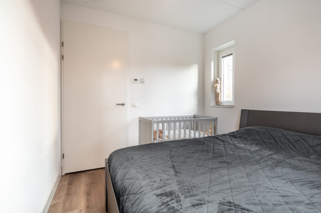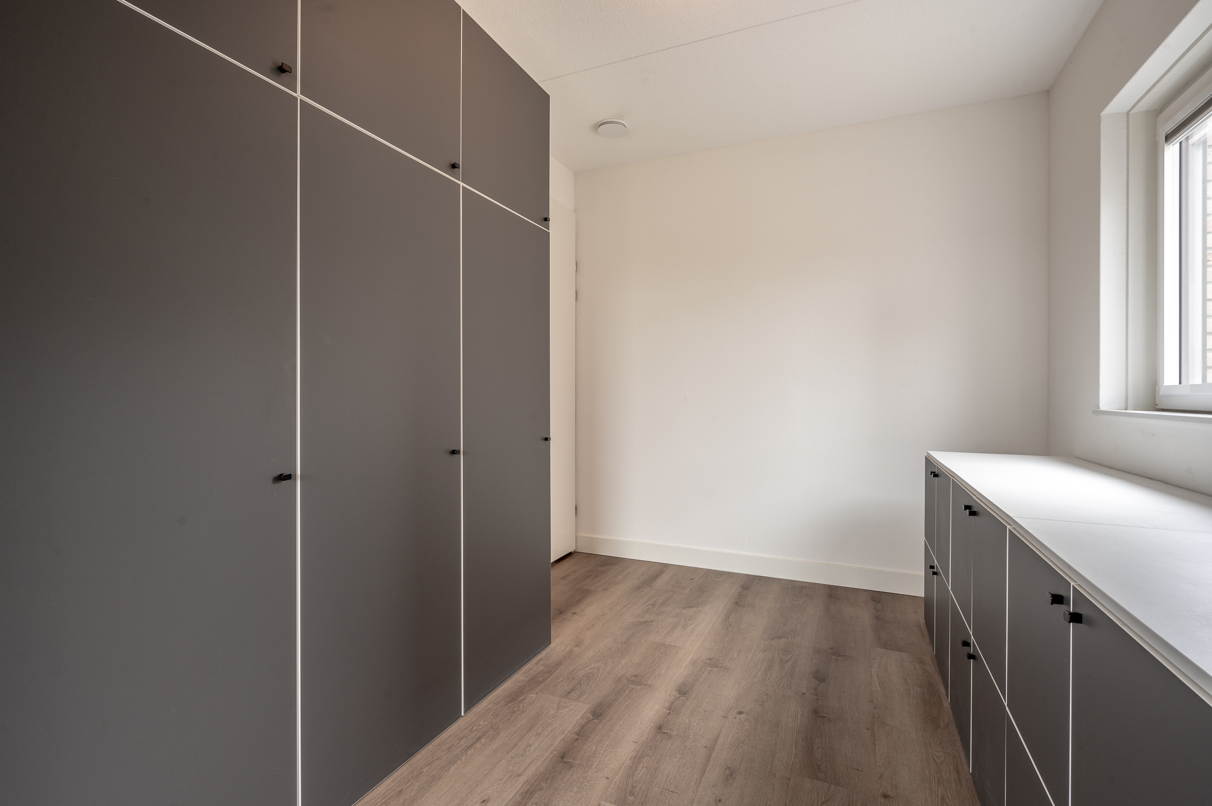 Entree/hal met de meterkast, trapopgang naar de verdieping, trapkast en toegang tot 3 ruime slaapkamers (ca. 11 / 9 / 9 m2), waarbij 1 slaapkamer momenteel is ingericht als kastenkamer en een directe toegang geeft tot de tuin. Moderne badkamer met een inloopdouche, toilet, wastafelmeubel met een dubbele kraan, vloerverwarming, designradiator en een raam voor de natuurlijke ventilatie. Technische ruimte met de warmtepomp en warmwaterboiler, de WTW-installatie, omvormer voor de 8 zonnepanelen en de wasmachine/droger aansluiting. De begane grond is voorzien van een fraaie PVC-vloer met vloerverwarming.