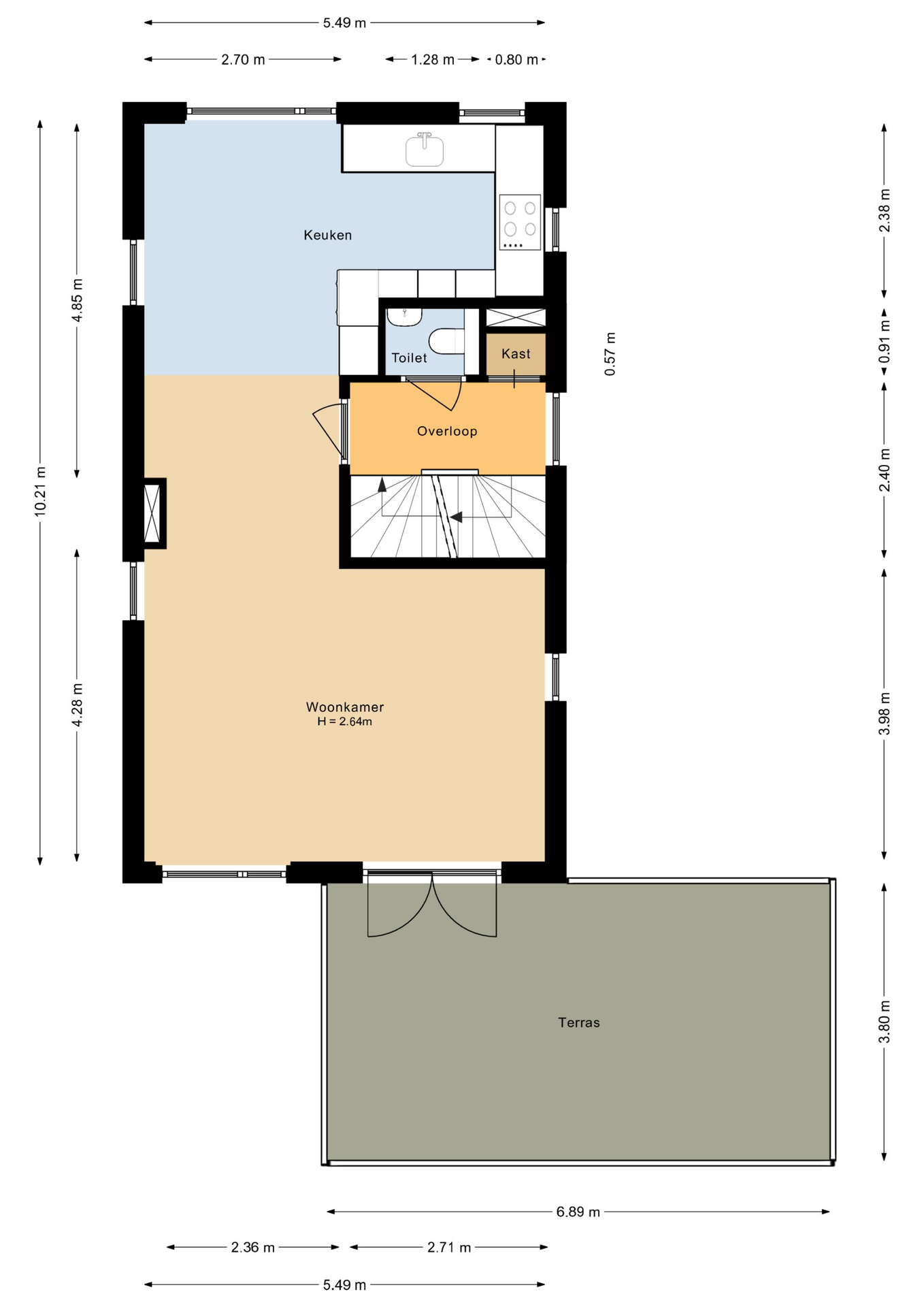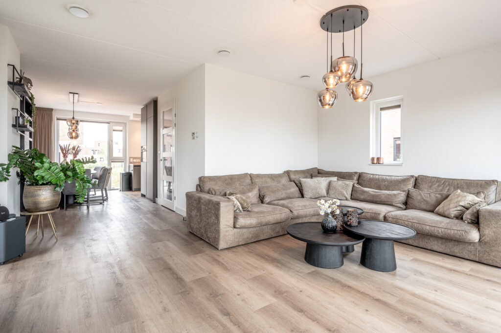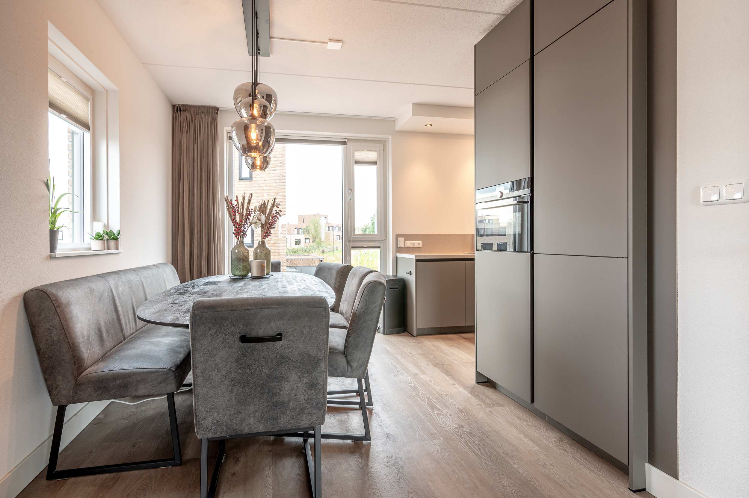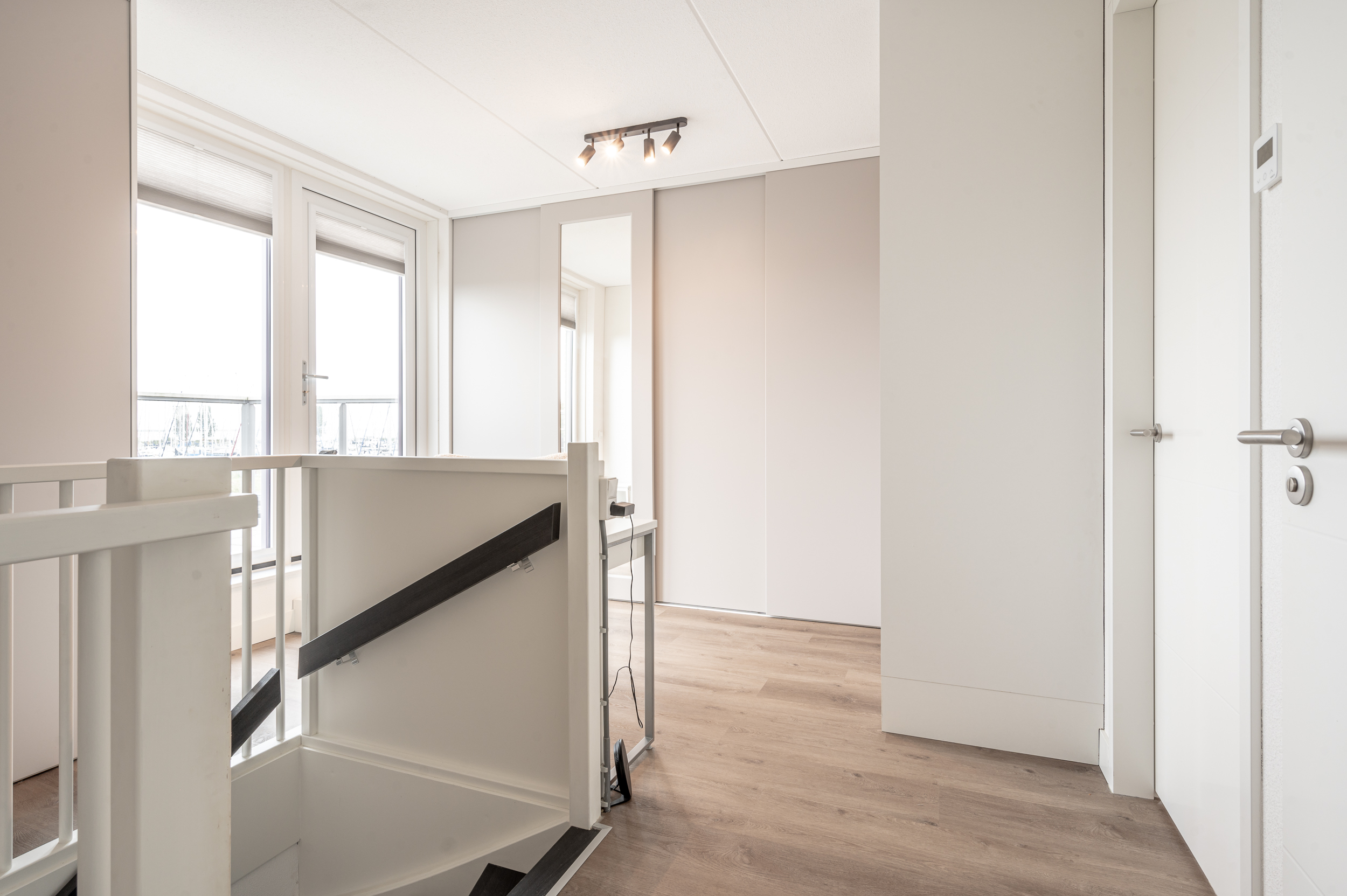 Overloop met de toiletruimte, een praktische bergkast en toegang tot de woonkamer/keuken. Ruime tuingerichte woonkamer met grote raampartijen (veel lichtinval!) en middels dubbele openslaande deuren toegang tot het dakterras (ca. 26 m2) met een ligging op het noordwesten. Het dakterras is bijzonder ruim te noemen en biedt voldoende ruimte voor een grote eettafel en een lounge set, zodat u hier heerlijk met uw familie en vrienden kunt vertoeven. Daarnaast geeft het dakterras een heerlijk vrij uitzicht over de Houtribhaven en het groen! De verdieping is voorzien van een fraaie PVC-vloer met vloerverwarming.