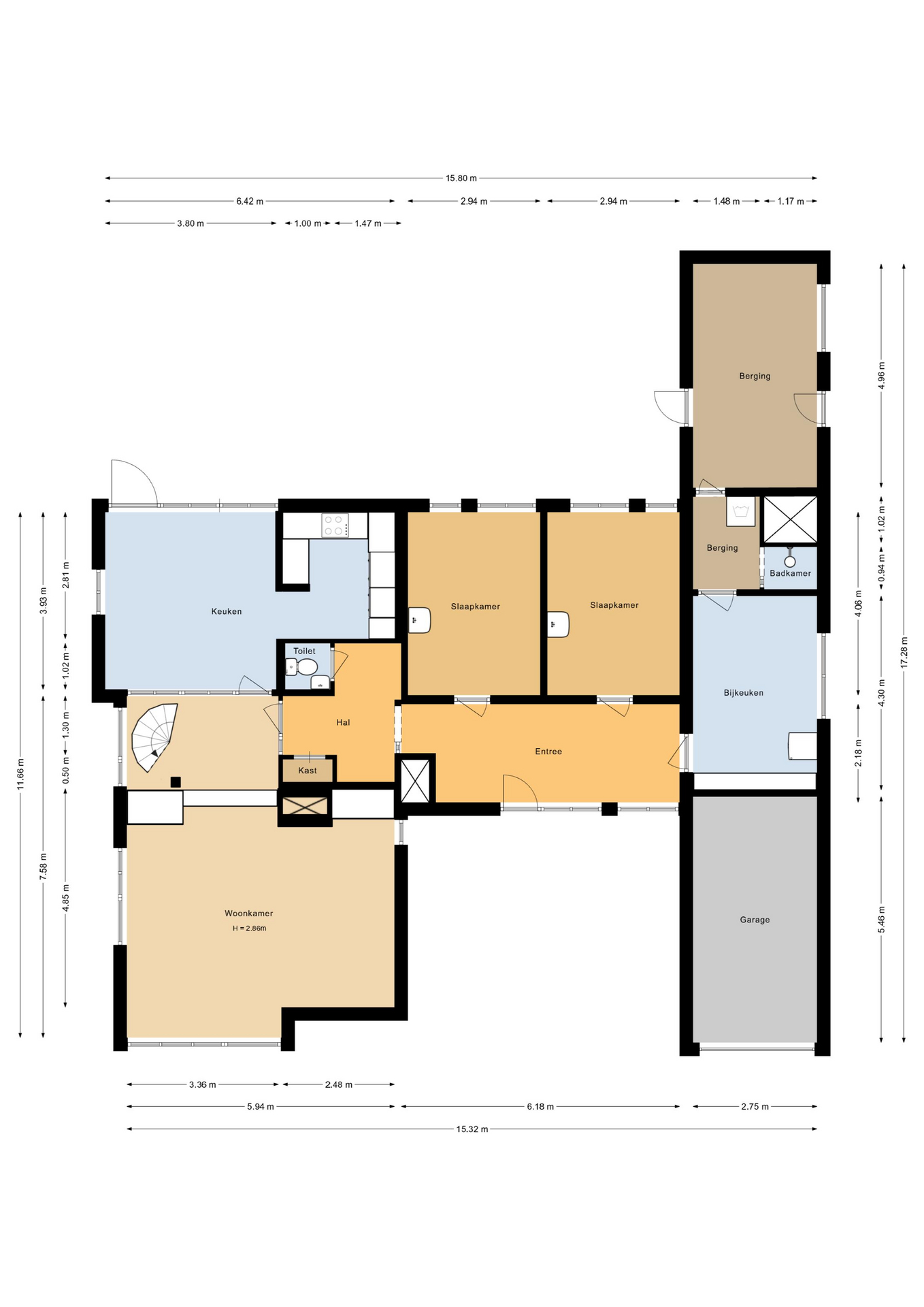 Naast de indrukwekkende woonruimtes beschikt deze villa ook over een aangebouwde stenen garage van circa 15 m² en een berging van circa 14 m², ideaal voor het opbergen van spullen of het stallen van uw auto of motor.