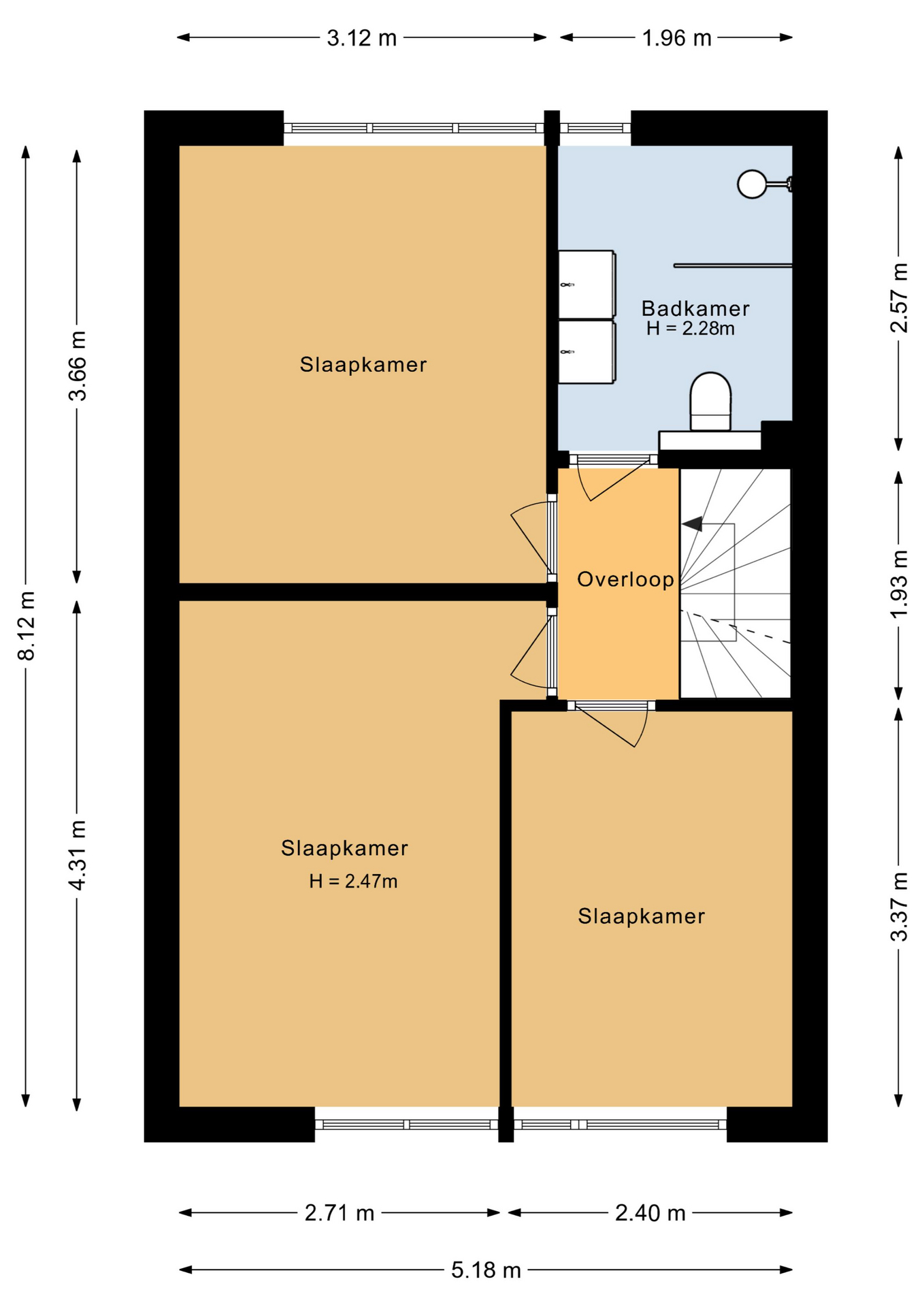 Overloop, slaapkamer 1 (ca. 11 m²), slaapkamer 2 (ca. 12 m²), slaapkamer 3 (ca. 8 m²), moderne badkamer voorzien van vloerverwarming, toilet, inloopdouche en dubbele wastafel met meubel.