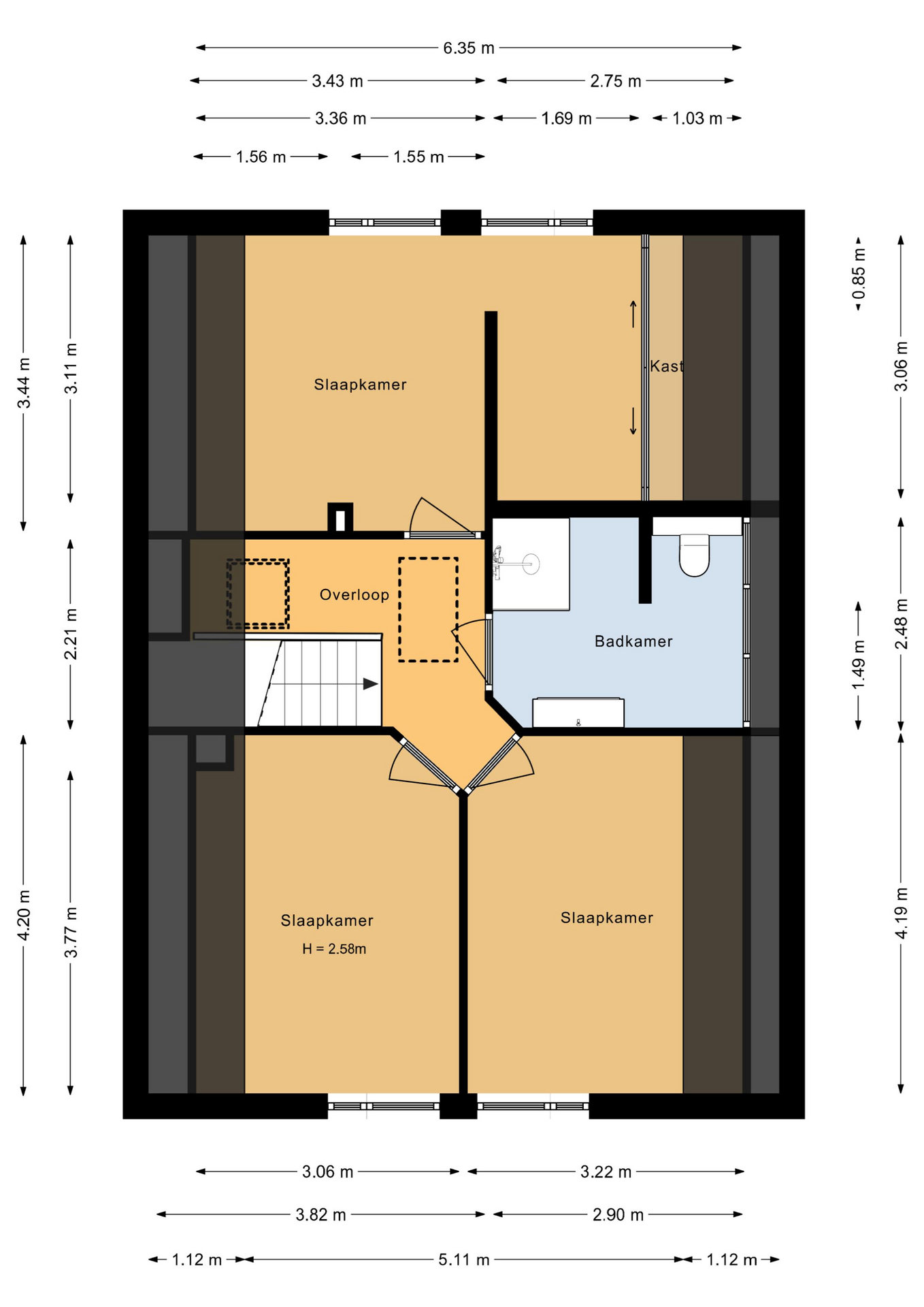 Overloop met toegang tot 3 ruime slaapkamers, waarbij de ouderslaapkamer over de volle breedte van de woning en voorzien van een walk-in-closet. De moderne badkamer (2021) met dakkapel (2021) is voorzien van een inloopdouche, 2e toilet, wastafelmeubel met dubbele kraan, hoge kast en een designradiator. De verdieping is voorzien van glad gestuukte wanden (2021) en een fraaie laminaatvloer.