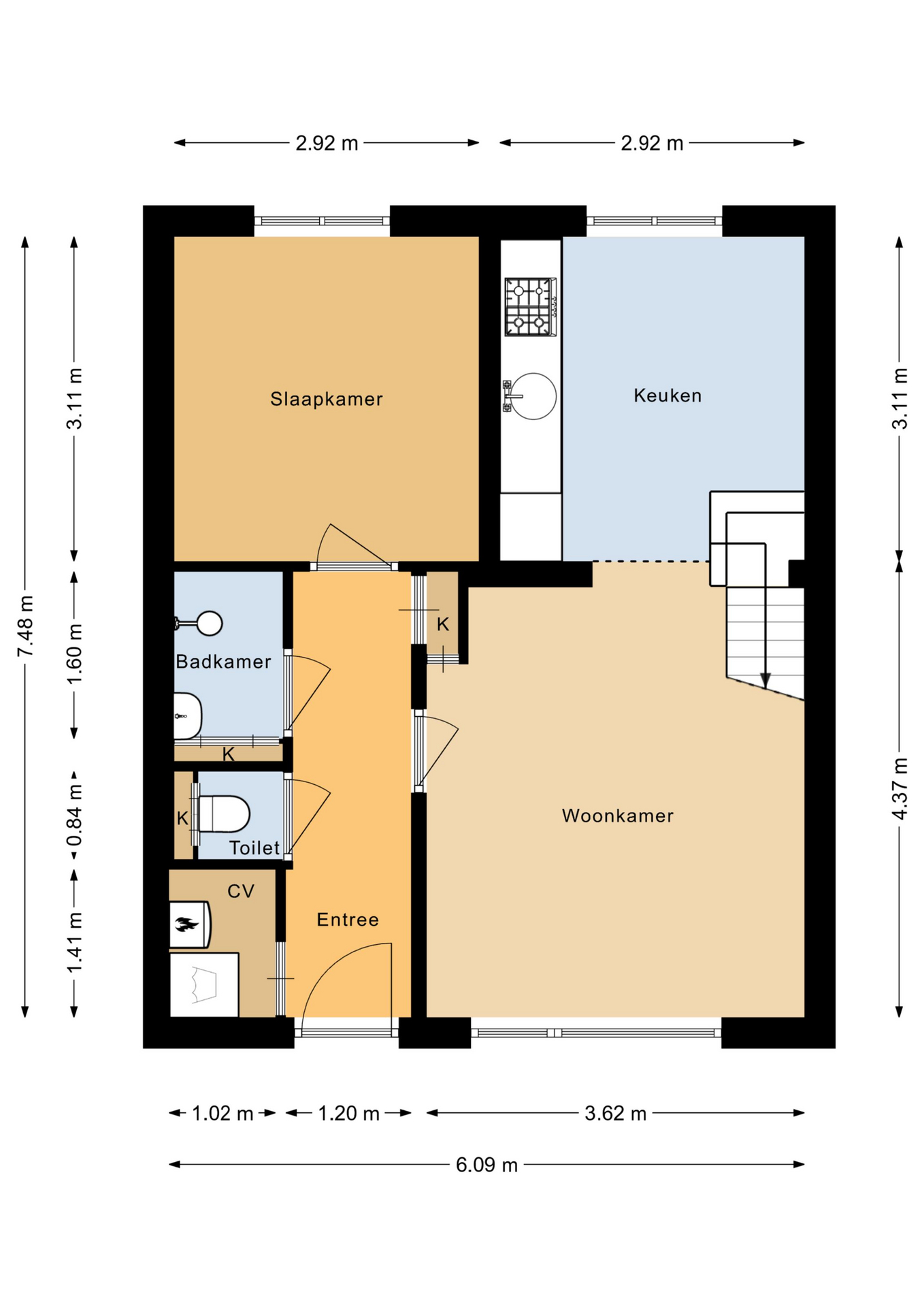 Entree/hal met de technische ruimte met de opstelplaats van de wasmachineaansluiting en cv-installatie (2006), toiletruimte, badkamer met douche en wastafel, meterkast en toegang tot diverse vertrekken. Een heerlijke woonkamer met een groot raamkozijn (veel lichtinval) en doorloop naar de nette inbouwkeuken, welke voorzien is van de volgende apparatuur; koelkast, vriezer, vaatwasser, oven, 4-pits gaskookplaat en een afzuigkap. Opstelmogelijk voor een eettafel waar u u heerlijk met uw vrienden en familie kunt dineren. Aan de achterzijde bevindt zich de slaapkamer (ca. 9 m2). Vanuit de slaapkamer heeft u een schitterend weids uitzicht over het Markermeer! De woonverdieping is voorzien van een laminaatvloer.