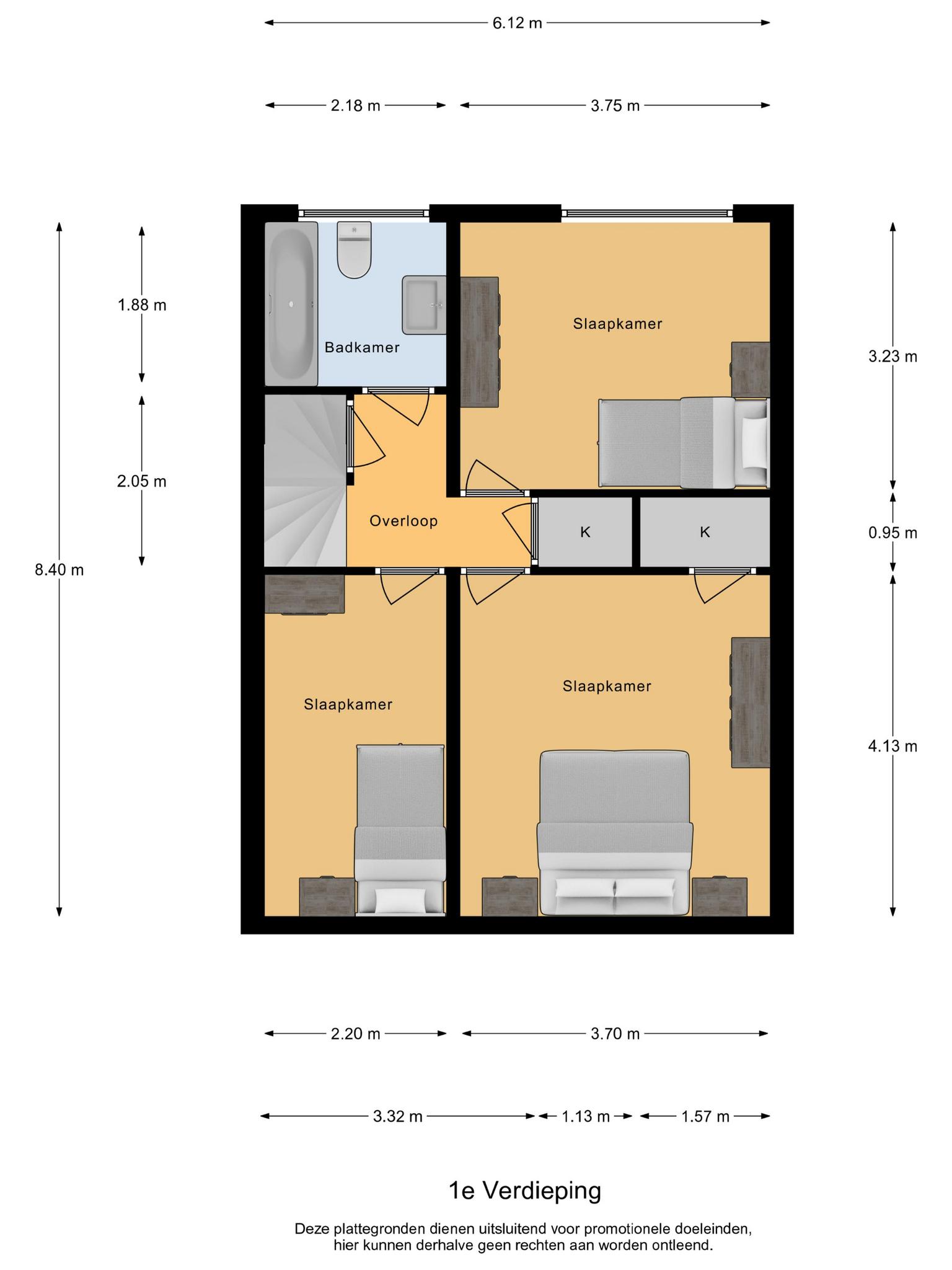 Overloop met bergkast en toegang tot 3 ruime slaapkamers (ca. 15 / 12 / 9 m2), waarbij de ouderslaapkamer is voorzien van een vaste kast. Nette, volledig betegelde badkamer (2015) voorzien van een ligbad, wastafelmeubel, 2e toilet, een designradiator en een raam voor de natuurlijke ventilatie. De verdieping is voorzien van een vinylvloer.