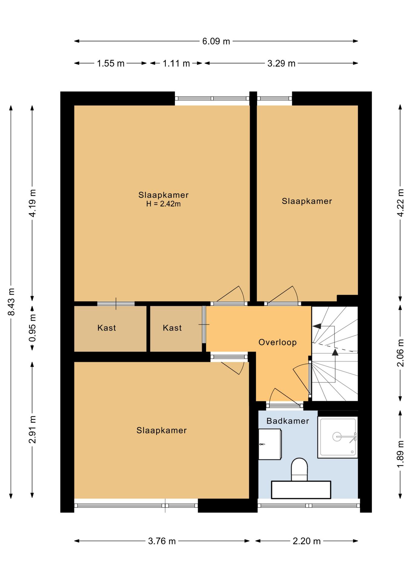 Overloop met een bergkast en toegang tot 3 ruime slaapkamers, waarvan 1 slaapkamer voorzien is van een vaste kast. Geheel betegelde badkamer met een douche, 2e toilet, wastafel, vloerverwarming en een raam voor de natuurlijke ventilatie. De verdieping is voorzien van een laminaatvloer (2022).