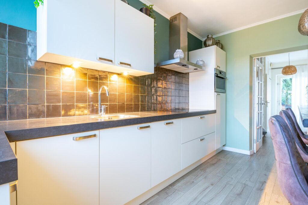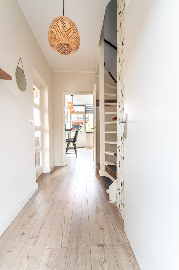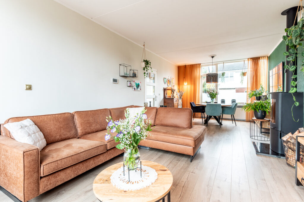 Entree/hal met de meterkast (2022), toiletruimte, trapopgang naar de verdieping en toegang naar de keuken en woonkamer. Een heerlijke ruime woonkamer van ca. 31 m2, welke zowel tuingericht alsmede straatgericht kan worden ingericht. De woonkamer is voorzien van grote raampartijen met veel lichtinval, een sfeervolle houtkachel (2020) en biedt ruime opstelmogelijkheden voor een grote eettafel, waar u heerlijk met vrienden en familie kunt dineren. Aan de achterzijde bevindt zich de fraaie inbouwkeuken (2019), welke voorzien is van de volgende apparatuur; koelkast, vaatwasser, combimagnetron, 5-pits inductiekookplaat (2022) en een afzuigkap. De begane grond is voorzien van een laminaatvloer.