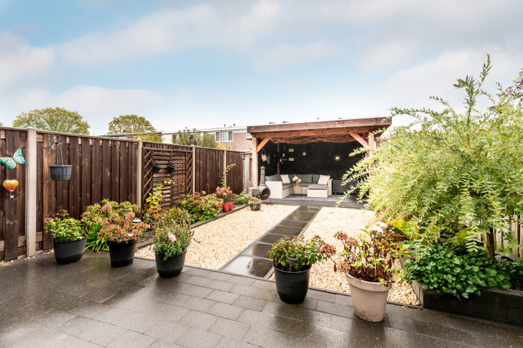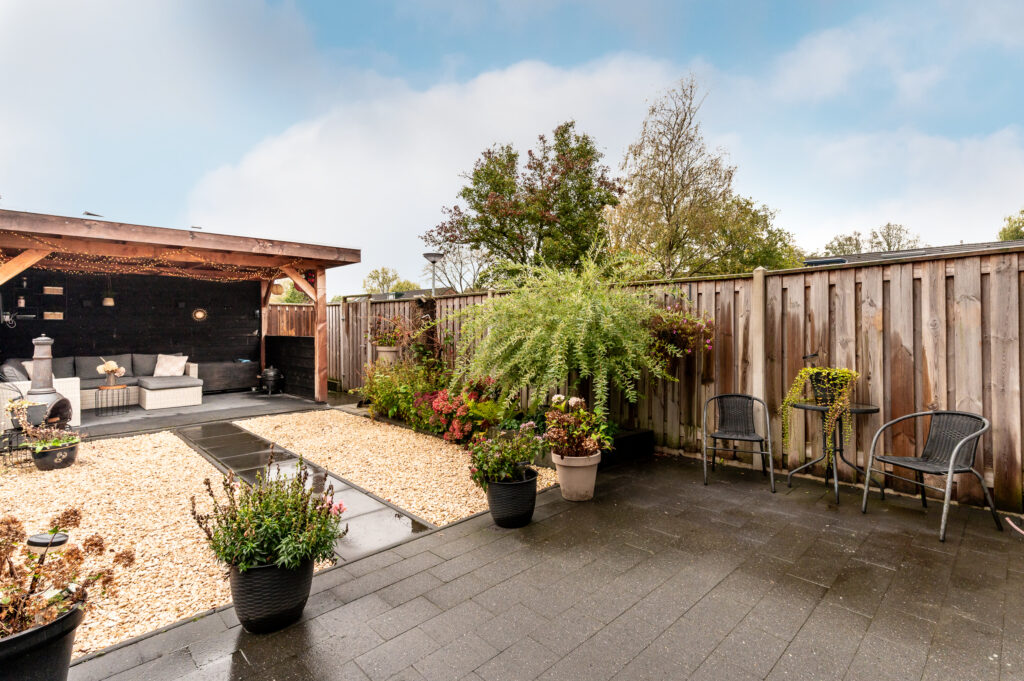 De fraai aangelegde tuin is gelegen op het oosten en voorzien van een groot terras met bestrating, borders met beplanting, siergrind, een schitterende houten overkapping en een praktische achterom. Onder de overkapping is het heerlijk vertoeven tijdens ieder seizoen! De tuin wordt omheind middels hout/beton schuttingen en geeft veel privacy!