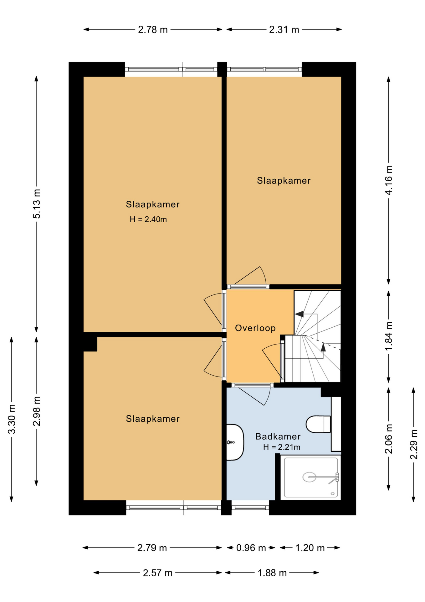 Overloop met toegang tot 3 ruime slaapkamers (ca. 14 / 10 / 9 m2). Volledig betegelde badkamer met een douche, 2e toilet, wastafelmeubel, designradiator en een raam voor de natuurlijke ventilatie. De verdieping is voorzien van een vinylvloer.