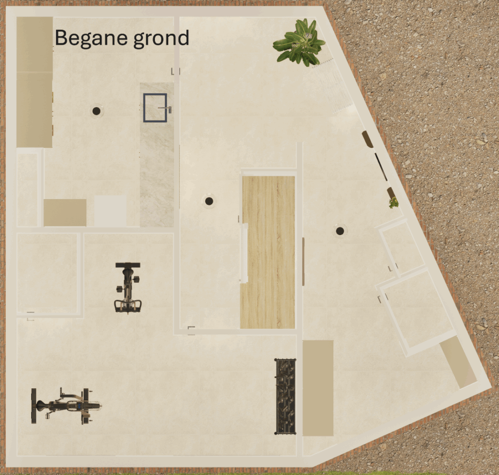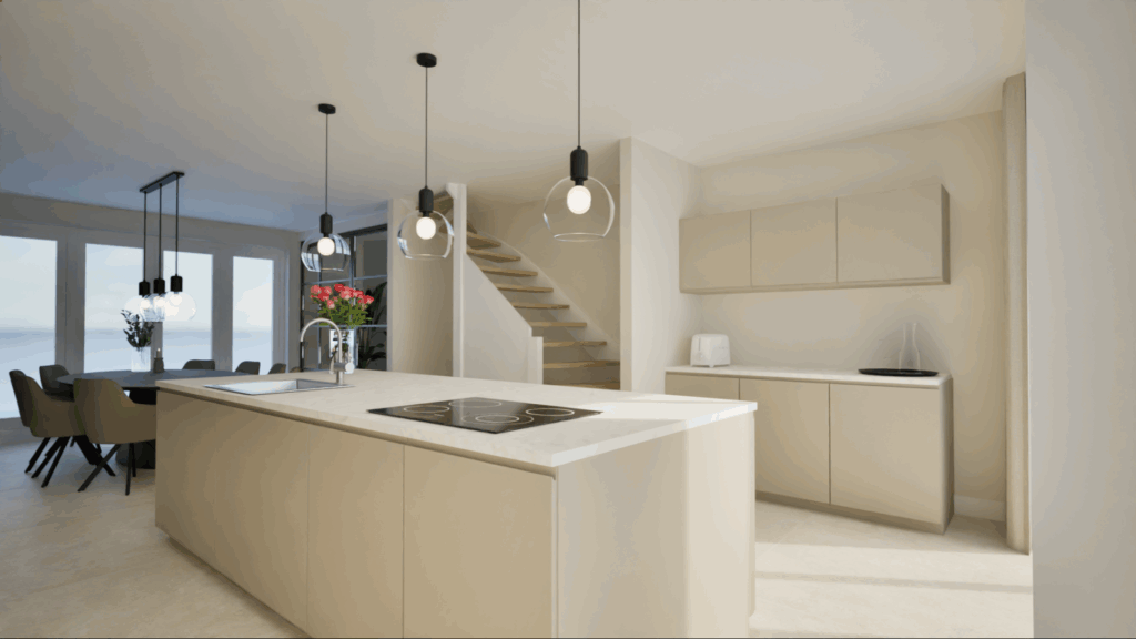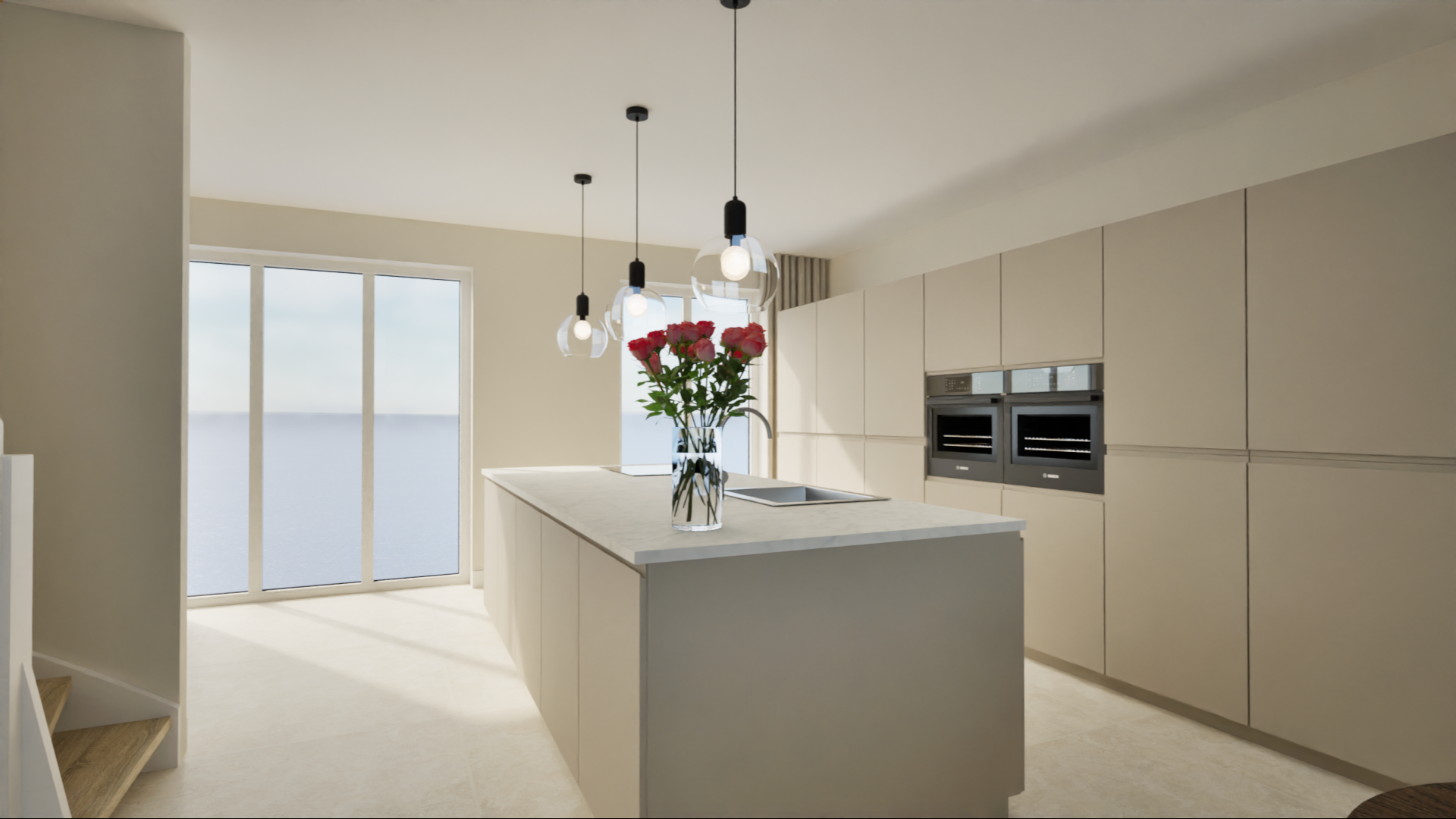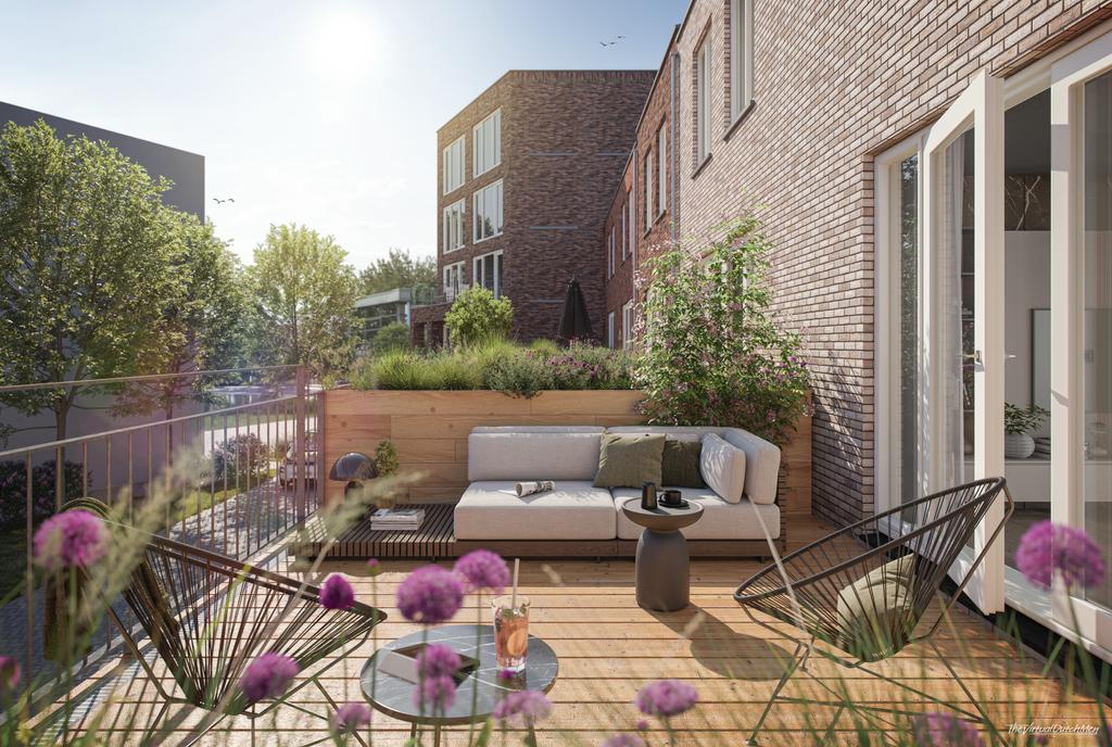Hier bevindt zich de ruime woonkeuken met aansluitingen voor een kookeiland. De woonkamer is voorzien van openslaande deuren naar het zonnige terras van circa 15 m². Via een vaste trap bereik je de tweede verdieping.