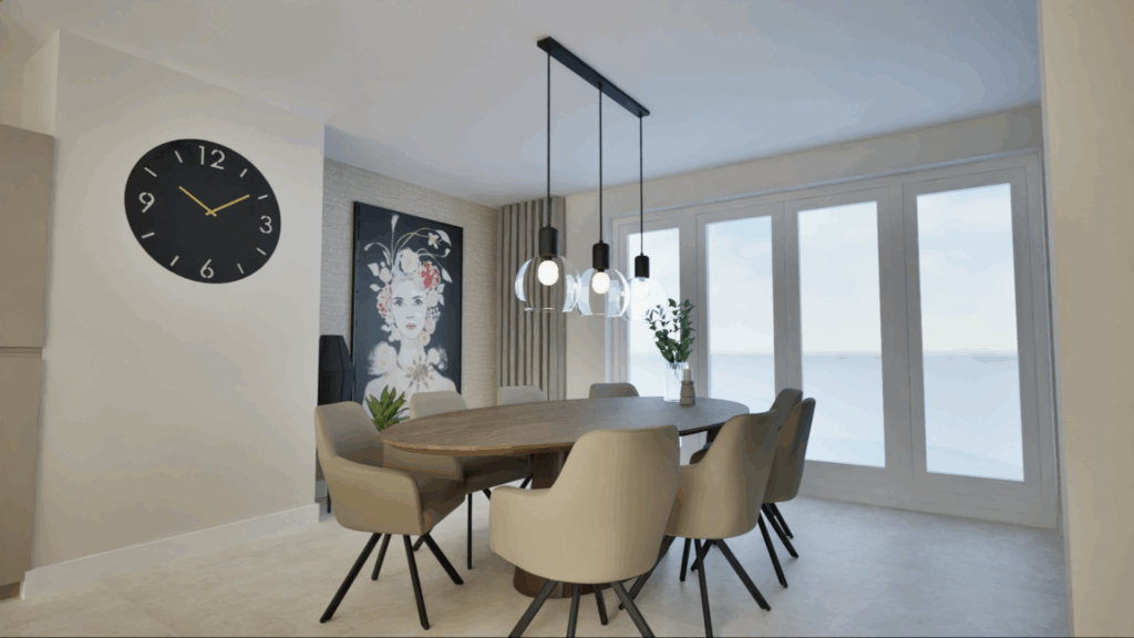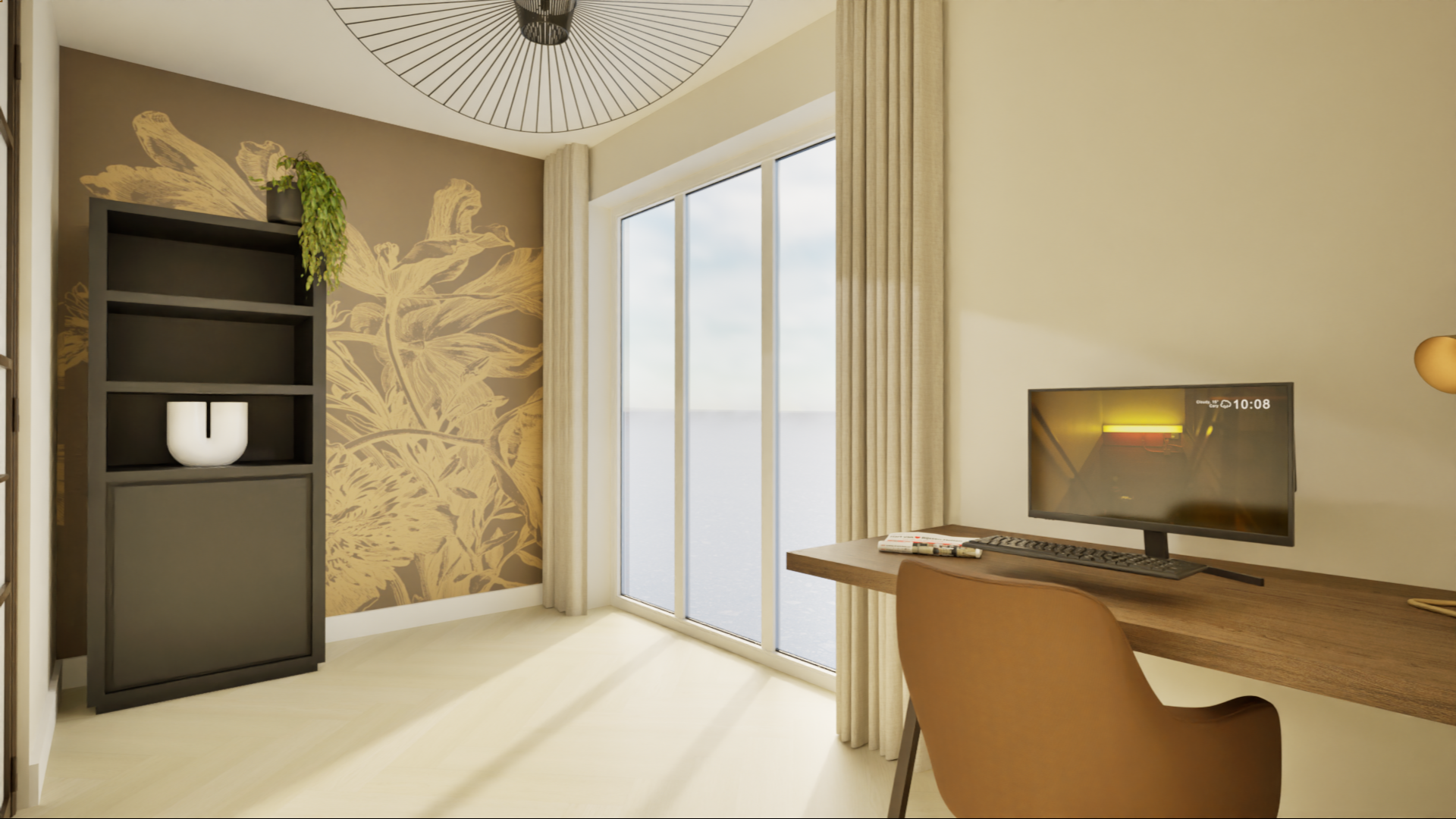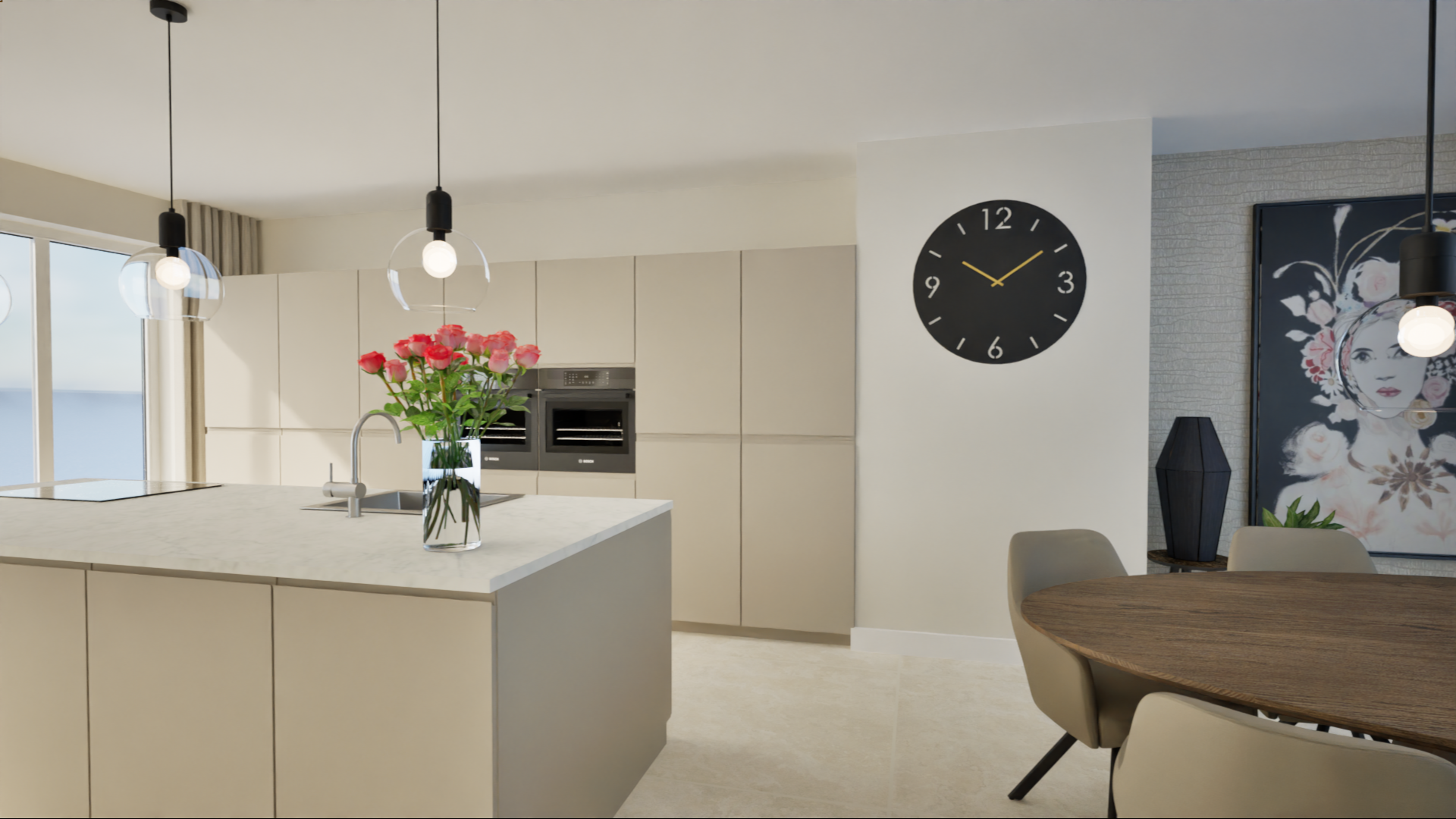 Hier bevindt zich de ruime woonkeuken met aansluitingen voor een kookeiland. De woonkamer is voorzien van openslaande deuren naar het zonnige terras van circa 15 m². Via een vaste trap bereik je de tweede verdieping.