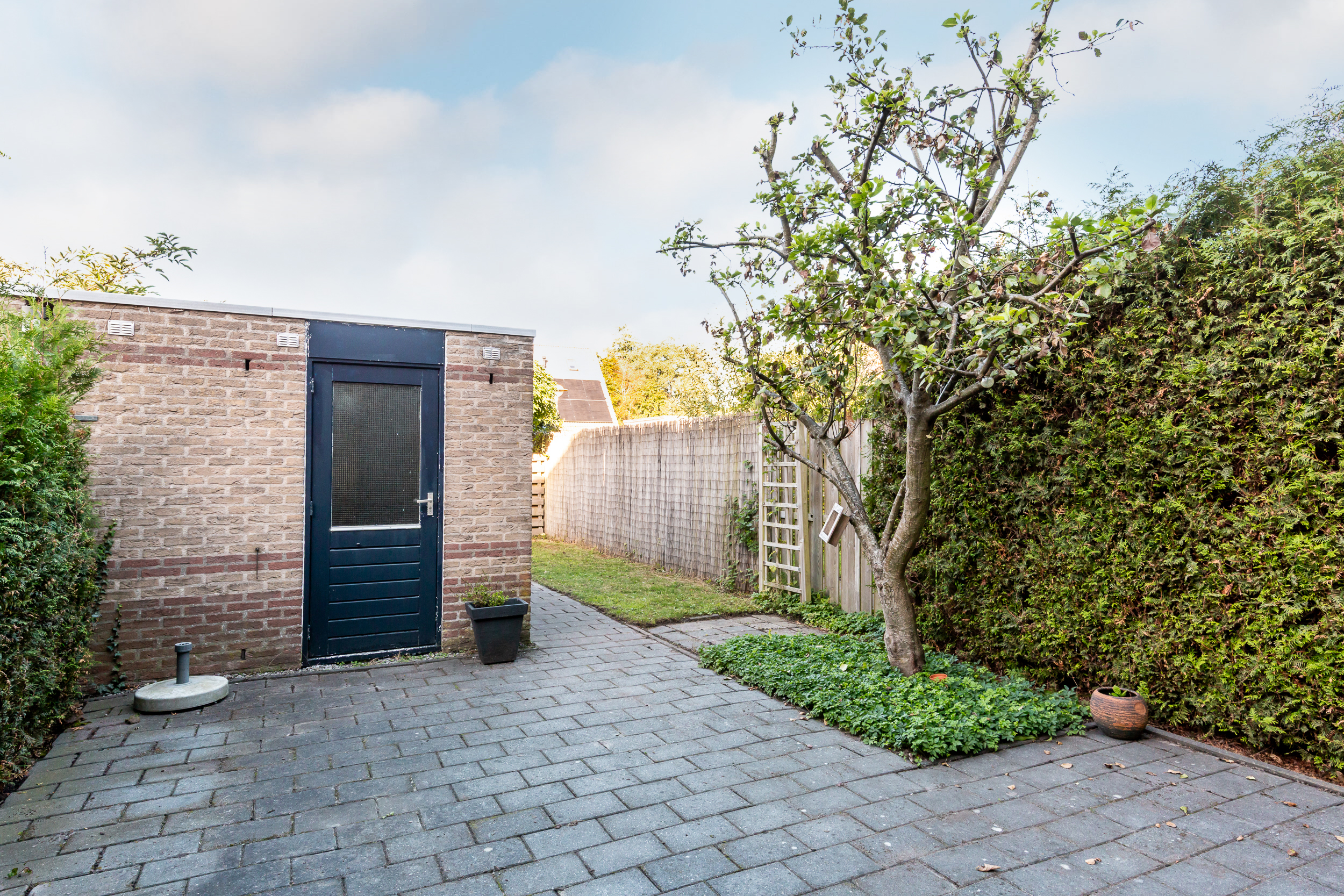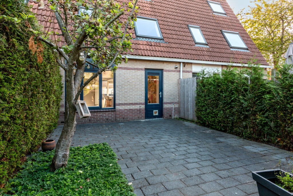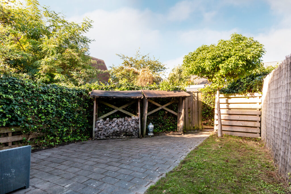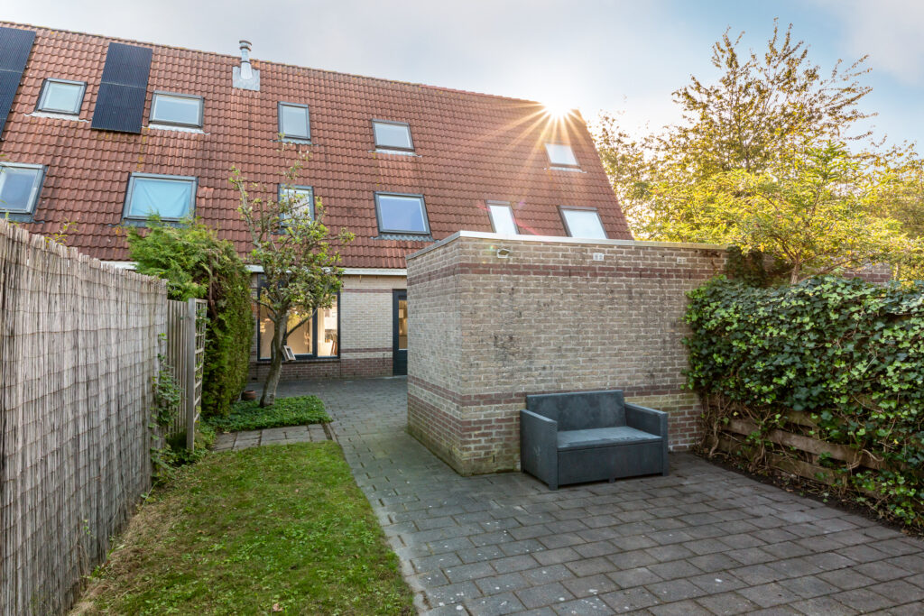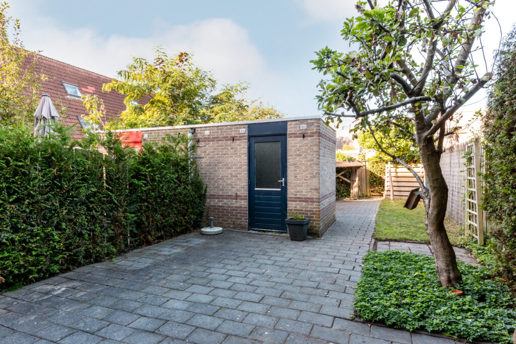 De zonnige achtertuin is op het westen gesitueerd en heeft een stenen berging. De tuin beschikt over diverse zitjes en is onderhoudsvriendelijk aangelegd en achterom toegankelijk. De schutting aan de rechterzijde is in 2018 gedeeltelijk vernieuwd.