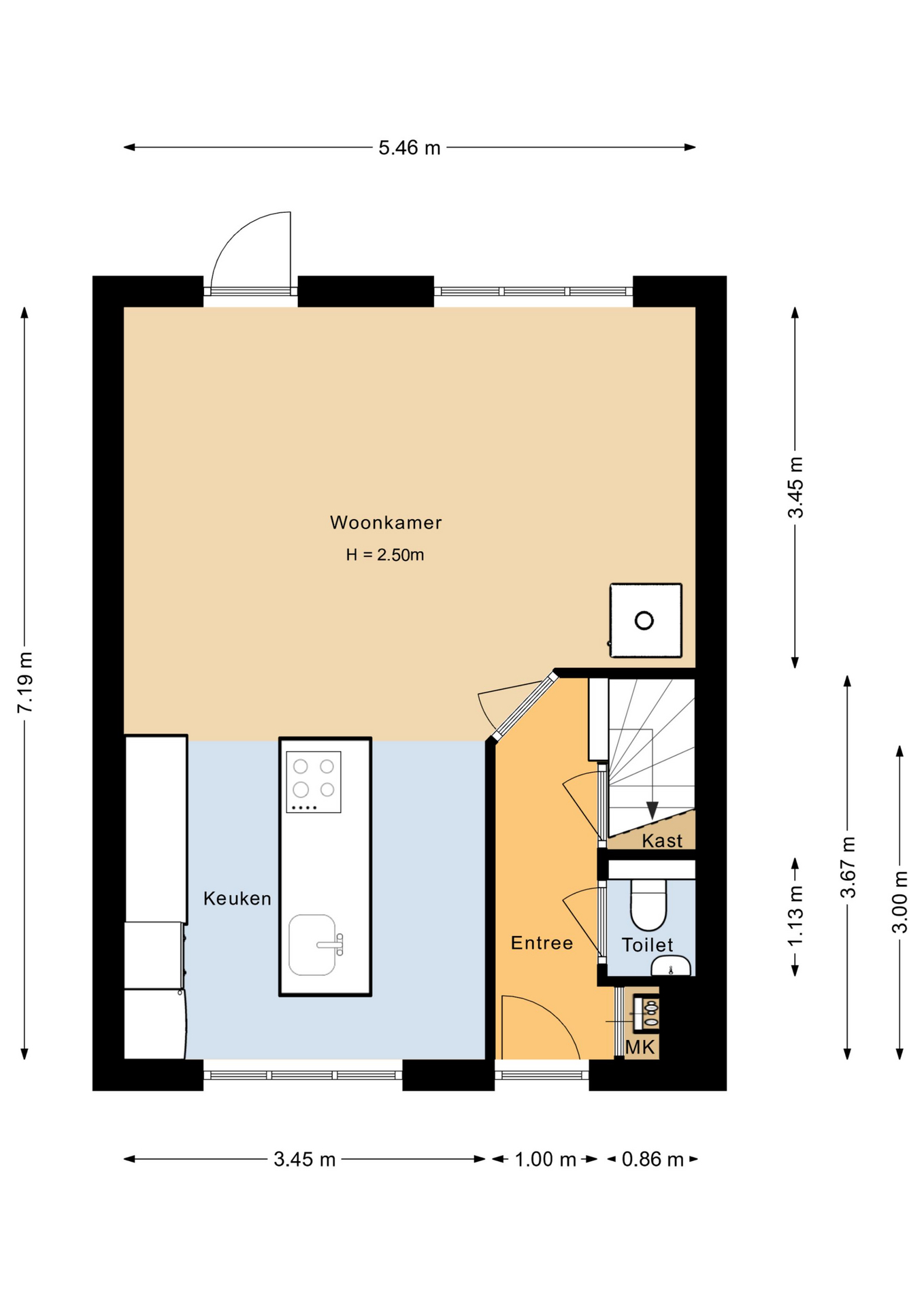 Entree/hal, meterkast, half betegelde toiletruimte (2020) met vrijdragend closet en fontein, trapopgang en deur naar de woonkamer. De tuingerichte woonkamer beschikt over een deur naar de achtertuin en een sfeervolle houtkachel. De wanden in de woonkamer zijn gedeeltelijk gestuct. De luxe keuken heeft een kookeiland met een design inbouw afzuigsysteem met een verlaagd plafond en inbouwspots. De keuken is uitgerust met een composiet stenen werkblad, inductie kookplaat, vaatwasser, oven, magnetron, koel/ vries- combinatie en afzuigkap. De hal en de woonkamer zijn voorzien van een laminaatvloer, de keuken heeft een plavuizen vloer.