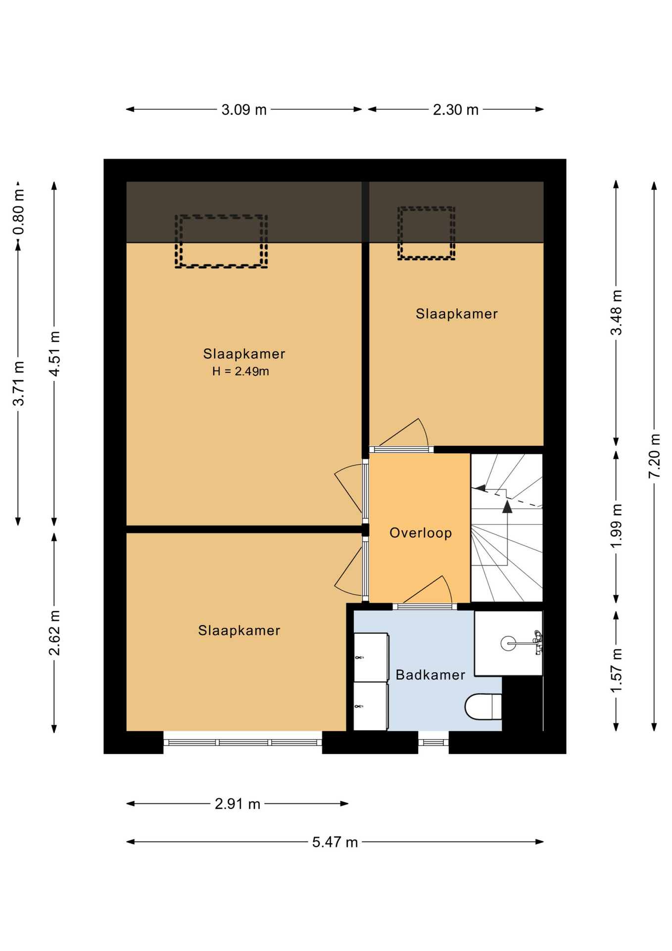 Overloop met 3 ruime slaapkamers en een badkamer. Slaapkamer één gelegen aan de voorzijde van de woning, slaapkamer twee, de masterbedroom, met veel lichtinval door het in 2018 geplaatste dakraam en slaapkamer drie gelegen aan de achterzijde van de woning. De modern ingerichte badkamer (2020) is volledig betegeld en uitgerust met vrijdragend closet, inloopdouche met regen- en handdouche en glazendeur, dubbel wastafelmeubel en designradiator. De badkamer is voorzien van een vloerverwarming en mechanische ventilatie.