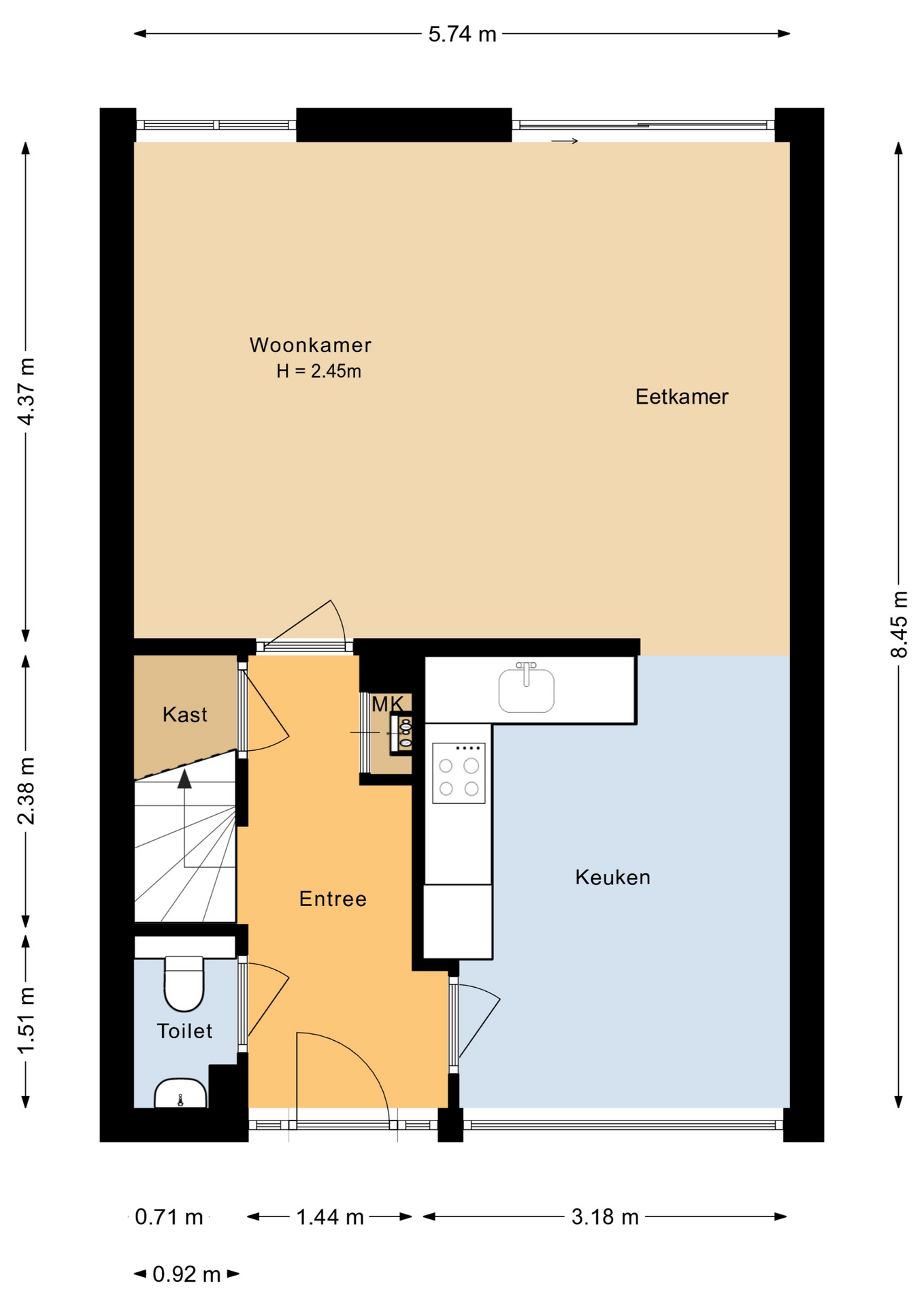 Entree/hal met de toiletruimte, garderobe, meterkast, trapopgang naar de verdieping, bergkast en toegang tot de keuken en woonkamer. Een heerlijke lichte woonkamer van maar liefst 5.74 m. breed met grote raampartijen en middels een aluminium schuifpui toegang tot de verzorgd aangelegde tuin met een ligging op het zuiden! Aan de voorzijde bevindt zich de nette inbouwkeuken in hoekopstelling, welke voorzien is van de volgende apparatuur; koelkast, vriezer, vaatwasser, oven, 4-pits inductiekookplaat en een afzuigkap. Vanuit de keuken kijkt u heerlijk vrij weg over het vernieuwd aangelegde park. Ruime opstelmogelijkheden voor een grote eettafel waar u heerlijk met uw familie kunt dineren. De begane grond is voorzien van een laminaatvloer.