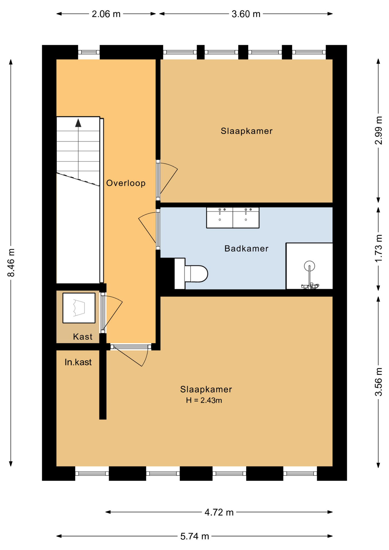 Overloop met toegang tot 2 ruime slaapkamers (ca. 18 en 11 m2), waarbij de ouderslaapkamer aan de voorzijde is voorzien van een walk-in-closet. Moderne badkamer met een (inloop)douche, wastafelmeubel met dubbele kraan, spiegelkast, hoge kast, 2e toilet en een designradiator. De verdieping is voorzien van een laminaatvloer.