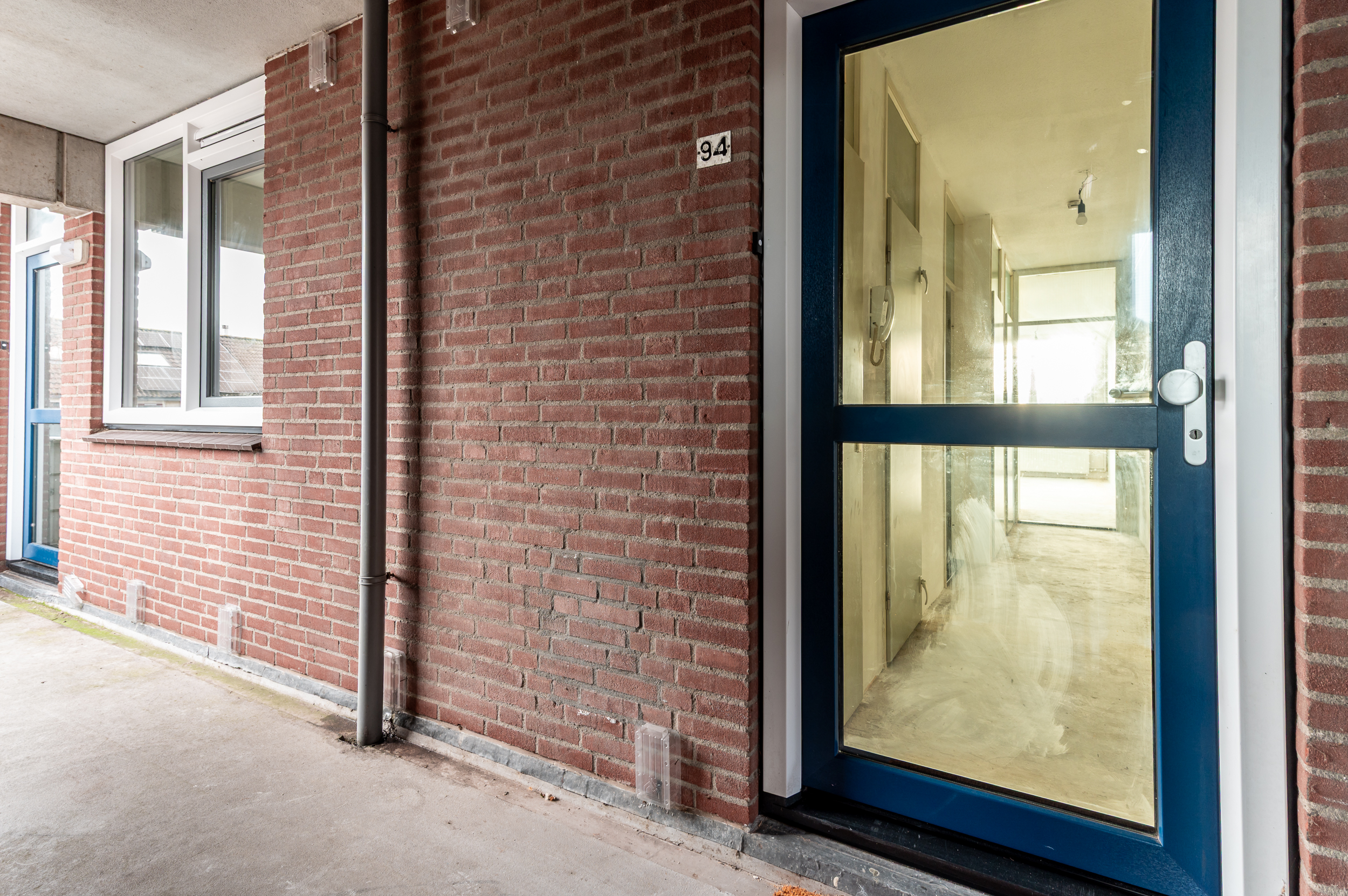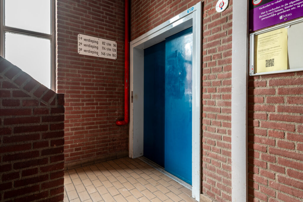 Entree van het appartementencomplex met trappenhuis, lift, brievenbussen en toegang tot de berging.