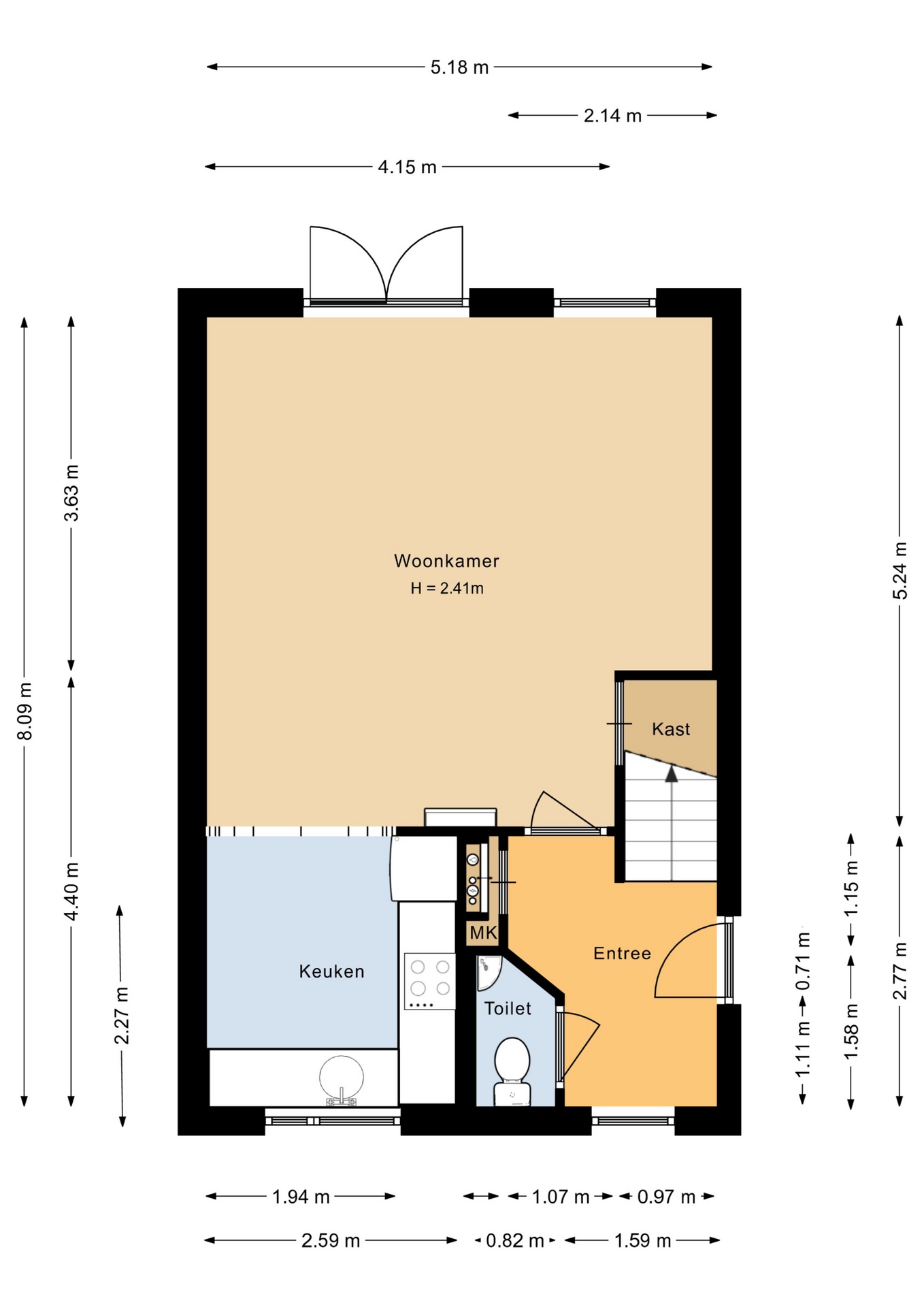 Entree/hal met de garderobe, toiletruimte, meterkast, bergkast, trapopgang naar de verdieping en toegang tot de woonkamer. Ruime tuingerichte woonkamer met grote raampartijen, een trapkast en dubbele openslaande deuren naar de tuin. Aan de voorzijde bevindt zich de nette inbouwkeuken in hoekopstelling, welke voorzien is van de volgende apparatuur; koelkast, vriezer, vaatwasser, oven, 4-pits kookplaat en een afzuigkap. Ruime opstelmogelijkheden voor een grote eettafel waar u heerlijk met uw familie kunt dineren. De begane grond is voorzien van een laminaatvloer.