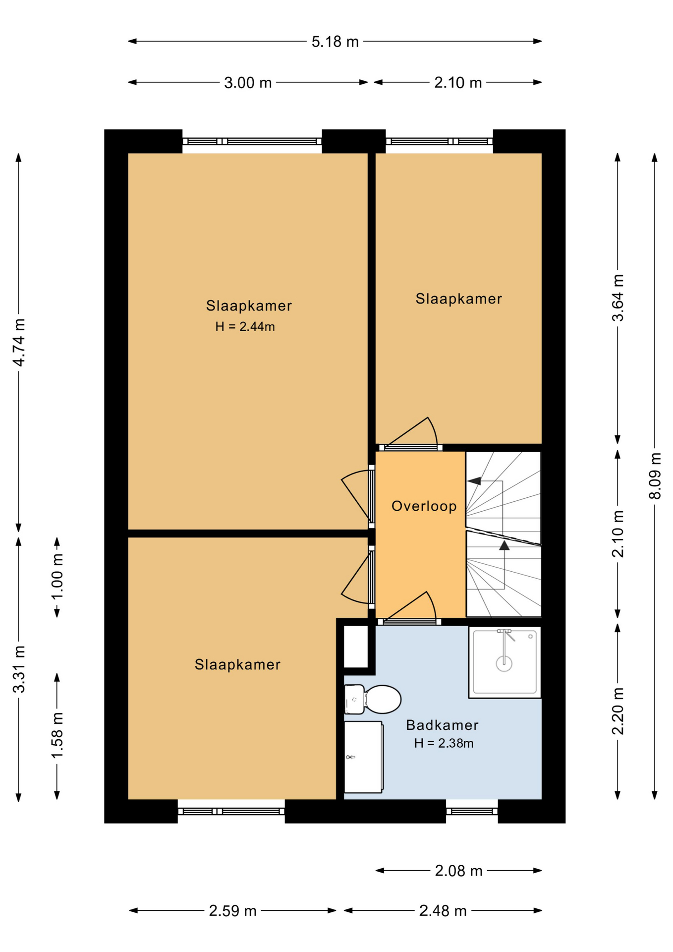 Overloop met toegang tot 3 in grote variërende slaapkamers (ca. 14 / 9 / 8 m2). Keurige badkamer met een douchehoek, 2e toilet, wastafelmeubel en een raam voor de natuurlijke ventilatie. De verdieping is voorzien van een laminaatvloer.