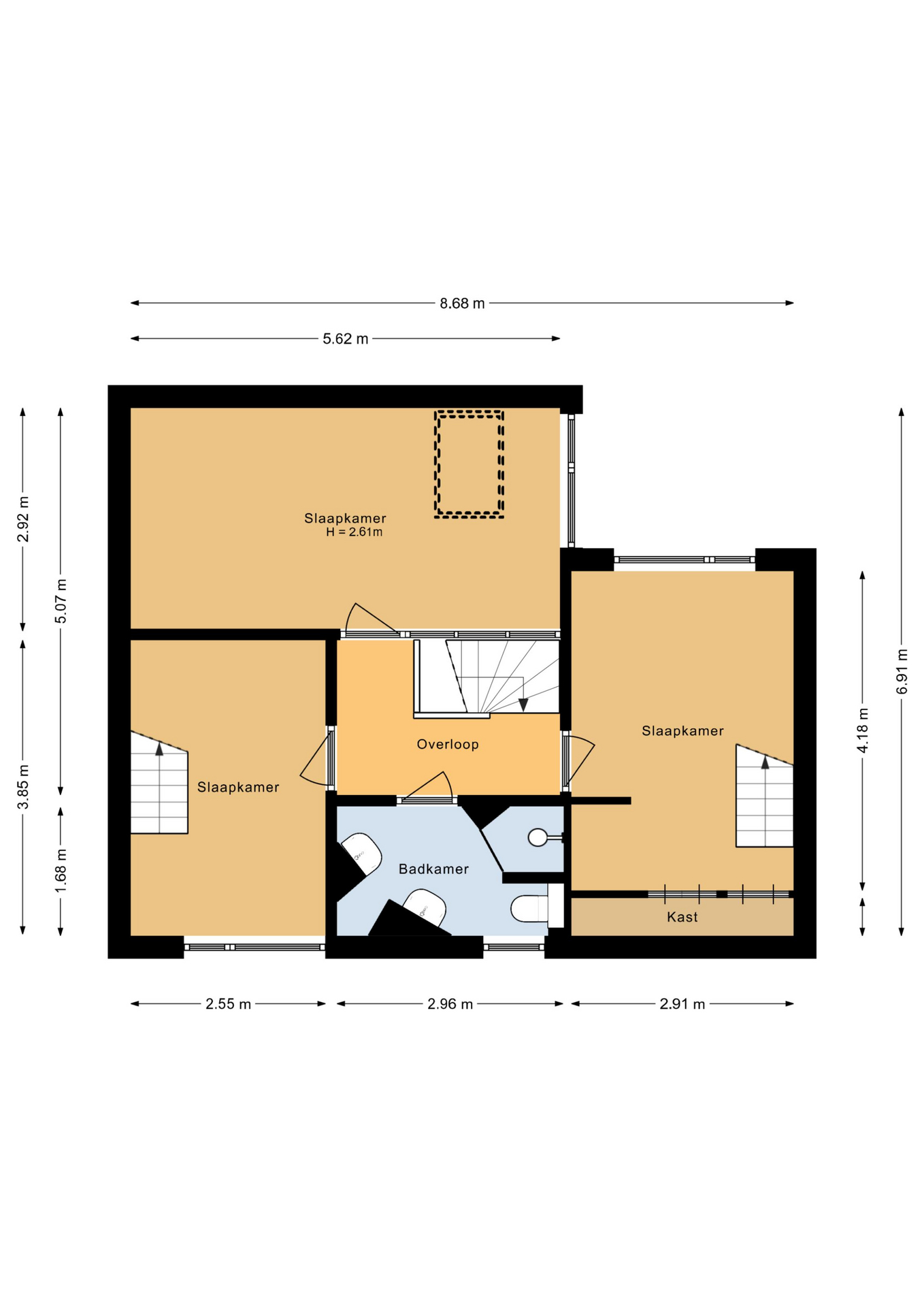 Middels een vaste trap, via 2 slaapkamers te bereiken verdieping met toegang tot 2 ruime slaapkamers (ca. 11 en 7 m2), beide met veel daglicht en praktische bergruimte. Technische ruimte met de opstelplaats van de cv-ketel (2012). De verdieping is voorzien van een parketvloer.