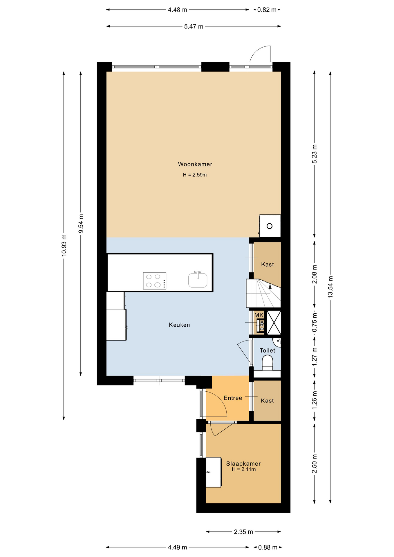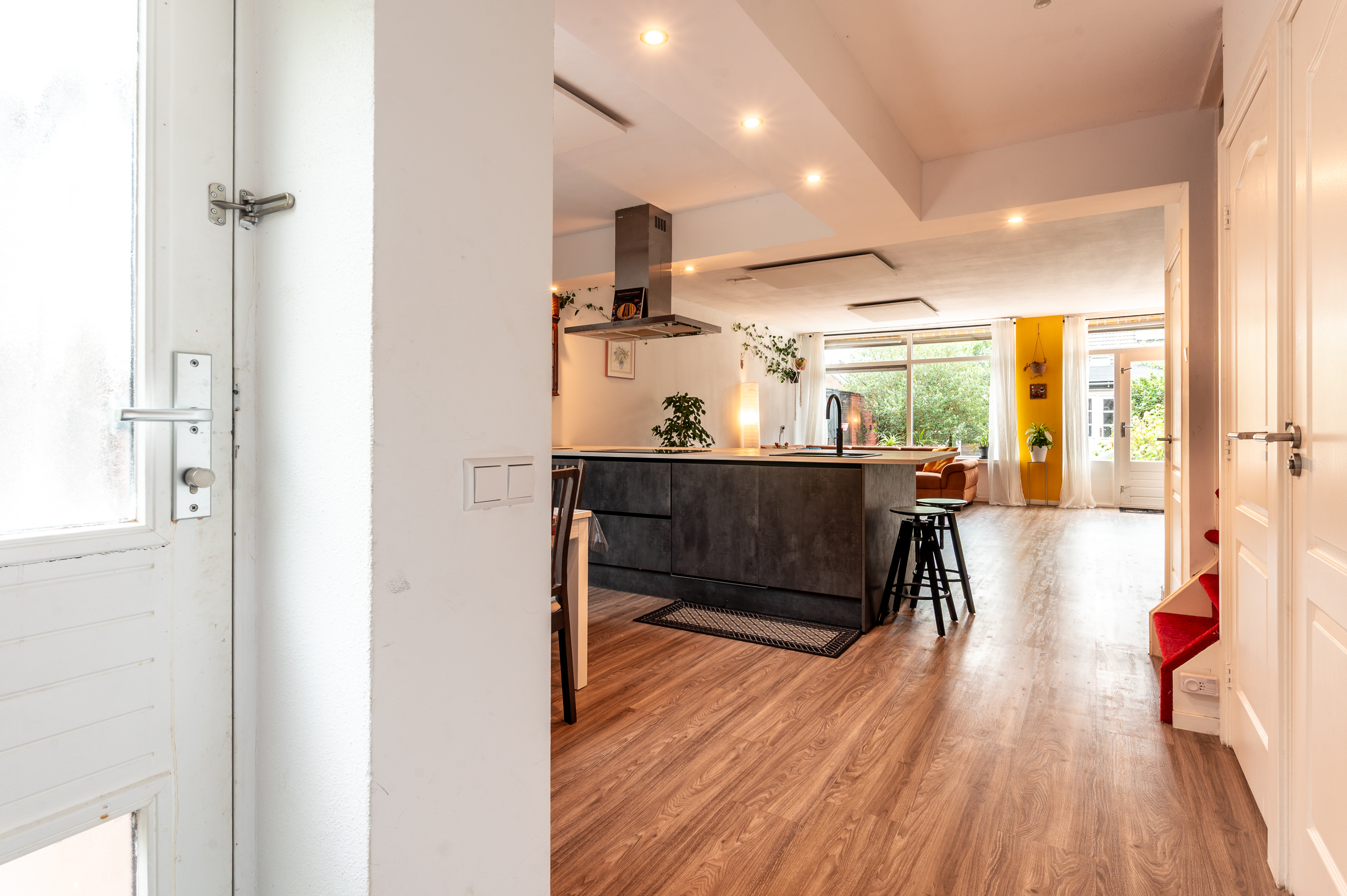 Entree, hal, vaste kast, modern toilet met fonteintje, open moderne keuken voorzien van inbouwapparatuur (onder andere Quooker), ruime en lichte woonkamer (ca. 29 m²) voorzien van speksteen houtkachel, trapkast, deur naar de achtertuin, slaapkamer één (ca. 6 m²) op de begane grond voorzien van wastafel met meubel en vliering.