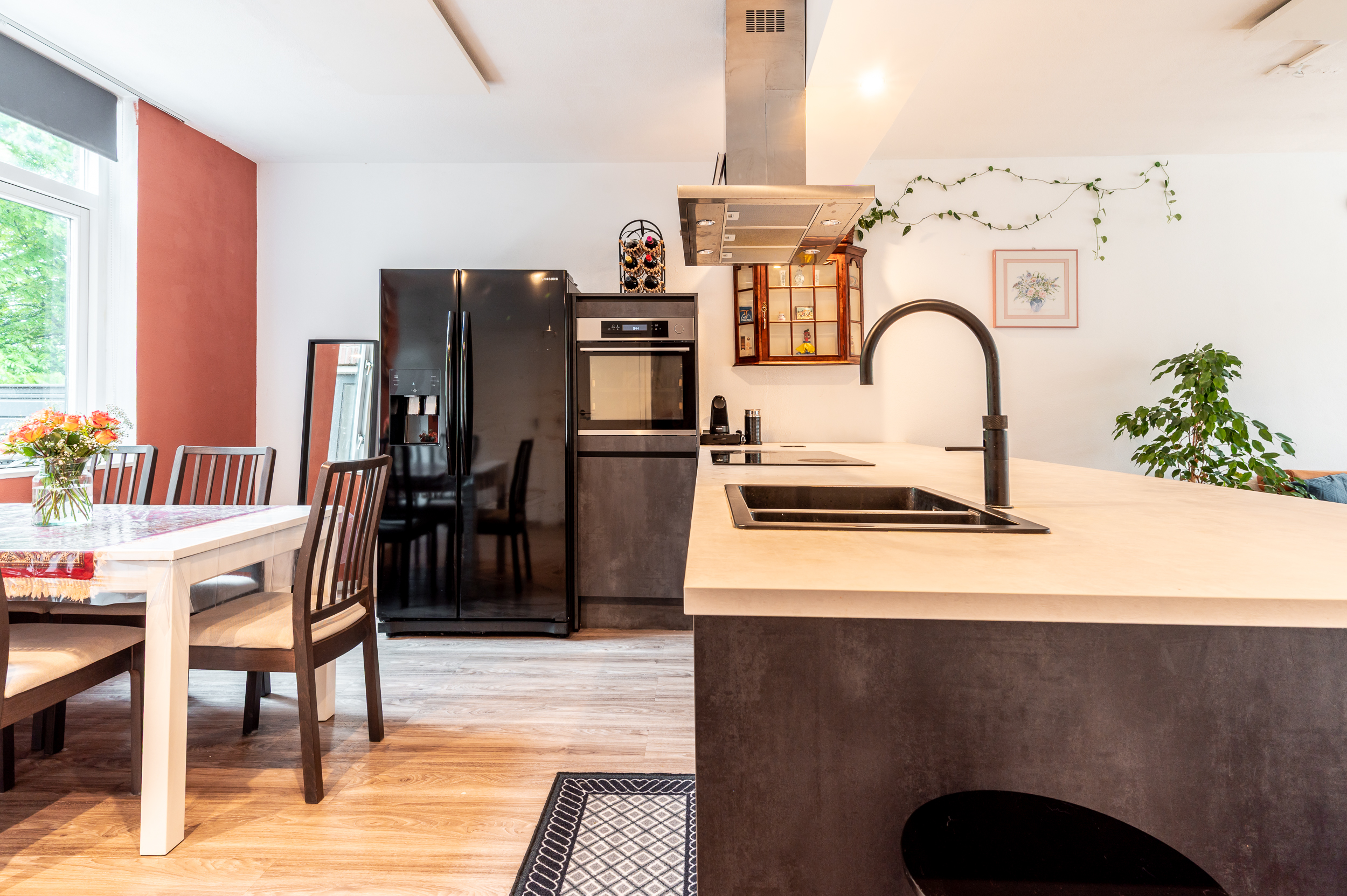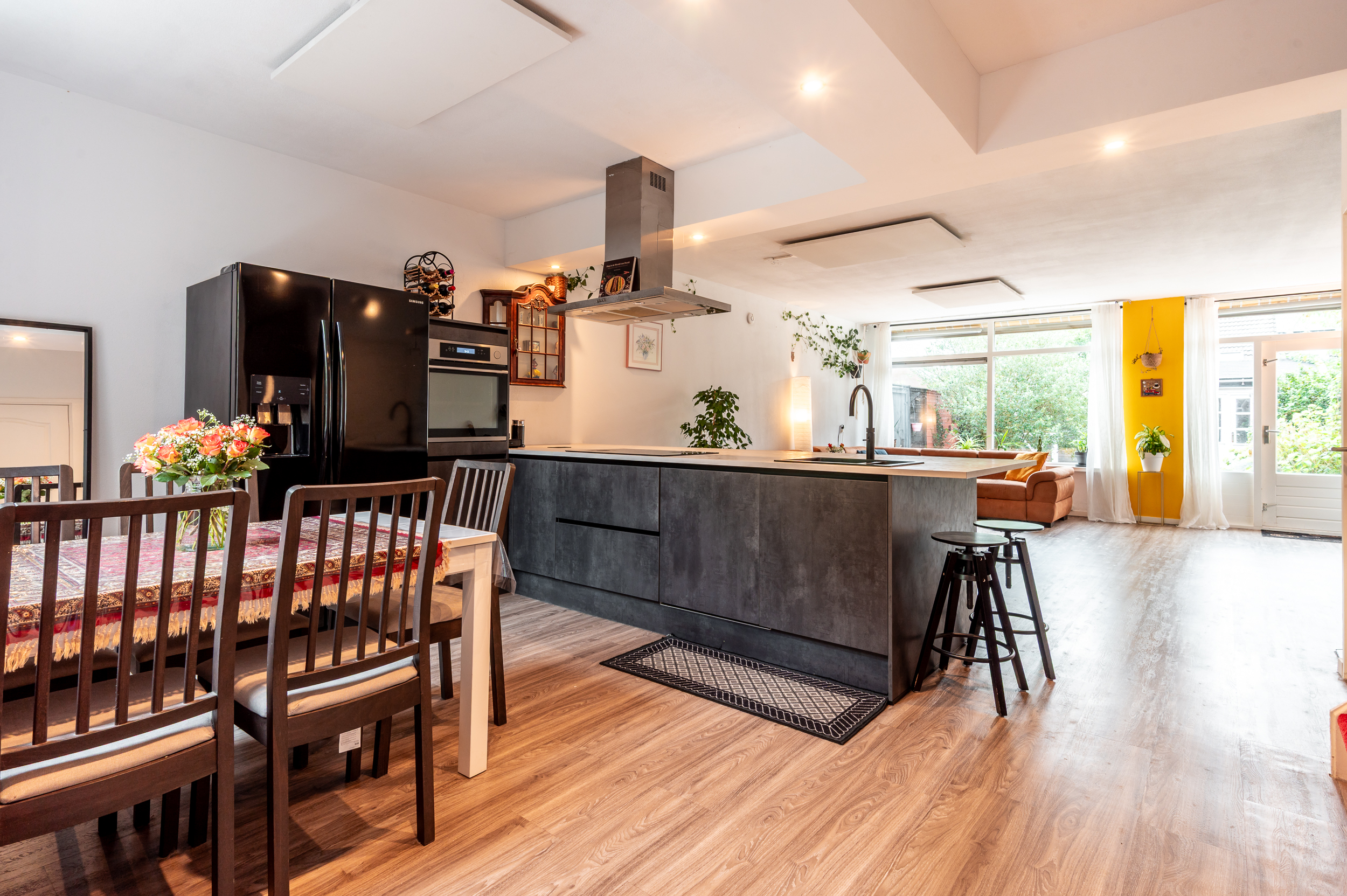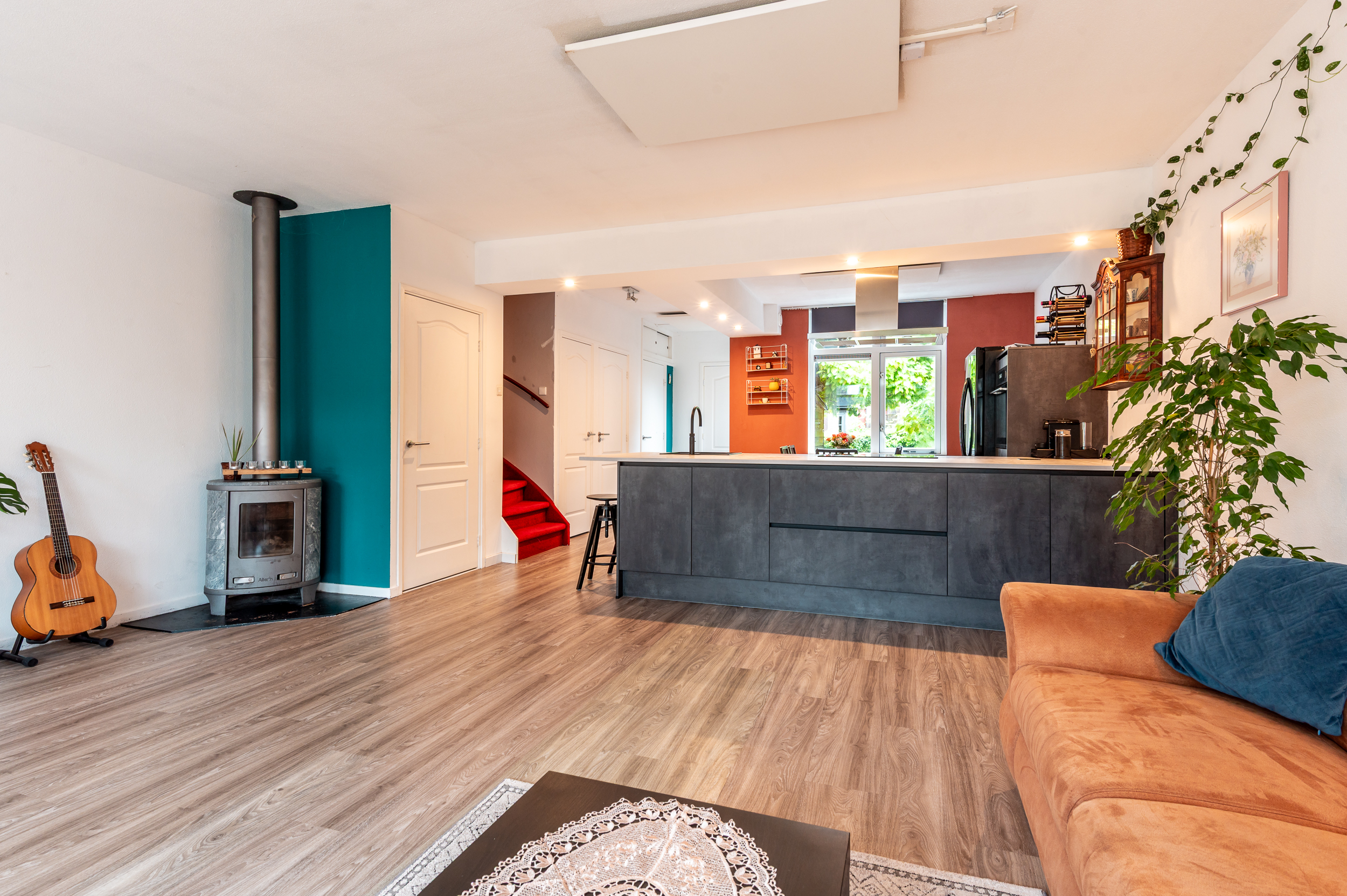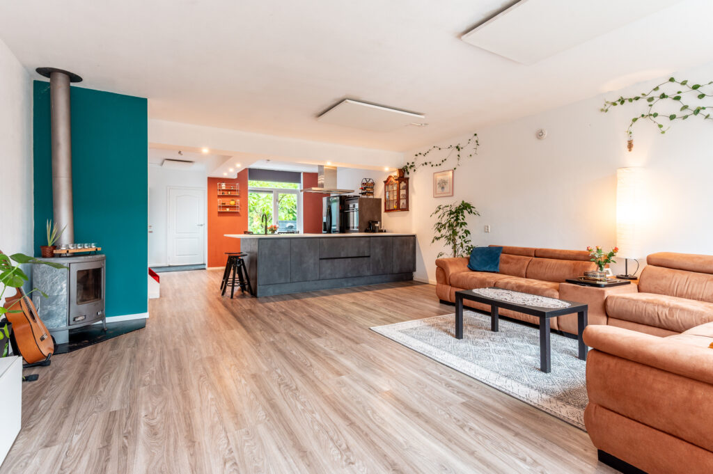 Bij binnenkomst valt direct de ruime en lichte woonkamer op, voorzien van een sfeervolle speksteen houtkachel – perfect voor gezellige avonden in de koudere maanden. De open, moderne keuken is uitgerust met diverse inbouwapparatuur en biedt volop ruimte om uitgebreid te koken en te tafelen.