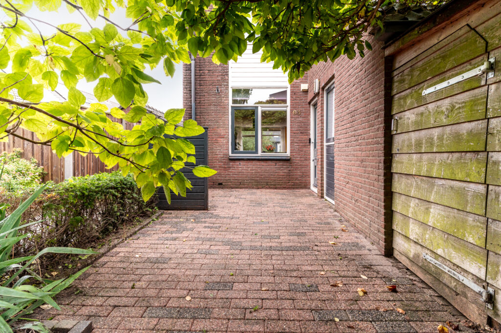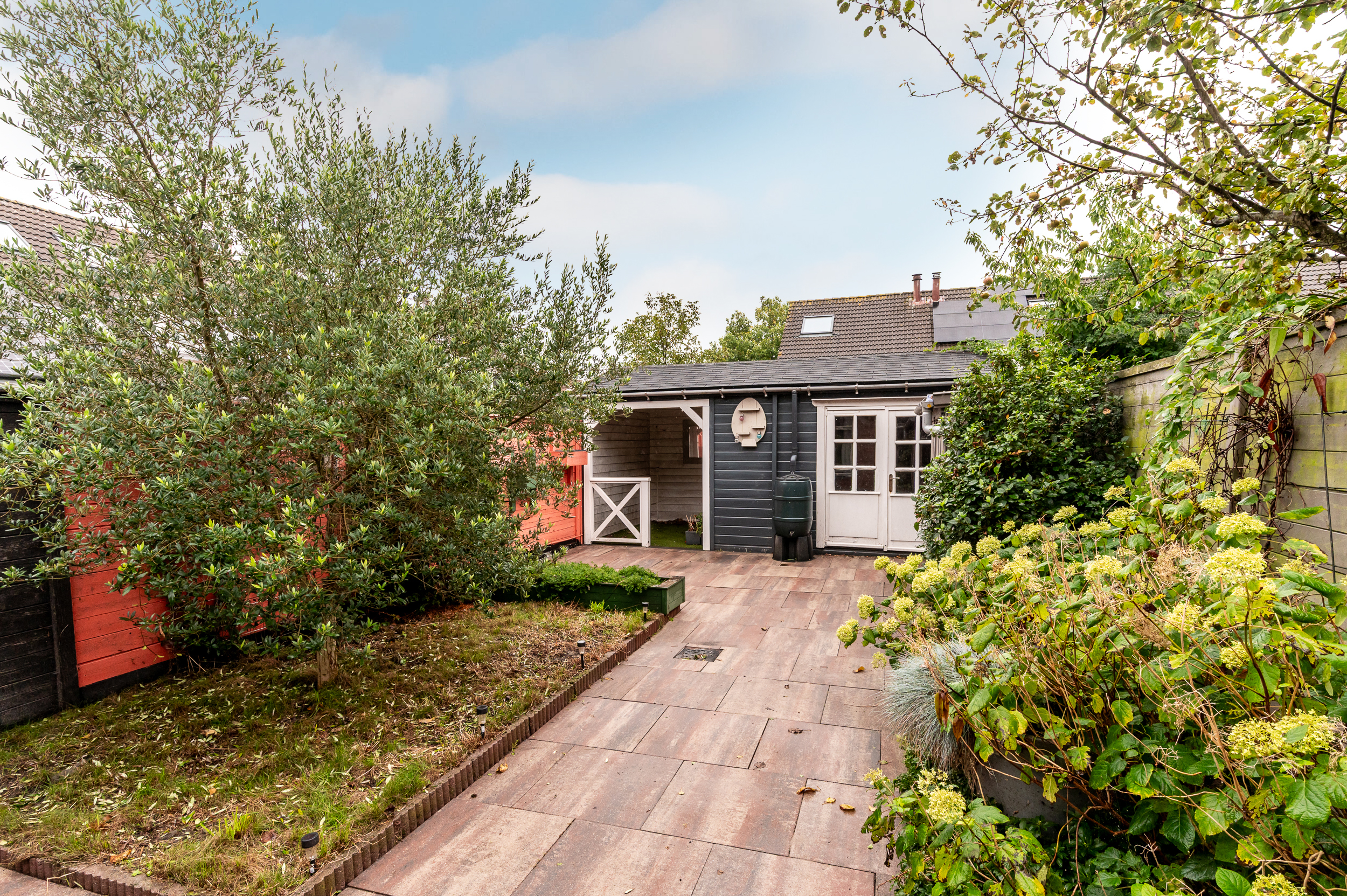De achtertuin (12 x 6 meter) is gelegen op het oosten, is deel betegeld en deels beplant. Achterop het perceel staat een vrijstaande houten berging (ca. 8 m²) met overkapping.