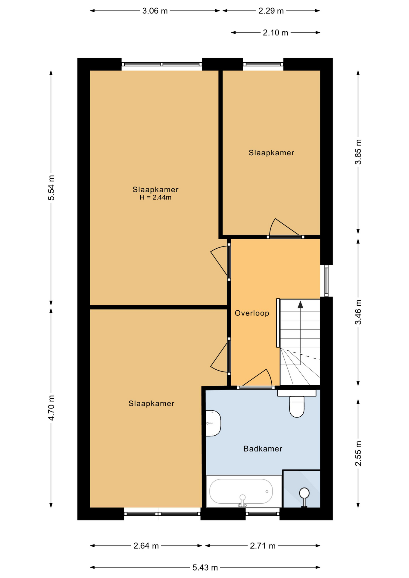 Overloop met toegang tot 3 ruime slaapkamers (ca. 17 / 13 / 9 m2). Keurige badkamer met een ligbad, douche, 2e toilet, wastafel, radiator en een raam voor de natuurlijke ventilatie. De verdieping is voorzien van een fraaie laminaatvloer (2018).