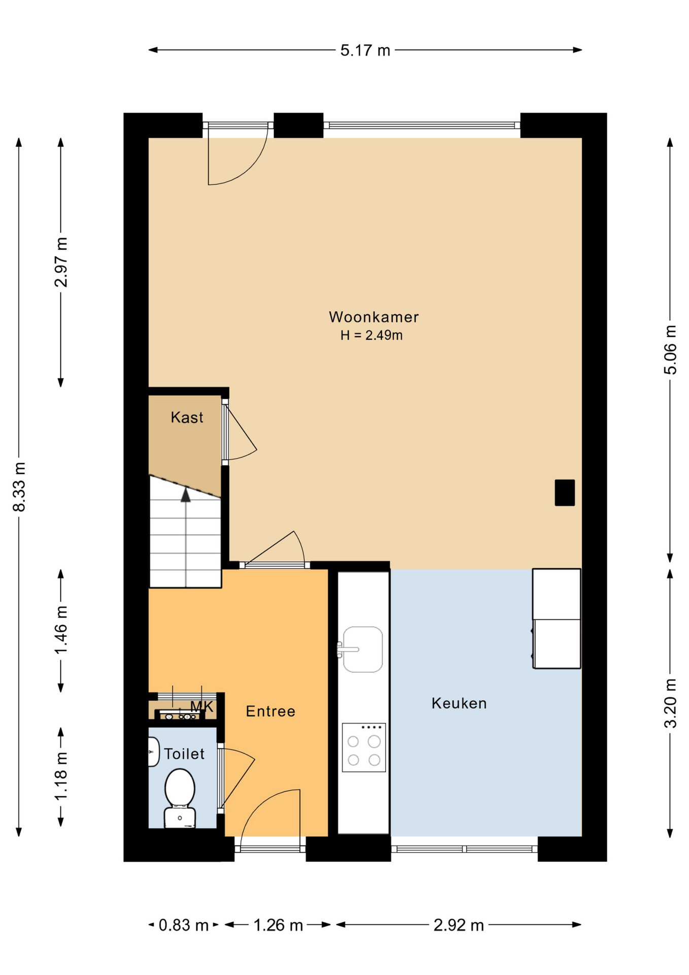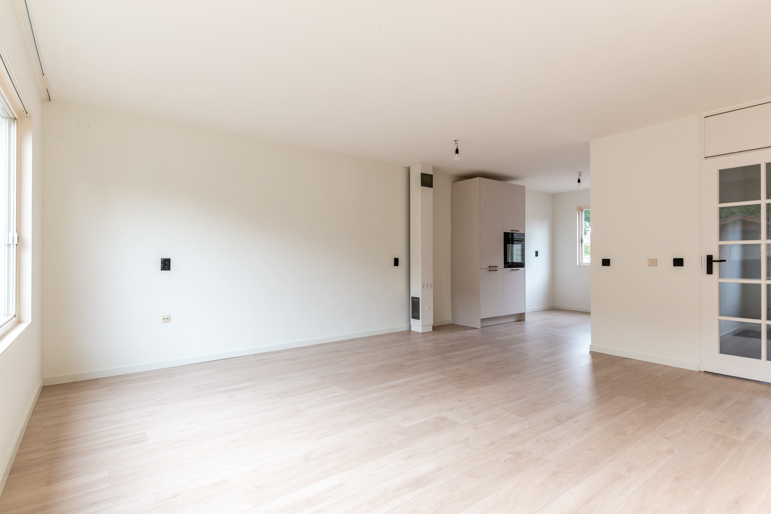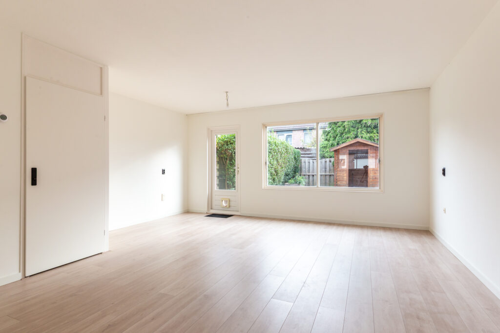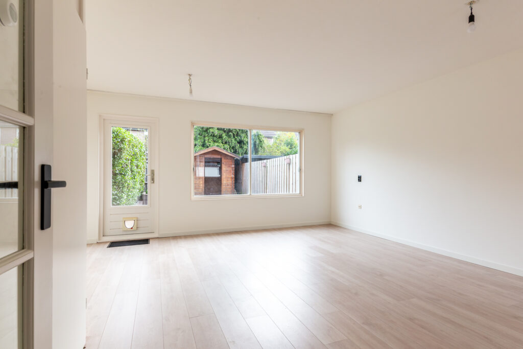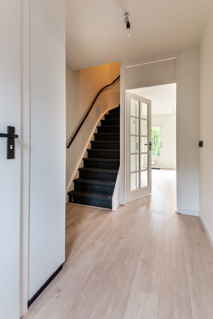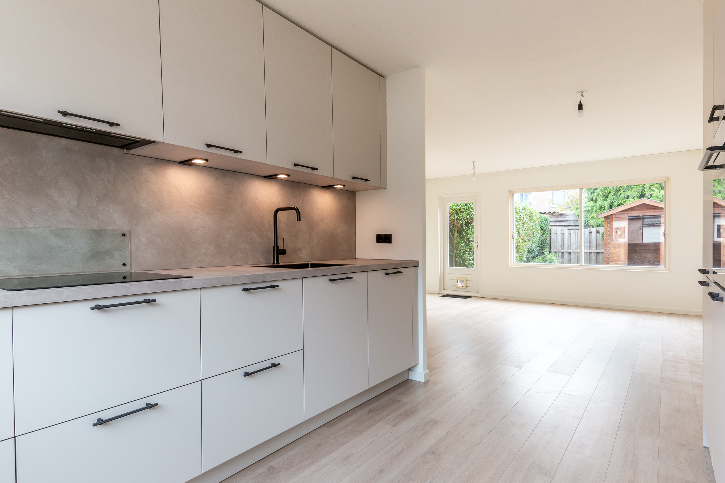 Entree/hal met de toiletruimte, meterkast, garderobe, trapopgang naar de verdieping en toegang naar de woonkamer. Ruime tuingerichte woonkamer (5.17 m. breed) met grote raampartijen, een trapkast en een deur naar de tuin. Aan de voorzijde bevindt zich de luxe inbouwkeuken (2025) in dubbele opstelling, welke voorzien is van de volgende apparatuur; koelkast, vriezer, vaatwasser, oven, 4-pits inductiekookplaat en een afzuigkap. Ruime opstelmogelijkheden voor een eettafel waar u heerlijk met uw familie kunt dineren. De begane grond is voorzien van strakke wandafwerking (2025) en een fraaie laminaatvloer (2025).