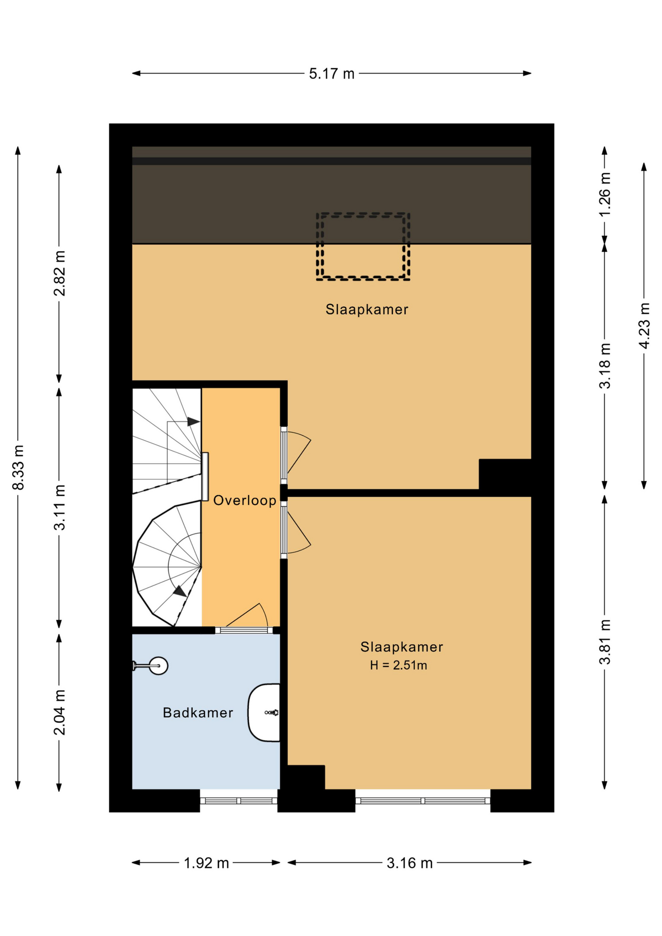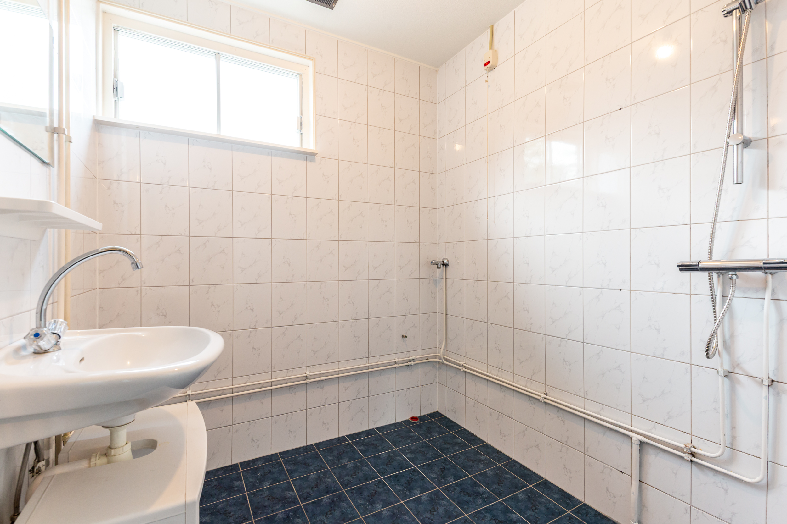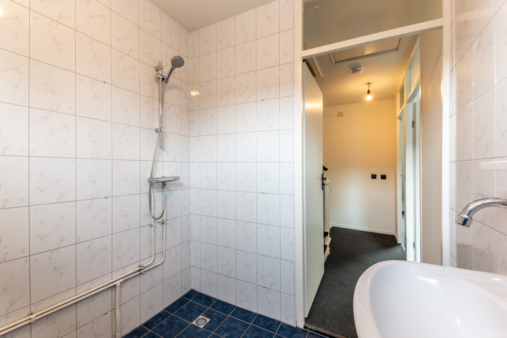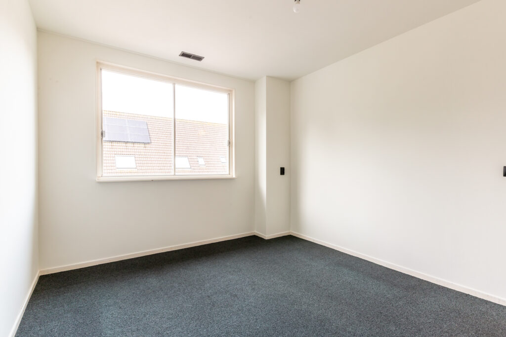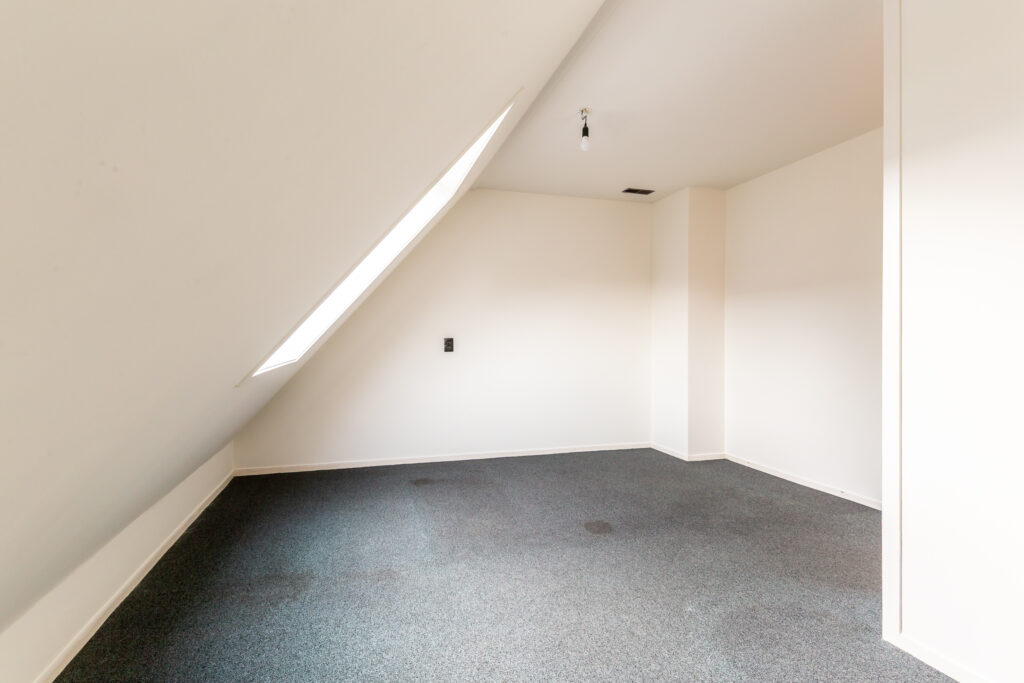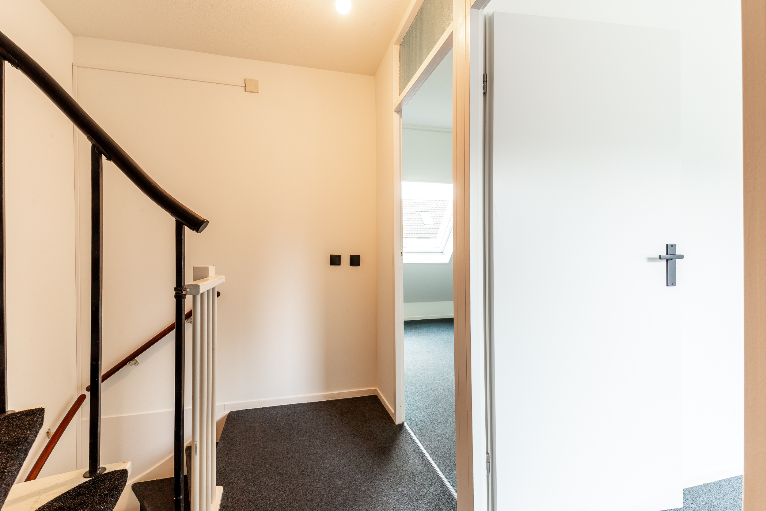 Overloop met toegang tot 2 (mogelijkheden voor 3) ruime slaapkamers (ca. 14 en 12 m2), waarbij de ouderslaapkamer over de volle breedte van de woning. Volledig betegelde badkamer met een douche, wastafel en een raam voor de natuurlijke ventilatie. De verdieping is voorzien van strakke wandafwerking (2025) en antracieten vloerbedekking.
